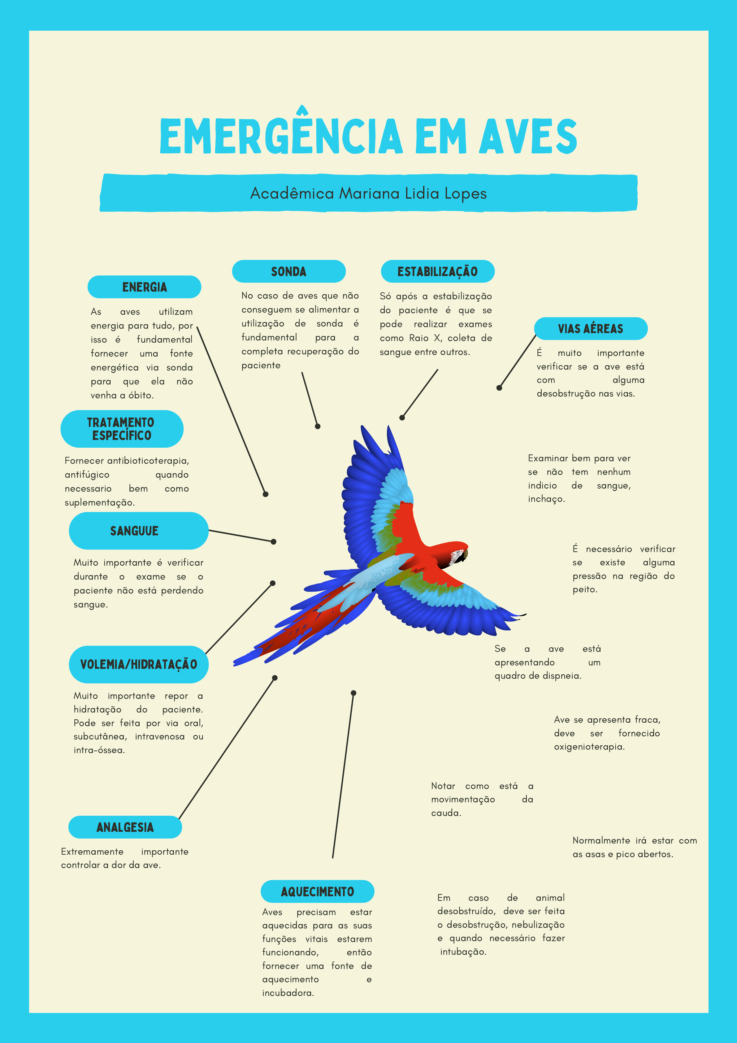 Em caso de animal desobstruído, deve ser feita o desobstrução, nebulização e quando necessário fazer intubação. Extremamente importante controlar a dor da ave. analgesia Se a ave está apresentando um quadro de dispneia. emergência em aves Acadêmica Mariana Lidia Lopes volemia/hidratação sanguue energia sonda estabilização Vias aéreas aquecimento Muito importante é verificar durante o exame se o paciente não está perdendo sangue. Aves precisam estar aquecidas para as suas funções vitais estarem funcionando, então fornecer uma fonte de aquecimento e incubadora. É necessário verificar se existe alguma pressão na região do peito. Examinar bem para ver se não tem nenhum indicio de sangue, inchaço. É muito importante verificar se a ave está com alguma desobstrução nas vias. As aves utilizam energia para tudo, por isso é fundamental fornecer uma fonte energética via sonda para que ela não venha a óbito. Muito importante repor a hidratação do paciente. Pode ser feita por via oral, subcutânea, intravenosa ou intra-óssea. tRAtamento específico Fornecer antibioticoterapia, antifúgico quando necessario bem como suplementação. Normalmente irá estar com as asas e pico abertos. Notar como está a movimentação da cauda. No caso de aves que não conseguem se alimentar a utilização de sonda é fundamental para a completa recuperação do paciente Só após a estabilização do paciente é que se pode realizar exames como Raio X, coleta de sangue entre outros. Ave se apresenta fraca, deve ser fornecido oxigenioterapia.