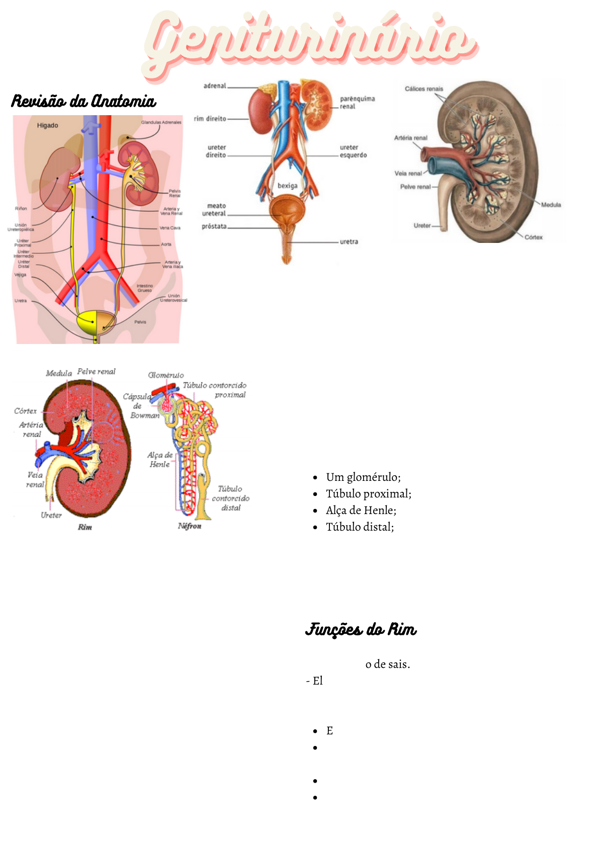 - Auxiliam na remoção de substâncias não mais desejáveis ao organismo. - Os rins interagem com outros sistemas orgânicos para auxiliar na regulação do fluído corporal, da concentração de eletrólitos do meio interno e finalmente para produzir urina. - Os rins estão situados no abdome e relacionam-se com o diafragma, sendo topograficamente e localizados entre a 12° vértebra torácica e a 3° lombar, cobertos pelo peritônio. - Cada rim mede aproximadamente 12x4 cm. - A urina é formada por um processo de filtração glomerular e manipulação por diversos segmentos tubulares e passa dos rins para os ureteres. - Cada ureter é composto de musculatura lisa e mede aproximadamente 30 cm de seu ponto de interseção até a base da bexiga. GeniturinárioGeniturinárioGeniturinário Revisão da Anatomia Um glomérulo; Túbulo proximal; Alça de Henle; Túbulo distal; Endógenas (bile). Exógenas (venenos, medicações). Eliminação do cálcio e fósforo. Ativação da vitamina D. - Formato peculiar, 115 a 175g e 12x6 cm. - Região retroperitoneal. - Nível de T12 até L3. - Direito mais baixo. - Glândula adrenal. - Hilo: artéria e nervos renais + veia renal e ureter. - Parênquima: córtex e medula. - Fluxo sanguíneo: 1200 ml/min. - Taxa de filtração glomerular: 110-125 ml/min. - 1 ml/min é excretado em urina. - Eliminação de 1,2 a 1,5 L/urina/dia. - Uretra Fem. 5 a 7,5 cm; Uretra Masc. 20 cm. - A unidade renal é o néfron que é composto de: - Diversos túbulos distais drenam para um túbulo coletor. - Dos túbulos coletores, a urina flui para a pelve do rim que drena para os ureteres e para bexiga. Funções do Rim - Regular o volume de líquidos no organismo e a concentração de sais. - Eliminação de produtos do metabolismo. - Regulação de íons importantes para o organismo. - Eliminação de toxinas: - Regulação do metabolismo do cálcio e do osso. - Produção de eritropoetina. - Produção de renina e outros hormônios. Volume normal 150 a 200 ml. 600 a 1000 ml. Contração da bexiga. Relaxamento esfincter. Músculos do assoalho pélvico. Ex: DM, esclerose, plegias, TRM, AVE... Bexiga - A bexiga urinária possui musculatura lisa e está localizada atrás da sínfise púbica. - A bexiga contém um esfíncter interno o qual relaxa quando está cheia. - Quando o volume urinário alcança cerca de 300 mL há moderada distensão; acima de 450 mL ocorre desconforto. - Durante a micção, a urina deixa a bexiga. - Capacidade: - Micção: - Controle voluntário: continência. - Impulsos enviados ao cérebro por meio da áreas toracolombar (T11 a L2) e sacral (S2 a S4) da medula espinhal. - Bexiga distendida: estimula receptores de estiramento + medula espinhal sacral + cérebro. - Tempo inadequado: impulsos inibitórios do cérebro + medula toracolombar e sacral. - Músculo detrusor (bexiga) e esfíncter: contração ou não. - Doenças, traumatismos ou medicamentos/produtos que afetam o cérebro, medula espinhal ou nervos que estimulam a bexiga, esfíncteres ou assoalho alteram a função da bexiga ou micção. - Outras alterações patológicas incluem obstrução ou falha renal. - Fatores ambientais e psicológicos também alteram. Genitália Masculina - Pênis, testículos, epidídimos, ductos deferentes, bolsa escrotal, vesículas seminal e próstata. - Pênis: órgão excretor final e da urina e excitação sexual. - Testículos: produção de espermatozoides e secreção de hormônios. - Epidídimos: em formato de vírgula, armazenam, maturam e transportam o esperma dos testículos para o ducto deferente, que transporta o esperma, na ejaculação, até a uretra. - Saco escrotal: bolsa frouxa em que estão contidos testículos e epidídimo. - Próstata: glândula que produz a maior parte do sêmen. - Pênis: raiz, corpo e glande. Prepúcio e glândulas de Tyson (esmegma) Genitália Feminina Externa Genitália Feminina Interna Anamnese - Localização: Onde se situa? Apresenta irradiação? - Qualidade: Quais suas características? - Quantidade ou gravidade: Quanto incomoda? No caso de dor use a escala de 0-10. - Cronologia: Em que momento se inicia? Quanto tempo dura? Qual a frequência? - Situação em que ocorre: Inclua fatores ambientais, atividades pessoais, reações emocionais ou outras circunstâncias que possam contribuir para a enfermidade. Dados de identificação Hábitos diários Antecedentes pessoais e familiares Tratamentos anteriores Manifestações clínicas atuais - Fatores de remissão ou exarcebação: Existe algo que piora ou melhora o sintoma? - Manifestações associadas: Percebeu alguma outra mudança que acompanha o sintoma? Sistema PQRST - Fatores Provocadores e Paliativos - Qualidade - Região e Radiação - Severidade - Tempo, Tratamento Anamnese Perguntas Gerais - Pergunta mais geral. - Porque veio procurar atendimento em saúde? - Como você está se sentindo? Tem alguma queixa? Perguntas Específicas - Você tem alguma dificuldade para urinar? - Com que frequência você urina? - Tem que se levantar a noite para urinar? Quantas vezes? - Qual o volume e urina eliminada durante a noite? - Sente alguma dor ou ardência ao urinar? - Alguma vez já teve dificuldade em chegar a tempo no banheiro? - Já houve vazamento de urina? - Urinou de fome involuntária? - Você percebe quando a bexiga está cheia e quando ocorrer a micção? - Tem alguma alteração na cor ou no odor da urina? Qual é a cor? - A tosse súbita, espirros ou risos provocam perda de urina? - Tem dificuldade em começar a urinar? - Teve alteração na forma ou no tamanho no seu jato urinário ou no esforço que precisa fazer para urinar? - Hesita ou interrompe a micção no meio? - Há gotejamento de urina depois de acabar de urinar? - Prurido ao urinar? No órgão? No corpo/pele? - Dor nas costas do lado direito ou esquerdo? - Dor nas costas que se irradia para baixo ventre e segue Normal: losangular. Alterado: triangular (hipogonadismo, produção excessiva de hormôn