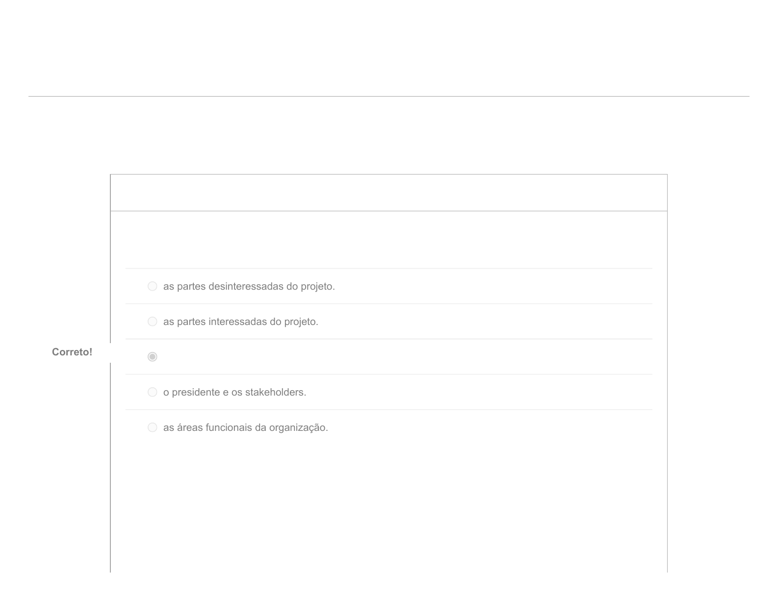 22/09/2021 17:07 DÉBORA CRISTYNA ROSA, histórico de teste: Avaliação Geral da Disciplina https://cruzeirodosul.instructure.com/courses/19132/quizzes/53914/history?version=3 1/22 Avaliação Geral da Disciplina Resultados para DÉBORA CRISTYNA ROSA Pontuação desta tentativa: 9 de 9 Enviado 30 ago em 17:45 Esta tentativa levou 13 minutos. 0,45 / 0,45 ptsPergunta 1 O escritório de gerenciamento de projetos (EGP) é a ligação natural entre: as partes desinteressadas do projeto. as partes interessadas do projeto. os portfólios, programas e projetos e os sistemas de medição da organização. Correto!Correto! o presidente e os stakeholders. as áreas funcionais da organização. 22/09/2021 17:07 DÉBORA CRISTYNA ROSA, histórico de teste: Avaliação Geral da Disciplina https://cruzeirodosul.instructure.com/courses/19132/quizzes/53914/history?version=3 2/22 O escritório de gerenciamento de projetos pode ter responsabilidade por toda a organização. Pode desempenhar um papel no apoio ao alinhamento estratégico e gerar valor organizacional. O EGP integra dados e informações de projetos estratégicos organizacionais e avalia como os objetivos estratégicos de níveis mais altos são alcançados. O EGP é a ligação natural entre os portfólios, programas e projetos e os sistemas de medição da organização. 0,45 / 0,45 ptsPergunta 2 Dentre as principais funções de um Escritório de Gerenciamento de Projetos (EGP), está o de: gerenciar recursos compartilhados em todos os projetos administrados pelo egp. Correto!Correto! implantar um sistema de gerenciamento de projetos. comprar matérias primas mais baratas. controlar abusos de poder. fiscalizar possíveis fraudes. 22/09/2021 17:07 DÉBORA CRISTYNA ROSA, histórico de teste: Avaliação Geral da Disciplina https://cruzeirodosul.instructure.com/courses/19132/quizzes/53914/history?version=3 3/22 A principal função de um EGP é a de apoiar os gerentes de projetos de diversas formas, que podem incluir, mas não estão limitadas a: Gerenciar recursos compartilhados em todos os projetos administrados pelo EGP; Identificar e desenvolver metodologia, práticas recomendadas e padrões de gerenciamento de projetos; Orientar, aconselhar, treinar e supervisionar; Monitoramento da conformidade com padrões, políticas, procedimentos e modelos de gerenciamento de projetos por meio de auditorias; Desenvolvimento e gerenciamento de políticas, procedimentos, modelos e outros documentos compartilhados do projeto (ativos de processos organizacionais); e Coordenar as comunicações entre projetos. 0,45 / 0,45 ptsPergunta 3 O sucesso de um escritório de gerenciamento de projetos (EGP) depende: somente do interesse e da dedicação das pessoas dos departamentos. da força e do poder que a direção da empresa fornecerá ao grupo responsável pela nova estrutura e a sua participação no direcionamento estratégico. Correto!Correto! 22/09/2021 17:07 DÉBORA CRISTYNA ROSA, histórico de teste: Avaliação Geral da Disciplina https://cruzeirodosul.instructure.com/courses/19132/quizzes/53914/history?version=3 4/22 se os interesses políticos serão atendidos. dos interesses dos stakeholders. dos interesses dos acionistas. A realidade é que o sucesso do PMO depende da força e do poder que a direção da empresa fornecerá a esse grupo. Assim, o apoio da alta direção e uma cultura de implementação de “cima para baixo” é crucial para o sucesso da nova estrutura criada. Além disso, esse grupo não pode ser encarado somente como um centro administrativo de projetos para a criação de orçamentos e cronogramas (muito comum em grandes projetos de engenharia), deve participar diretamente da estratégia da empresa, realizando o monitoramento e controle do portfólio de projetos da organização. 0,45 / 0,45 ptsPergunta 4 À medida que a organização atinge níveis mais elevados de maturidade, o escritório de gerenciamento de projeto assume: o controle da organização. os riscos do negócio. mais responsabilidade nos níveis corporativos. Correto!Correto! 22/09/2021 17:07 DÉBORA CRISTYNA ROSA, histórico de teste: Avaliação Geral da Disciplina https://cruzeirodosul.instructure.com/courses/19132/quizzes/53914/history?version=3 5/22 a responsabilidade de gerar receita para a organização o passivo da organização. Em diferentes níveis de maturidade, o escritório de projetos (EGP) também tem diferentes funções e áreas de influência. Essa é uma maneira de caracterizar as áreas de ênfase para o (EGP). À medida que a organização atinge níveis mais elevados de maturidade, o EGP assume mais responsabilidade nos níveis corporativos. 0,45 / 0,45 ptsPergunta 5 Analise os pontos a seguir: • Acreditar que implementar um escritório de projetos é instalar um software. • Não buscar apoio dos alto-executivos, acreditando ser esse um trabalho meramente técnico. • Implantar visando criar um ambiente de fiscalização, e não um ambiente de colaboração. • Seguir a “moda”, ou seja, o que “todo mundo” está fazendo e querer implementar a solução em todas as áreas de uma vez. Esses elementos são: princípios de sucesso na implementação de um EGP. regras de ouro para o sucesso na implementação de um EGP. metas a serem perseguidas. dicas para se alcançar a longo prazo. 22/09/2021 17:07 DÉBORA CRISTYNA ROSA, histórico de teste: Avaliação Geral da Disciplina https://cruzeirodosul.instructure.com/courses/19132/quizzes/53914/history?version=3 6/22 erros mais comuns na implementação de um escritório de gerenciamento de projetos (EGP). Correto!Correto! Os erros mais comuns na implementação ocorrem pelos seguintes motivos: 1) Acreditar que implementar um escritório de projetos é instalar um software; 2) Não buscar apoio dos alto-executivos, acreditando ser esse um trabalho meramente técnico; 3) Implantar visando a criar um ambiente de fiscalização, e não um ambiente de colaboração; 4) Seguir a “moda”,