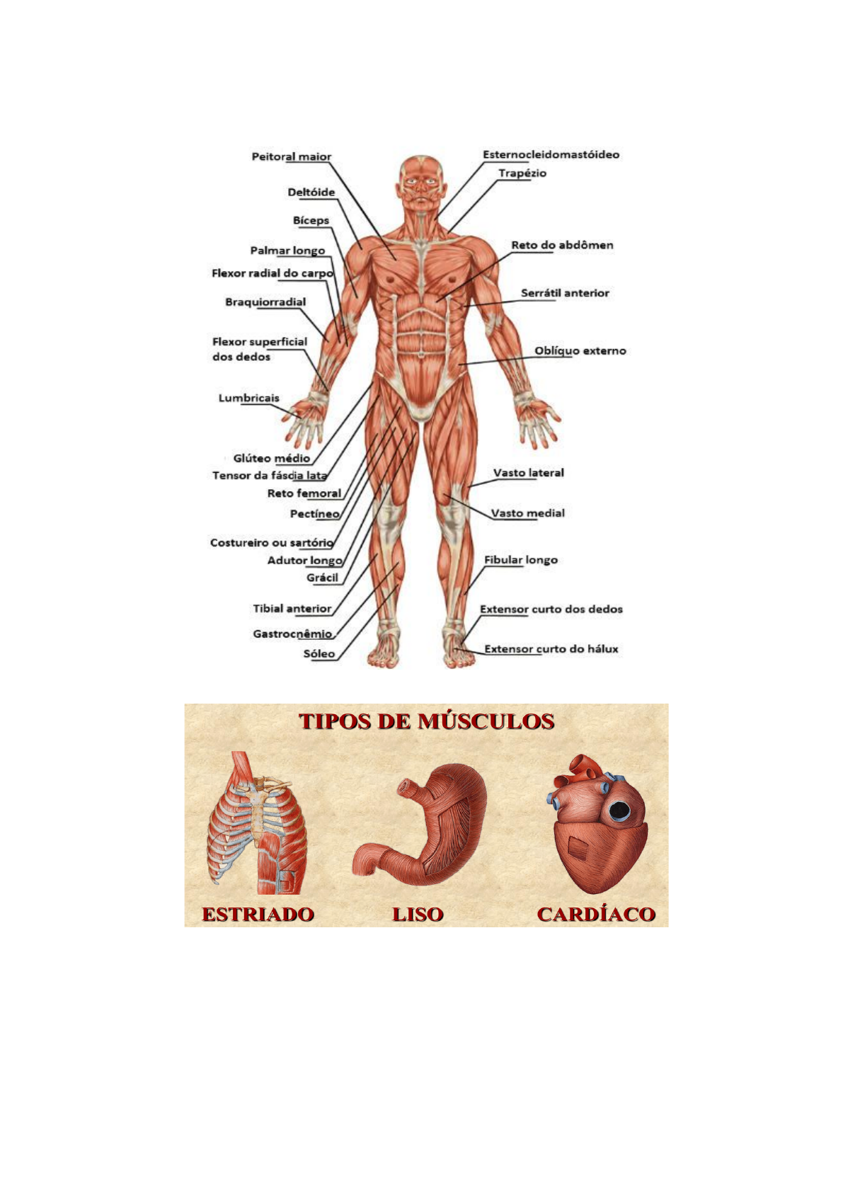 Letícia Kariny Teles Deusdará / Odontologia UFPE Múscul� ❖ Músculos estriados esqueléticos ➔ Elementos ativos do aparelho locomotor, já que movimentam as peças ósseas do esqueleto ao redor das articulações. ➔ Constituição: Tendões e Ventre Letícia Kariny Teles Deusdará / Odontologia UFPE ➢ Tendões: •Extremidades do músculo; •Inextensíveis, resistentes, esbranquiçados e constituídos de colágeno; •Parte inativa do músculo •Considerando a posição anatômica: -Cabeça do músculo: Mais proximal -Cauda do músculo: Mais distal •Considerando o movimento exercido: -Tendão de origem: PONTO FIXO, extremidade presa à peça óssea que não se move. -Tendão de inserção: PONTO MÓVEL, extremidade presa à peça óssea que se move. *Tendão: osso-músculo *Ligamento: osso-osso ➢ Ventre: • Parte média do músculo • Parte ativa e contrátil do músculo ★ O músculo é formado por FIBRAS MUSCULARES, que são envolvidas pelo ENDOMÍSIO. ★ O conjunto de fibras forma um FEIXE MUSCULAR, que são envolvidos pelo PERIMÍSIO. ★ O conjunto de feixes forma o VENTRE (ou corpo) MUSCULAR, que é envolvido pelo EPIMÍSIO. Letícia Kariny Teles Deusdará / Odontologia UFPE ★ MIÔNIO: menor feixe de fibras identificado macroscopicamente e é classificado como unidade funcional do tecido muscular. ★ A classificação dos tendões é permutável, ou seja, dependendo do movimento desenvolvido o tendão mais proximal pode ser considerado como tendão de inserção e não de origem. ★ Aponeurose -É uma estrutura formada por tecido conjuntivo. -Membrana que envolve grupos musculares. -Geralmente apresenta-se em forma de lâminas ou em leques. ❖ Classificação dos músculos estriados esqueléticos: ➔ Quanto à forma: ➢ Músculos longos: •Comprimento excede a largura e a espessura; • Encontrados a nível dos membros; •Dividem-se em: cônicos, fusiformes e cilíndricos; -Ex: M. sartório, M. esternocleidomastóideo. ➢ Músculos largos: Letícia Kariny Teles Deusdará / Odontologia UFPE •Comprimento e largura se equivalem e excedem a espessura; •Encontrados recobrindo as cavidades naturais (Cavidades abdominal, pélvica e craniana); •Dividem-se em: triangulares, quadrangulares e romboides; -Ex: M. glúteo máximo, M. reto do abdômen ➢ Músculos curtos: • Comprimento, largura e espessura se equivalem; •Encontrados em locais onde há a necessidade de grande força (aparelho mastigador, ao longo da coluna vertebral); -Ex: M. masseter. ➢ Músculos circulares: •Encontrados ao redor dos orifícios e canais naturais, como a cavidade oral, cavidade orbitária, cavidade anal, etc… •Dividem-se em: -ORBITÁRIOS: Possuem a função de proteger cavidades. -ESFINCTERIANOS: Abrem e fecham diretamente as cavidades, controlando o grau de abertura de determinado orifício. ➢ Músculos intermediários: Letícia Kariny Teles Deusdará / Odontologia UFPE •Encontrados em vários locais, por isso a classificação é difícil. -Ex: Certos músculos do dorso ❖ Quanto ao número de cabeças: CEPS ➢ Monóceps: Músculos que só possuem uma cabeça; -M. sartório ➢ Bíceps: Músculos que possuem 2 cabeças; -M. bíceps braquial. ➢ Tríceps: Músculos que possuem 3 cabeças; -M. tríceps braquial. ➢ Quadríceps: Músculos que possuem 4 cabeças; -M. quadríceps femoral. ❖ Quanto ao número de ventres: GASTER ➢ Monogástrico: Músculos que apresentam apenas 1 ventre; ocorre na maioria dos músculos esqueléticos. Ex: M. Sartório. Letícia Kariny Teles Deusdará / Odontologia UFPE ➢ Digástrico: Músculos que apresentam 2 ventres; há o tendão intermediário (dispositivo tendíneo que separa os ventres). Ex: M.digástrico. ➢ Poligástrico: Músculos que apresentam 3 ou mais ventres; há mais de 1 tendão intermediário. Ex: M. reto do abdômen. ❖ Quanto ao número de caudas: ➢ Monocaudado: Músculos que possuem apenas uma cauda; ocorre na maioria dos músculos esqueléticos. Ex: M. sartório. ➢ Multicaudado: Músculos que possuem 2 ou mais caudas; o tendão de inserção divide-se em dois, três, quatro ou mais elementos tendilíneos sendo cada inserção independente. Ex: M. flexor superficial dos dedo ❖ Quanto à inserção: ➢ Esqueléticos: se fixam nos ossos • Podem ser articulares (se fixam especificamente nas articulações) Cutâneos: se fixam na pele Letícia Kariny Teles Deusdará / Odontologia UFPE ❖ Quanto à topografia: ➢ Axiais: Relacionados com a porção axial do esqueleto; ➢ Apendiculares: Relacionados com a porção apendicular do esqueleto; ❖ Quanto à função: ➔ Flexores; ➔ Extensores; ➔ Adutores; ➔ Abdutores; ➔ Pronadores; ➔ Supinadores; ❖ Quanto ao movimento produzido por um músculo ou grupos musculares: ➢ Agônicos: São aqueles que PRODUZEM O MOVIMENTO. Ex: Músculos flexores dos dedos; ➢ Antagônicos: São aqueles que se OPÕEM AO MOVIMENTO produzido pelos músculos agônicos. Ex: Músculos extensores dos dedos; Letícia Kariny Teles Deusdará / Odontologia UFPE ➢ Fixadores: São aqueles músculos que antecedem a articulação que está sendo movimentada. Ex: Músculos do braço fixam o cotovelo, permitindo a ação dos agonistas na flexão e dos antagonistas na extensão dos dedos; ➢ Sinergistas: São tipos de músculos fixadores, mas fixam especificamente a articulação que está sendo atravessada pelo agonista. Servem para evitar movimentos desnecessários. Ex: Músculos extensores do carpo fixam a mão mantendo-a no mesmo plano do antebraço, para o funcionamento adequado dos músculos flexores dos dedos; ❖ Nomenclatura dos músculos esqueléticos: ➔ Forma: forma geométrica do músculos. Ex: m. deltoide. ➔ Situação: região do corpo onde está situado. Ex: m. temporal. ➔ Função: função que o músculo desempenha. Ex: m. flexor dos dedos. ➔ Direção: direção das fibras musculares. Ex: m. reto do abdome. ➔ Estrutura: do músculo. Ex: semi-me