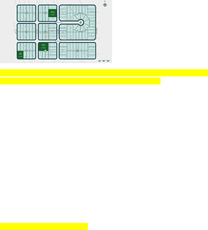 UA 8 Desenhos geométricos em área urbana utilizando a plataforma CAD Exercícios: D C A E B 1. A figura a seguir ilustra um estudo preliminar de parcelamento do solo urbano idealizado para uma cidade localizada abaixo do Trópico de Capricórnio (zona temperada sul). Com base na figura apresentada, é incorreto apenas o que se afirma em: D. Os lotes possuem algumas áreas bem distintas, de acordo com a quadra em que estão locados, principalmente os que estão dispostos nas quadras A, C e E. 2. Um terreno ondulado, recortado por linhas de drenagem em padrão dendrítico, será ocupado por um loteamento. Para esse projeto de urbanização, pretende-se adotar um traçado com quadras regulares, com geometria ortogonal e lotes retangulares, dentro de um dimensionamento que se deve ater estritamente aos mínimos exigidos em lei e não deve promover terraplenagem corretiva de quadra ou de reversão de declividades de vias em relação ao perfil do terreno natural. Assumidos esses pressupostos no projeto serão encontradas maiores dificuldades de solução para: *Padrão de drenagem dendrítico: padrão de forma arborescente, ou que lembra as nervuras de uma folha vegetal. Típico de áreas cobertas por rochas horizontais, não fraturadas e isotrópica em relação à erosão pluvial e fluvial. Constitui um padrão em que os talvegues têm variados comprimentos e não possuem nenhuma orientação preferencial ou uma organização sistemática. É típico de rochas sedimentares horizontais, podendo também ocorrer em rochas de baixo grau metamórfico (ardósias e filitos) horizontais ou sub-horizontais. Pode também ocorrer em alguns derrames de lavas ou de sedimentos de origem vulcânica. Etimologia: Vem do grego dendros, que significa árvore. C. O traçado das redes por gravidade. 3. (CESPE - 2010 - Caixa - Arquiteto) Ainda que em urbanismo toda pesquisa tenha como meta uma aplicação prática, a construção de modelos surgiu da necessidade de uma compreensão profunda do fenômeno urbano. O modelo, que se baseia na teoria, tem como objetivo possibilitar uma compreensão melhor do comportamento dos sistemas urbanos, em situações impossíveis de serem experimentadas no mundo real. O conjunto de dados resultante - a base de dados - é a reunião de diferentes pontos de vista sobre o mundo real, ou seja, é uma representação do conhecimento sobre o mundo real em determinado momento, ou momentos, e sob determinado ponto de vista. Por sua vez, os SIG podem ser considerados modelos de sistemas do mundo real. Além de cumprir as funções dos modelos convencionais (mapas, maquetes, arquivos), esses modelos acrescentam novos horizontes às atividades de análise, de planejamento, de projeto e de gestão. O termo modelo conceitual se refere a um conjunto de relações e de informações usadas para dar significado a uma representação do ambiente percebido. Quando se tomam decisões sobre esse ambiente, usa-se como referência esse modelo conceitual, que é mais simples que a realidade, pois se baseia em informações pré-selecionadas como relevantes para nossos propósitos. Tendo o texto acima como referência inicial, assinale a opção correta. A. a) O uso de um modelo tem a vantagem de permitir testar e avaliar um sistema em situações que, devido a razões técnicas, econômicas e/ou políticas, não é passível de ser experimentado ou construído no mundo real. 4. O desenho urbano adotou, desde muito cedo, os princípios da geometria para sua distribuição. Traçados ortogonais, radicais, lineares, espinha de peixe e mesmo circulares, estão entre os estudos urbanos dos principais planejadores urbanos da história. Diante dos traçados acima expostos, assinale a alternativa incorreta sobre a criação e a edição de desenhos urbanos através de desenhos geométricos e softwares CAD: E. e) O traçado circular é apenas uma via em círculo com todas as edificações no seu entorno. 5. Analisando-se três representações gráficas ou desenhos topográficos observa-se que as escalas utilizadas são respectivamente 1:500, 1:10.000 e 1:50.000. Marque a seguir a alternativa que corresponde à utilização correta dessas escalas. B. b) Planta de pequenos lotes e edifícios, planta de grandes propriedades rurais ou industriais, mapas de estados.