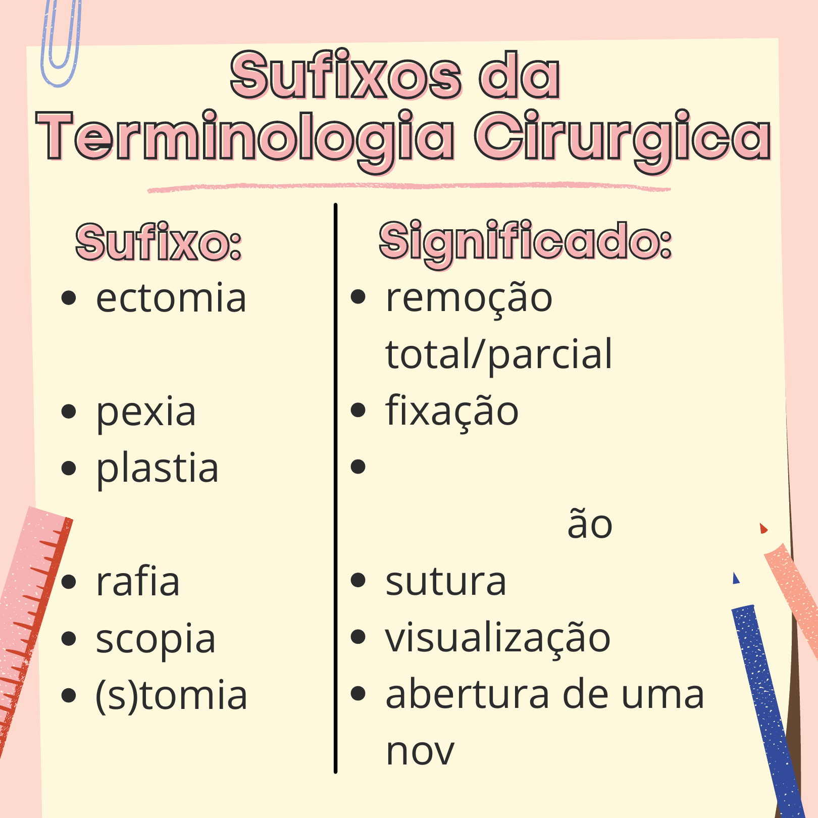 Sufixos daSufixos da Terminologia CirurgicaTerminologia Cirurgica ectomia pexia plastia rafia scopia (s)tomia Sufixo:Sufixo: Significado:Significado: remoção total/parcial fixação de um órgão alteração de forma e/ou função sutura visualização abertura de uma nova "boca"