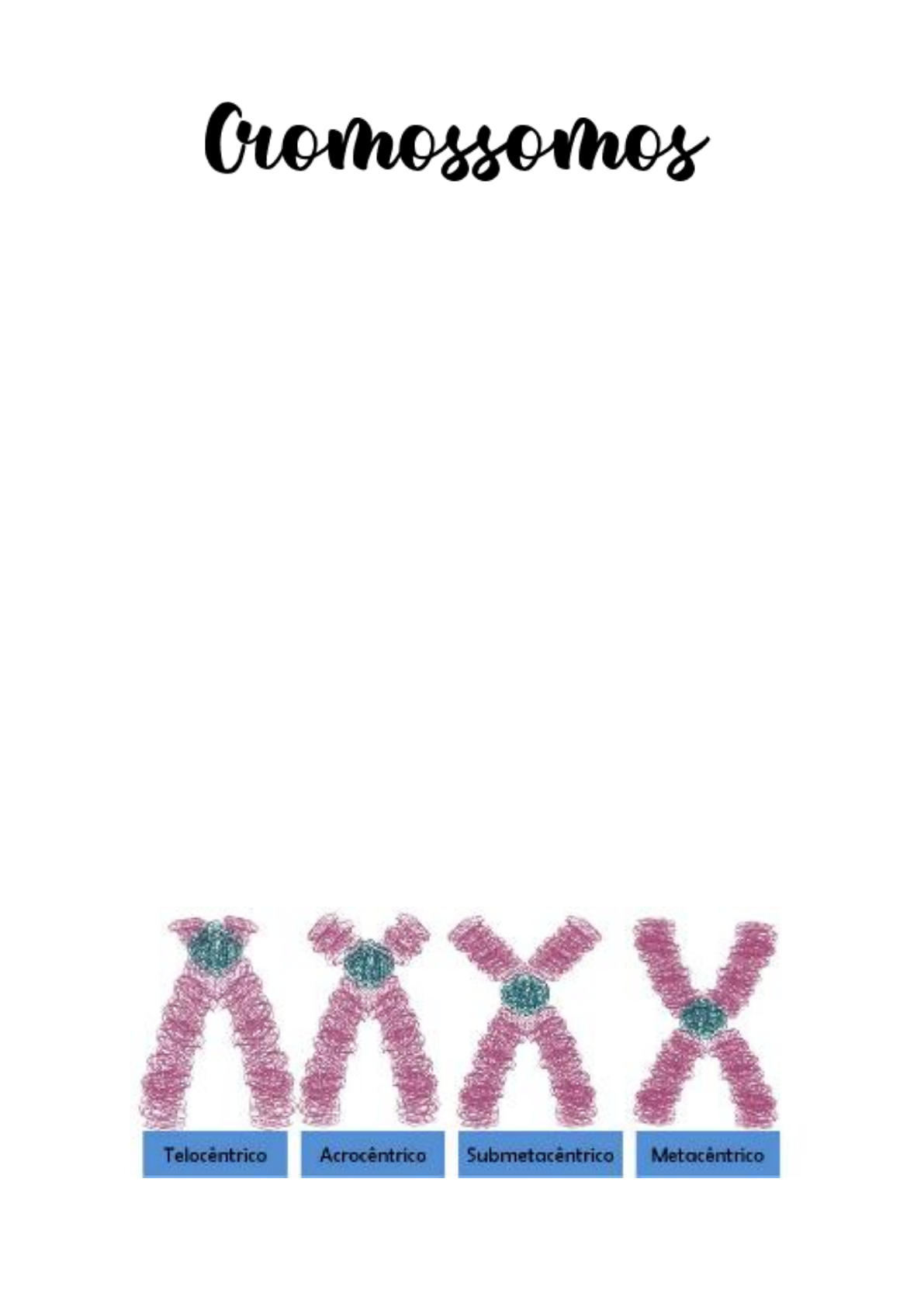 Tipos de Cromossomos A classificação dos cromossomos ocorre conforme a posição dos centrômeros. ● Metacêntrico: Centrômero em posição mediana. Os dois braços possuem o mesmo tamanho. ● Acrocêntrico: Centrômero próximo de um dos extremos do cromossomo. Um dos braços fica grande e o outro menor. ● Telocêntrico: Centrômero em uma das extremidades. O cromossomo apresenta um único braço; ● Submetacêntrico: Centrômero pouco deslocado da região mediana. Os braços ficam em tamanhos desiguais.