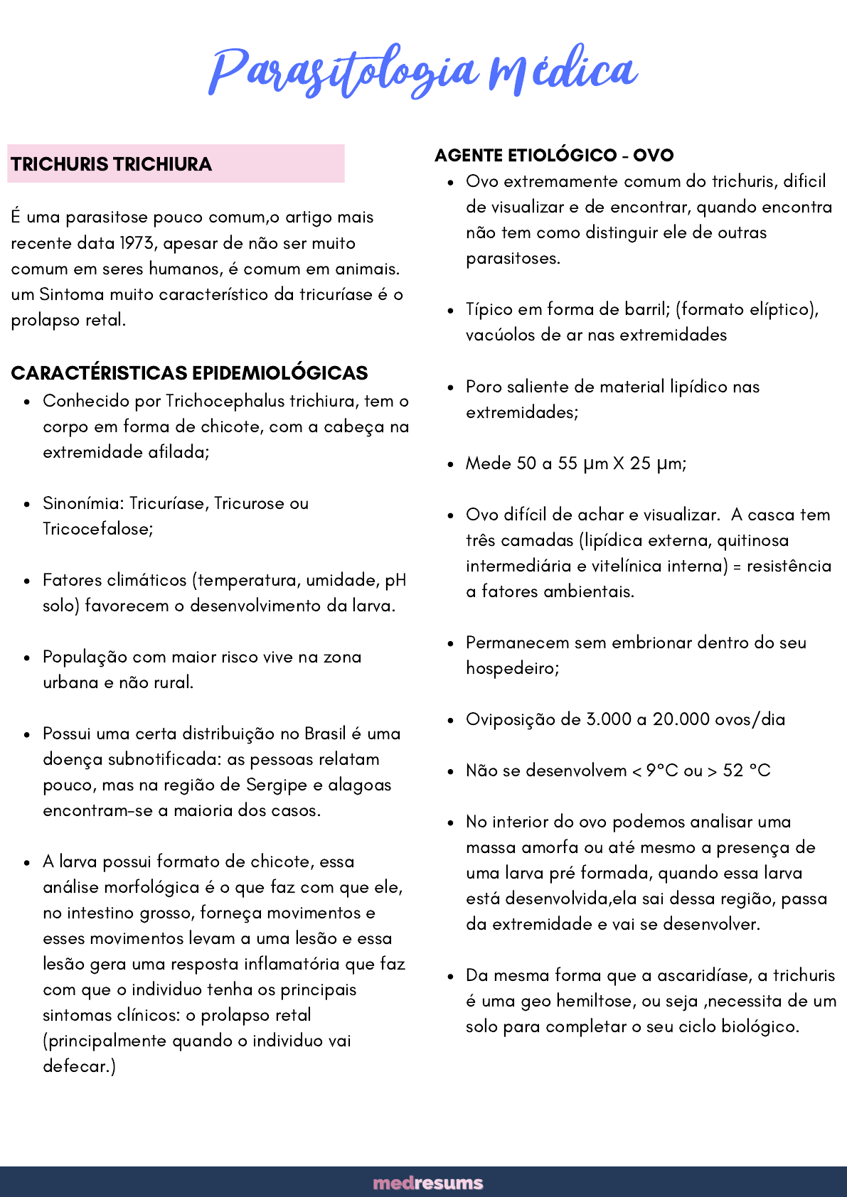 Parasitologia Médica Conhecido por Trichocephalus trichiura, tem o corpo em forma de chicote, com a cabeça na extremidade afilada; Sinonímia: Tricuríase, Tricurose ou Tricocefalose; Fatores climáticos (temperatura, umidade, pH solo) favorecem o desenvolvimento da larva. População com maior risco vive na zona urbana e não rural. Possui uma certa distribuição no Brasil é uma doença subnotificada: as pessoas relatam pouco, mas na região de Sergipe e alagoas encontram-se a maioria dos casos. A larva possui formato de chicote, essa análise morfológica é o que faz com que ele, no intestino grosso, forneça movimentos e esses movimentos levam a uma lesão e essa lesão gera uma resposta inflamatória que faz com que o individuo tenha os principais sintomas clínicos: o prolapso retal (principalmente quando o individuo vai defecar.) TRICHURIS TRICHIURA É uma parasitose pouco comum,o artigo mais recente data 1973, apesar de não ser muito comum em seres humanos, é comum em animais. um Sintoma muito característico da tricuríase é o prolapso retal. CARACTÉRISTICAS EPIDEMIOLÓGICAS Ovo extremamente comum do trichuris, dificil de visualizar e de encontrar, quando encontra não tem como distinguir ele de outras parasitoses. Típico em forma de barril; (formato elíptico), vacúolos de ar nas extremidades Poro saliente de material lipídico nas extremidades; Mede 50 a 55 µm X 25 µm; Ovo difícil de achar e visualizar. A casca tem três camadas (lipídica externa, quitinosa intermediária e vitelínica interna) = resistência a fatores ambientais. Permanecem sem embrionar dentro do seu hospedeiro; Oviposição de 3.000 a 20.000 ovos/dia Não se desenvolvem < 9°C ou > 52 °C No interior do ovo podemos analisar uma massa amorfa ou até mesmo a presença de uma larva pré formada, quando essa larva está desenvolvida,ela sai dessa região, passa da extremidade e vai se desenvolver. Da mesma forma que a ascaridíase, a trichuris é uma geo hemiltose, ou seja ,necessita de um solo para completar o seu ciclo biológico. AGENTE ETIOLÓGICO - OVO Medem de 3 a 5 cm de comprimento, machos menores que fêmeas; Extremidade anterior delgada e longa; Extremidade posterior mais robusta; Vivem no intestino grosso; São dioicos e com dimorfismo sexual; Macho = extremidade posterior curvada ventralmente, apresentando espiculo protegido por bainha; LARVA DESCRIÇÃO DA PARASITOSE - A parasitose é descrita em termos de infecção, quanto maior a presença de ovos nas fezes, mais intensa vai ser a infecção por essa parasitose. - Depende da idade do hospedeiro, estado nutricional e distribuição dos vermes adultos no intestino. - Presença de larva ou ovo na amostra de fezes, já é indicativo de se iniciar o tratamento, fora os sintomas clínicos. - Muito comum em crianças:60 a 70% dos casos . Intensidade da infecção é proporcional à gravidade dos sintomas. I. Infecções leves (< 1.000 ovos / g de fezes): assintomáticos ou sintomas leves; sintomas vão desde desconforto abdominal até diarreia, lembrando que a diarreia causada por um parasito é muco sanguinolenta, pastosa. II. Infecção moderada (De 1.000 a 9.999 ovos / g de fezes): graus variados de cefaleia, dor epigástrica e no baixo abdômen, diarreia, náuseas e vômitos; III. Infecção intensa (10.000 ovos/ g de fezes): síndrome disentérica crônica -> diarreia intermitente contendo muco e possivelmente sangue; dor abdominal; anemia(devido a perca de sangue nas fezes); desnutrição grave devido a ação espoliativa (peso e altura abaixo do aceitável); prolapso retal, baqueteamento digital(é caracterizado pelo inchaço da ponta dos dedos e alterações na unha, como alargamento da unha, aumento do ângulo entre as cutículas e a unha, curvatura para baixo da unha e amolecimento das unhas, que pode ser acompanhada ou não por vermelhidão local.) Insônia; Irritabilidade; Náuseas; Anorexia; Crises de urticária. COMPLICAÇÕES CLINÍCAS O comprometimento geral se traduz por: - O paciente pode apresentar um quadro de constipação abdominal, que faz com que o paciente no processo de defecação faça muita força pra eliminar as fezes e ter o que chamamos de prolapso retal(o reto sai pra fora) 10 a 15 cm de reto do lado de fora. - As manifestações digestivas mais frequentes são leves e vagas; caracterizam se por dor abdominal pouco intensa e diarreia intermitente alternada com quadro de constipação intestinal. - A infecção severa é caracterizada por diarreia crônica, disenteria, enterorragia, anemia e prolapso retal. - Os adultos de trichuris trichiura em infecções leves ou moderadas habitam o ceco e colo ascendente - A larva é macroscópica, só pode ser vista com auxílio de microscópio CICLO BIOLÓGICO Monoxênico - Tem um único hospedeiro, nesse caso o homem e os animais também podem ser colocados (ovelhas, porcos, ovinos, caprinos) - Muito semelhante à ascaridíase - O ser humano infectado libera os ovos embrionados no ambiente, esses ovos vão se desenvolver e dá origem ao embrião formando a larva L1 que vai evoluir para a larva L2,L3. L3(larva infectante) pode penetrar no indivíduo, como também pode haver a ingestão da larva pré formada. - No intestino grosso vai dá origem a uma larva rabditóide, depois a larva filarióide (larva infectante). - A larva pode eclodir no solo ou no interior do intestino do indivíduo, quando a larva eclode libera a larva rabditóide L1 que vai se desenvolver a larva infectante até o estado de maturação. Ingestão de ovos larvados, procedentes do solo, água ou alimentos contaminados com fezes humanas. África, Índia e América Latina (alta prevalência) -> Geofagia (crianças e mulheres grávidas) Importante a higienização dos alimentos MODO DE TRANSMISSÃO Diagnóstico clínico: não é específico, devendo ser complementado pelo laboratorial, feito com base nos sintomas que o paciente relata. Diagnóstico laboratorial: presença de ovos nas fezes: principal