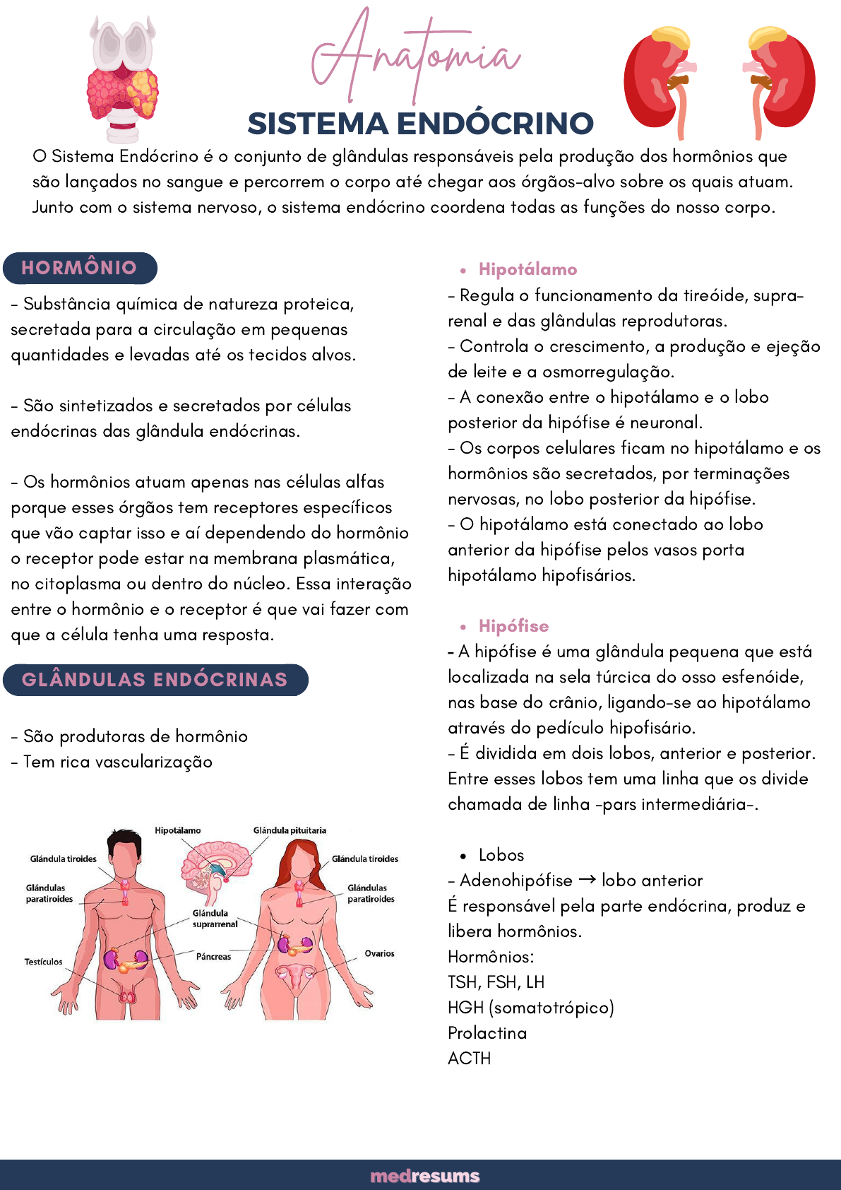 - Substância química de natureza proteica, secretada para a circulação em pequenas quantidades e levadas até os tecidos alvos. - São sintetizados e secretados por células endócrinas das glândula endócrinas. - Os hormônios atuam apenas nas células alfas porque esses órgãos tem receptores específicos que vão captar isso e aí dependendo do hormônio o receptor pode estar na membrana plasmática, no citoplasma ou dentro do núcleo. Essa interação entre o hormônio e o receptor é que vai fazer com que a célula tenha uma resposta. - São produtoras de hormônio - Tem rica vascularização Hipotálamo Hipófise Lobos - Regula o funcionamento da tireóide, supra- renal e das glândulas reprodutoras. - Controla o crescimento, a produção e ejeção de leite e a osmorregulação. - A conexão entre o hipotálamo e o lobo posterior da hipófise é neuronal. - Os corpos celulares ficam no hipotálamo e os hormônios são secretados, por terminações nervosas, no lobo posterior da hipófise. - O hipotálamo está conectado ao lobo anterior da hipófise pelos vasos porta hipotálamo hipofisários. - A hipófise é uma glândula pequena que está localizada na sela túrcica do osso esfenóide, nas base do crânio, ligando-se ao hipotálamo através do pedículo hipofisário. - É dividida em dois lobos, anterior e posterior. Entre esses lobos tem uma linha que os divide chamada de linha -pars intermediária-. - Adenohipófise → lobo anterior É responsável pela parte endócrina, produz e libera hormônios. Hormônios: TSH, FSH, LH HGH (somatotrópico) Prolactina ACTH O Sistema Endócrino é o conjunto de glândulas responsáveis pela produção dos hormônios que são lançados no sangue e percorrem o corpo até chegar aos órgãos-alvo sobre os quais atuam. Junto com o sistema nervoso, o sistema endócrino coordena todas as funções do nosso corpo. Anatomia SISTEMA ENDÓCRINO HORMÔNIO GLÂNDULAS ENDÓCRINAS Tireóide - Neurohipófise → lobo posterior Não tem capacidade de produzir hormônios endócrinos, vão apenas liberar os hormônios que vieram do hipotálamo e que são armazenados aí. Hormônios: ADH e Ocitocina Está localizada por trás de dois músculos, esternotireóideo e esterno-hióideo. - Encontra-se anteriormente no pescoço no nível das vértebras C5 – T1. - A glândula tireóide tem uma parte central chamada de istmo. Vascularização da Tireóide: Artérias: - A. Tireóidea Superior (Carótida Externa) - A. Tireóidea Inferior (Tronco Tireocervical) - A. Tireóidea Ima (10% das pessoas) Veias: - Vv. Tireóideas Superiores (Drena o Polo Superior) - Vv. Tireóideas Médias (Drena a região intermédia dos lobos) - Vv. Tireóideas Inferiores (Drena o Polo Inferior) Paratireóide Nervos: São derivados dos Gânglios Simpáticos Cervicais : - Superiores - Médios - Inferiores Obs: Chegam à glândula através dos plexos cardíaco e periarteriais tireóideos superior e inferior, que acompanham as artérias tireóideas. - Apresenta quatro glândulas, normalmente, duas superiores e duas inferiores. - Tem formato oval e achatado - Localiza-se na cápsula da tireóide - Produz um hormônio chamado paratohormônio Vasos das Glândulas Paratireóides: Irrigação principal: - Ramos da artérias tireóideas inferiores Outras irrigações: - Aa. Tireóideas superiores - A. Tireóidea Ima - A. Laríngea, Traqueal e Esofágicas Drenagem Venosa: Veias Paratireóidea: - Plexo - Venoso -Tireóideo Drenagem Linfática: - Linfonodos Cervicais Profundo - Paratraqueal Nervos das glândulas paratireoides: A inervação das glândulas paratireoides é abundante; é derivada de ramos tireóideos dos gânglios (simpáticos) cervicais. Artérias e Veias : Artérias: - Superiores - Médias - Inferiores Veias: - VSRD – VCI - VSRE – V. Renal Esquerda Drenagem linfática: - Os vasos linfáticos suprarrenais originam-se de um plexo situado profundamente à cápsula da glândula e de outro em sua medula. - A linfa segue até os linfonodos lombares. GLÂNDULAS SUPRARRENAIS Está localizada na parte superomedial, entre o rim e o diafragma. Formas e relações: . Constituição: - Cápsula = tecido conjuntivo propriamente dito - Duas substâncias: Cortical = produz hormônios (corticoides, mineralocorticóides, glicococorticoides) Medular: Irá produzir adrenalina e noradrenalina.