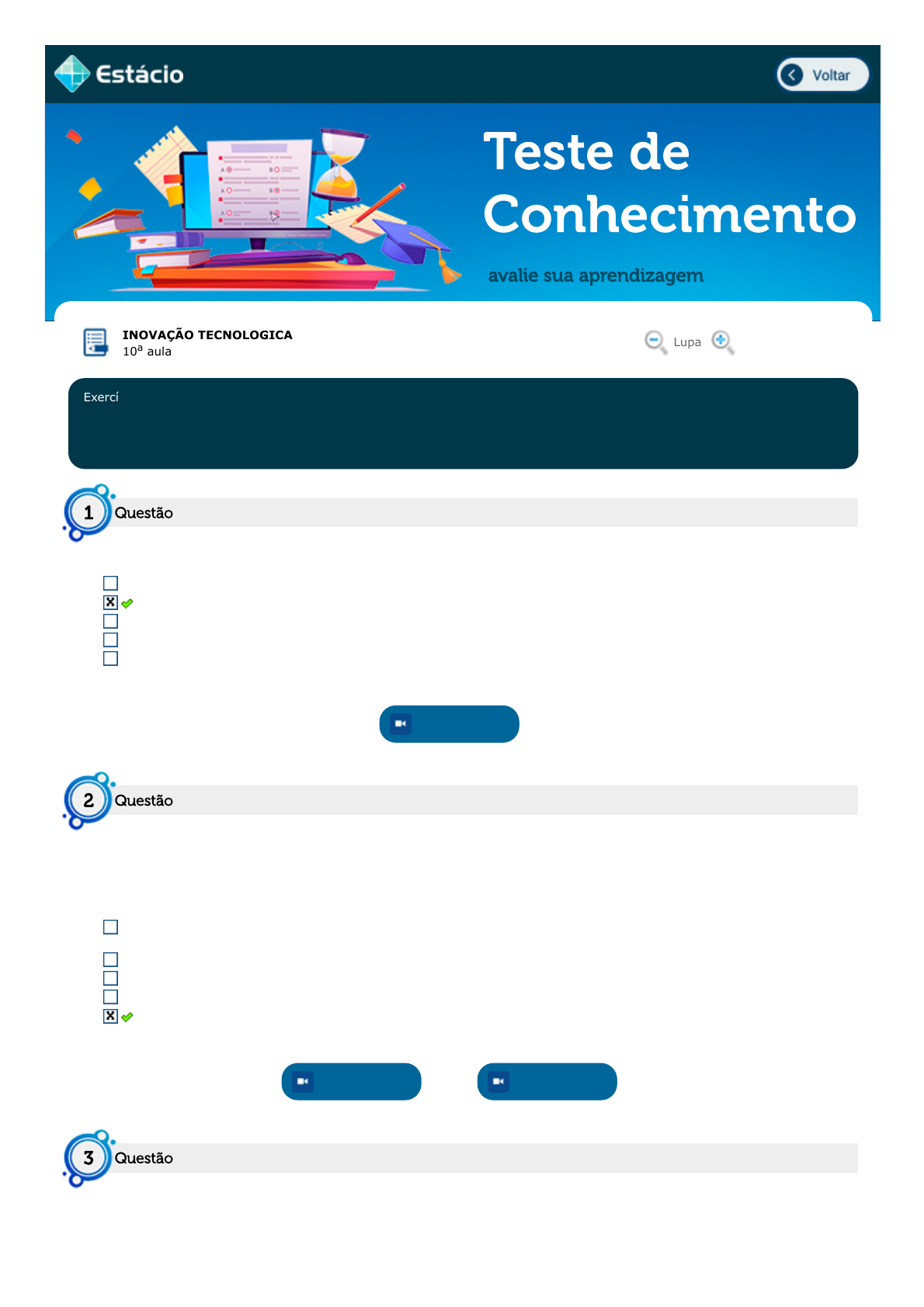 23/09/2021 21:28 EPS https://simulado.estacio.br/bdq_simulados_exercicio_preview.asp?cod_prova=3744955697&cod_hist_prova=187801783&pag_voltar=otacka 1/3 Teste de Conhecimento avalie sua aprendizagem INOVAÇÃO TECNOLOGICA 10a aula Lupa Exercício: CCT0209_EX_A10_201903202671_V1 21/04/2020 Aluno(a): JEFERSON BARBOSA DOS SANTOS 2021.3 EAD Disciplina: CCT0209 - INOVAÇÃO TECNOLOGICA 201903202671 O objetivo do intra-empreendedorismo é: Copiar soluções usadas anteriormente, mesmo que não tenham dado certo Achar novas ideias para aprimoramento da empresa Resolver todos os problemas de concorrência do mercado Resolver problemas de comunicação da empresa Acabar com toda a concorrência do mercado Respondido em 21/04/2020 18:04:05 Gabarito Comentado Diana é uma grande líder em sua empresa. Sempre envolvida em projetos, tem liderado várias equipes, convencendo as pessoas da importância de suas idéias e sempre procurando se relacionar da melhor forma possível. Diana é muito autoconfiante, corajosa, motivada, está sempre atenta aos riscos e necessidades dos projetos, focaliza nos clientes, sabe delegar, mas também sabe executar as tarefas necessárias, estabelece cronogramas e não teme ser demitida. Pelas características apresentadas Diana pode ser considerada: uma mulher empreendedora, que está apenas buscando adotar os clientes da empresa como clientes de sua futura empresa uma mulher de garra uma mulher mais ligada ao mercado do que ao produto uma pessoa sem inteligência emocional uma pessoa com muitas características intra-empreendedoras Respondido em 21/04/2020 18:04:10 Gabarito Comentado Gabarito Comentado Analise as duas assertivas a seguir e a relação entre as mesmas: I) A cultura para inovação deve ser um dos objetivos estratégicos da empresa. Porque Questão1 Questão2 Questão3 https://simulado.estacio.br/alunos/inicio.asp javascript:voltar(); javascript:diminui(); javascript:aumenta(); 23/09/2021 21:28 EPS https://simulado.estacio.br/bdq_simulados_exercicio_preview.asp?cod_prova=3744955697&cod_hist_prova=187801783&pag_voltar=otacka 2/3 II) A empresa deve estimular um ambiente propício à criação de ideias, que inclui a redução de quaisquer restrições a criatividade individual. Assinale a opção que mostra a correta relação entre as assertivas: As assertivas são verdadeiras e a segunda não justifica a primeira. As assertivas são verdadeiras e a segunda justifica a primeira. A primeira assertiva é verdadeira e a segunda é falsa. A primeira assertiva é false e a segunda é verdadeira. As duas assertivas são falsas. Respondido em 21/04/2020 18:04:21 Gabarito Comentado Gabarito Comentado Analise as sentenças abaixo sobre empreendedorismo e, em seguida, assinale a alternativa correta: I. O empreendedorismo só pode ser usado pelo empresário, dono do negócio, nunca pelo funcionário; II. O empreendedorismo é importante para criar novas formas de atender as necessidades do mercado; III. O empreendedorismo é a capacidade de transformar uma ideia em realidade, trata-se de uma ferramenta de aprimoramento para uma organização. Somente as sentenças I e II são corretas Somente as sentenças II e III são corretas Somente as sentenças I e III são corretas Somente a sentença II está correta Todas as sentenças estão corretas Respondido em 21/04/2020 18:04:30 Gabarito Comentado O Intraempreendedorismo "define aqueles que transformam ideias em realidade dentro de uma empresa". A partir desta definição, o intraempreendedorismo significa que: O profissional tenha a possibilidade de trabalhar com uma ideia própria ou criar a partir da ideia de outra pessoa O papel central do profissional é "arregaçar as mangas" e dar forma e materialidade à esta ideia O profissional pode agir de forma empreendedora em uma organização, agindo com inovação e pro atividade em busca dos objetivos desta organização O profissional tenha iniciativa, sem medo de tentar e que aprende com os erros, criativo, ousado e é capaz de mobilizar recursos e implementar novos negócios dentro do ambiente corporativo O profissional será aquele que apresenta a ideia criativa Respondido em 21/04/2020 18:04:52 Gabarito Comentado Gabarito Comentado O intraempreendedor não tem vida fácil, muito pelo contrário, enfrenta várias barreiras, exceto: Ser flexível para as mudanças. Ter clareza que sua ideia é inovadora e gera valor para o negócio da empresa. Ser persistente e determinado. Elaborar um plano de negócios e, caso seja necessário, levantar recursos financeiros para viabilizar a ideia. Requerer apoio dos parceiros de negócio mas não necessariamente de seus superiores. Respondido em 21/04/2020 18:05:03 Questão4 Questão5 Questão6 23/09/2021 21:28 EPS https://simulado.estacio.br/bdq_simulados_exercicio_preview.asp?cod_prova=3744955697&cod_hist_prova=187801783&pag_voltar=otacka 3/3 Gabarito Comentado Gabarito Comentado Em relação as afirmações abaixo, assinale a opção que contenha apenas as corretas: I- O intraempreendedorismo pode ser definido como o empreendedorismo que ocorre dentro das organizações que já existem. II-O intraempreendedor é uma pessoa que assume a responsabilidade pela criação de inovações dentro de uma organização. III-o empreendedorismo corporativo está restrito aos altos escalões de uma empresa. Somente II e III Somente III Somente I e II I, II e III Somente I Respondido em 21/04/2020 18:05:13 Explicação: O certo seria: o empreendedorismo corporativo não está restrito aos altos escalões de uma empresa A população de baixa renda no Brasil entre os anos 2000 e 2012 experimentou um crescimento no nível econômico das camadas mais pobres da população. Este fato pode ser evidenciado pelos programas de transferência de renda (Bolsa Família) que tornou possível o aumento do consumo das Classes C e D. Outro fator considerável deste período foi: O aumento da compra de imóveis novos pelos beneficiários do Programa Bols