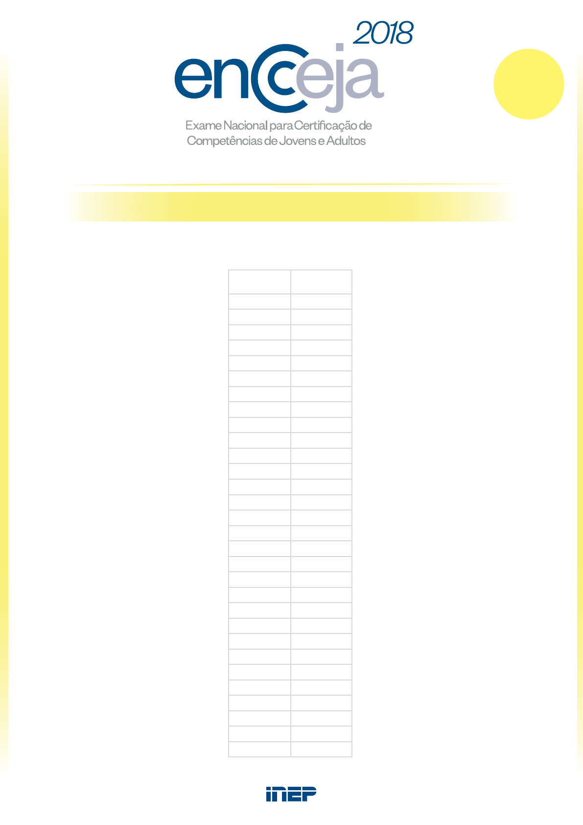 QUESTÕES GABARITO 31 A 32 C 33 D 34 D 35 D 36 C 37 B 38 C 39 D 40 C 41 D 42 C 43 B 44 B 45 C 46 C 47 C 48 C 49 A 50 C 51 B 52 D 53 A 54 A 55 D 56 C 57 C 58 D 59 D 60 B Amarela Ensino Fundamental Nacional - 2ª APLICAÇÃO Prova 2 - Manhã Matemática Leia com atenção as instruções abaixo: 1. Ao receber este Caderno de Prova, confi ra se contém trinta questões, corretamente ordenadas de 31 a 60. Caso o caderno esteja incompleto ou tenha qualquer defeito, solicite imediatamente ao Aplicador que tome as providências cabíveis. 2. Leia atentamente cada questão antes de decidir qual opção assinalar. Lembre-se: cada questão tem uma única opção correta. 3. Inicialmente, marque as suas respostas neste Caderno de Prova. Em seguida, transcreva-as para o Cartão-Resposta preenchendo completamente os círculos correspondentes. Utilize caneta esferográfi ca de tinta preta fabricada com material transparente. Lembre-se: o Cartão-Resposta é o único documento válido para a correção da sua prova objetiva. 4. Ao terminar a prova, chame o Aplicador e devolva-lhe este Caderno de Prova e o seu Cartão-Resposta. 5. A duração das provas, deste turno, é de quatro horas, já incluído o tempo destinado ao preenchimento do Cartão-Resposta. Prova 2 - Manhã Matemática Ensino Fundamental 2ª A pl ic aç ão *BFR275AMMA1* Matemática – ENCCEJA 20182 QUESTÃO 31 Para criar a tela Réptiles, o pintor Escher utilizou a técnica de recortes e colagens em papel para formar um lagarto. Inicialmente, ele utilizou um pedaço de papel, com dupla camada, no formato de um hexágono regular, conforme a figura. Depois, desenhou e recortou partes em uma das camadas, por exemplo, a cauda do réptil, representada pelo número 6, que foi colada na parte externa do hexágono, deixando assim aparente, na outra camada do papel, a figura F, igual à figura 6. O lagarto será formado pelo conjunto de todas as partes claras. Um professor mostra essa obra aos seus alunos, ensinando que figuras iguais são congruentes e, por isso, têm áreas iguais. Apresenta, então, quatro propostas para obtenção da área do lagarto formado pelos recortes e colagens: I. cálculo da área total do hexágono; II. soma das áreas das figuras representadas por números; III. soma das áreas das figuras representadas por números e letras; IV. cálculo da área do hexágono menos as áreas das figuras representadas por números. Qual das propostas apresentadas pelo professor representa a área do lagarto formado pelos recortes e colagens? A I B II C III D IV A F E DC B 1 2 3 4 5 6 *BFR275AMMA2* Matemática – ENCCEJA 2018 3 QUESTÃO 32 Um eletricista determina a potência necessária para a iluminação de um ambiente utilizando a seguinte regra: para iluminar uma área de 6 m2, necessita-se de 40 W de potência e, para cada acréscimo de até 4 m2 na área, adiciona-se 20 W de potência. Ele precisa instalar lâmpadas em uma sala cuja área mede 13 m2. Com base nessas informações, qual é a potência de iluminação, em watt, necessária para essa sala? A 40 B 60 C 80 D 100 QUESTÃO 33 Um colecionador de selos iniciou sua coleção com um pacote de 50 selos e se propôs a adquirir mensalmente novos selos, realizando uma compra segundo uma regra fixa. Como resultado, o número de selos de sua coleção evoluiu mês a mês conforme a sequência. mês 1 mês 2 mês 3 mês 4 50 130 290 610 Mantido esse critério, o número de selos do colecionador no quinto mês será A 740. B 900. C 1 220. D 1 250. *BFR275AMMA3* Matemática – ENCCEJA 20184 QUESTÃO 34 O preço à vista de um par de tênis na loja I é R$ 200,00. A forma de pagamento oferecida foi: uma entrada de R$ 100,00 mais uma parcela de R$ 125,00 no mês seguinte, em que os juros incidem sobre o valor da compra efetuada, mas ainda não pago. O comprador não possuía o dinheiro para pagamento à vista e achou que o percentual de juros cobrado para pagamento parcelado era alto. Portanto, ele foi à loja II pesquisar o preço desse mesmo par de tênis, em duas parcelas, com o mesmo valor de entrada. Lembre que j = C i t. Para que a loja II ofereça maior economia ao comprador em relação à loja I, a taxa percentual de juros simples da loja II deve ser, necessariamente, menor que A 11,1% B 12,5% C 20,0% D 25,0% *BFR275AMMA4* Matemática – ENCCEJA 2018 5 QUESTÃO 35 Roger Penrose, professor na Universidade de Oxford e especialista mundial em relatividade e teoria quântica, descobriu um belíssimo tipo de pavimentação aperiódica, constituída apenas por dois tipos de ladrilhos, como se observa na figura 1: Figura I Disponível em: www.educ.fc.ul.pt. Acesso em: 15 dez. 2012 (adaptado). Esses dois tipos de ladrilhos, pelos seus aspectos, foram batizados de "flechas" e "papagaios" por John Conway (outro entusiasta de diversões matemáticas, à semelhança de Penrose). As "flechas" e os "papagaios" podem ser obtidos pela fragmentação de um polígono, como mostra a figura 2. Figura II Disponível em: www.educ.fc.ul.pt. Acesso em: 15 dez. 2012 (adaptado). Esse polígono é um A trapézio. B triângulo. C octógono. D paralelogramo. 36° 36° 36° 36°1 1 1 36° 72° Ф Ф *BFR275AMMA5* Matemática – ENCCEJA 20186 QUESTÃO 36 Observe esta sequência de figuras: Uma expressão algébrica que permite determinar a quantidade de quadradinhos escuros na Figura N é dada por A N2 B (N – 1)2 C 2N – 1 D 2N QUESTÃO 37 A dois passos do paraíso Longe de casa Há mais de uma semana Milhas e milhas distante Do meu amor MESQUITA, E. BARRETO, R. In: BLITZ. Identidade. Rio de Janeiro: EMI, 1984 (fragmento). No trecho da canção, aparecem duas unidades de medida pouco conhecidas. São elas: passo e milha. Considerando que um passo equivale a 1,5 m e que uma milha equivale a 1,6 km, se uma pessoa andou dois passos, quanto mais terá que caminhar, em metro, para percorrer exatamente uma milha? A 1 599 B 1 597 C 1 585 D 1 570 Figura 1 Figura 3Figura 2 Figura 4 ... *BFR275AMMA6* Mate