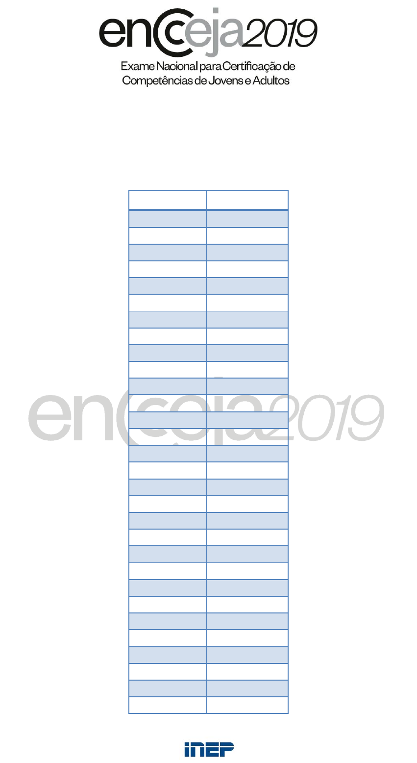 Nacional Ensino Fundamental Prova II - Manhã Matemática QUESTÃO GABARITO 31 D 32 B 33 C 34 C 35 A 36 D 37 C 38 A 39 D 40 D 41 A 42 A 43 C 44 A 45 B 46 A 47 D 48 D 49 C 50 C 51 B 52 C 53 B 54 B 55 B 56 B 57 D 58 A 59 A 60 D Prova II - Manhã Matemática Ensino Fundamental a C C C X X X X X X X X X X = = +++ + Leia com atenção as instruções a seguir: 1. Ao receber este Caderno de Questões, confira se contém trinta questões, corretamente ordenadas de 31 a 60. Caso o caderno esteja incompleto ou tenha qualquer defeito, solicite imediatamente ao Aplicador que tome as providências cabíveis. 2. Leia atentamente cada questão antes de decidir qual opção assinalar. Lembre-se: cada questão tem uma única opção correta. 3. Inicialmente, marque as suas respostas neste Caderno de Questões. Em seguida, transcreva-as para o Cartão-Resposta, preenchendo completamente os círculos correspondentes. Utilize caneta esferográfica fabricada com material transparente e de tinta preta. Lembre-se: o Cartão-Resposta é o único documento válido para a correção da sua prova objetiva. 4. O preenchimento do Cartão-Resposta é obrigatório. 5. Ao terminar a prova, chame o Aplicador e devolva-lhe este Caderno de Questões e o Cartão-Resposta preenchido. 6. Peça ao Chefe de Sala que destaque o espaço reservado para anotar suas respostas. Esse espaço encontra-se na última folha do Caderno de Questões. Essa anotação é opcional e não será considerada para correção de sua prova. 7. A duração das provas, deste turno, é de quatro horas, já incluído o tempo destinado ao preenchimento de suas respostas no Cartão-Resposta e no espaço reservado para anotar suas respostas. 1.2RE *BFR175AMMA1* 2 Matemática – ENCCEJA 2019 QUESTÃO 31 A imagem apresenta uma pilha cujo comprimento está sendo medido com uma régua. Disponível em: www.wikihow.com. Acesso em: 22 set. 2013 (adaptado). O comprimento da pilha, registrado na régua, em centímetro, é mais próximo de A 57. B 47. C 5,7. D 4,7. QUESTÃO 32 Um casal necessita de R$ 40 000,00 para reformar seu apartamento. Eles dispõem somente de R$ 32 000,00 e decidem investir todo esse dinheiro para completar o valor necessário para a reforma. Após pesquisar, encontram em um banco quatro planos de investimentos diferentes, todos com taxas em juros simples, conforme indicado: • Plano I: 1,2% ao mês; • Plano II: 2,5% ao bimestre; • Plano III: 4,1% ao trimestre; • Plano IV: 9,8% ao ano. Observando que a capitalização ocorrerá no fechamento do período de cada plano, o casal pretende optar por aquele em que o valor necessário para a reforma, cujo custo será mantido inalterado, seja obtido na menor quantidade possível de meses. Qual plano de investimentos o casal deverá escolher? A I B II C III D IV QUESTÃO 33 Um produto passou a ser comercializado em uma nova embalagem, cuja capacidade é 0,2 litro maior do que a da embalagem anterior. Em quantos mililitros a capacidade da nova embalagem é maior do que a da embalagem anterior? A 2 B 20 C 200 D 2 000 *BFR175AMMA2* 3Matemática – ENCCEJA 2019 QUESTÃO 34 Um casal com dois filhos fez um levantamento sobre os valores cobrados pelos dois planos de saúde disponíveis em sua cidade. O valor mensal a ser cobrado em cada plano é definido somando-se os valores de referência para todos os membros da família que serão cadastrados. O resultado desse levantamento, considerados os mesmos tipos de cobertura nos dois planos, está listado no quadro, que apresenta os valores mensais de referência. Valor pago Idade (ano) Valores de referência Plano I Plano II Pelo titular Até 25 R$ 280,00 R$ 290,00 Entre 25 e 50 R$ 420,00 R$ 450,00 50 ou mais R$ 480,00 R$ 500,00 Por dependente Até 25 R$ 300,00 R$ 300,00 Entre 25 e 50 R$ 400,00 R$ 360,00 50 ou mais R$ 490,00 R$ 500,00 As idades dos membros dessa família são: Membro Idade (ano) Pai 51 Mãe 47 Filho 26 Filha 22 A opção que terá a menor mensalidade para essa família nos próximos dois anos é o plano A I, com o pai como titular. B I, com a mãe como titular. C II, com o pai como titular. D II, com a mãe como titular. QUESTÃO 35 Um supermercado elaborou uma cesta composta de 1 kg de quatro produtos básicos: arroz, feijão, açúcar e sal. Necessitando reajustar os preços de três desses produtos para repassar o aumento aplicado pelos fornecedores, o gerente desse supermercado elaborou uma tabela na qual listou os preços desses produtos, antes e depois do reajuste, conforme apresentado a seguir. Produto Preço de venda Antigo Novo 1 kg de arroz R$ 2,30 R$ 2,75 1 kg de feijão R$ 2,50 R$ 2,80 1 kg de açúcar R$ 1,25 R$ 1,65 1 kg de sal R$ 2,50 ? Como o preço do sal não foi aumentado pelos fornecedores e o supermercado dispõe de grande quantidade em estoque, o gerente decidiu reduzir o preço do quilograma de sal de forma a manter fixas as despesas de seus clientes com a aquisição da cesta formada por esses produtos. O novo preço, em real, para o quilograma de sal será A 1,35. B 2,05. C 2,50. D 2,45. *BFR175AMMA3* 4 Matemática – ENCCEJA 2019 QUESTÃO 36 O gráfico apresenta as taxas de variação do Produto Interno Bruto (PIB) do Brasil no período de 2000 a 2013. A taxa de variação do PIB em um determinado ano informa o quanto o PIB do país variou em relação ao PIB do ano anterior. Evolução do PIB brasileiro - 2000 a 2013 4,3% 1,3% 2,7% 1,1% 5,7% 6,1% 3,2% 4,0% 5,2% 2,7% −0,3% 7,5% 2,3% 1,0% 2000 2001 2002 2003 2004 2005 2006 2007 2008 2009 2010 2011 2012 2013 Nesse período, os anos que apresentaram as duas menores taxas de variação do PIB foram A 2001 e 2003. B 2003 e 2012. C 2008 e 2011. D 2009 e 2012. *BFR175AMMA4* 5Matemática – ENCCEJA 2019 QUESTÃO 37 Um jogador de basquete tinha na sua camisa o número 88. Um grande fã desse jogador pintou o número 88 utilizando octógonos regulares congruentes, conforme a figura. Na confecção do número, aparece um quadrilátero em preto, no centro da figura. 