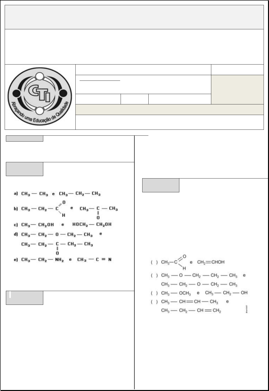 COLÉGIO TIA IVONE Avaliação de Química 3ª SÉRIE – ENSINO MÉDIO 3º BIMESTRE - 2021 NOTA OBSERVAÇÃO: O espaço ao lado é de uso exclusivo do professor. NÃO PREENCHA ESTE ESPAÇO. Penalidade de 5 (cinco) décimos na nota. DATA: PROFESSORA: Poliane Marques ALUNO: QUESTÃO 01 QUESTÃO 02 Assinale a alternativa que indica um par de isômeros: QUESTÃO 03 Dados os compostos: 1- CH3 - CH = CH - CH3 2- CH2 = CH - CH2 - CH3 3- CH3CH - (CH3) -CH3 4- CH3 - CH2 - CH2 - CH3 Podemos afirmar que: a) 1 e 2 são isômeros geométricos. b) 1 e 3 são isômeros de posição. c) 1 e 4 são isômeros funcionais. d) 3 e 4 são isômeros de posição. e) 3 e 4 são isômeros de cadeia. QUESTÃO 04 Relacione o tipo de isomeria com as estruturas apresentadas a seguir. Depois, assinale a alternativa que corresponda à sequência correta obtida: 1- Tautomeria 2- Isomeria de posição 3- Metameria 4- Isomeria funcional a) 1, 3, 4, 2 b) 1, 3, 2, 4 c) 1, 4, 3, 2 d) 4, 1, 3, 2 e) 3, 4, 1, 2 QUESTÃO 05 Considere os seguintes pares de compostos orgânicos. Os pares 1, 2 e 3 correspondem, respectivamente, a a) isômeros ópticos, compostos idênticos e isômeros de função. b) isômeros de posição, enantiômeros e isômeros de cadeia. c) isômeros de função, diastereoisômeros e isômeros de posição. d) isômeros de cadeia, compostos idênticos e isômeros de função. e) isômeros geométricos, enantiômeros e isômeros de posição. Espaço para rascunhos: lembrando que os cálculos devem ser deixados na prova, como justificativa das respostas. O não gostar de algo ou de alguém, não pode se tornar mais importante do que o gosta de si mesmo, não devemos deixar, que uma empatia ou a falta dela seja, mais importante do que os nossos próprios objetivos... Oliveira Marques P. (2021) Boa sorte!