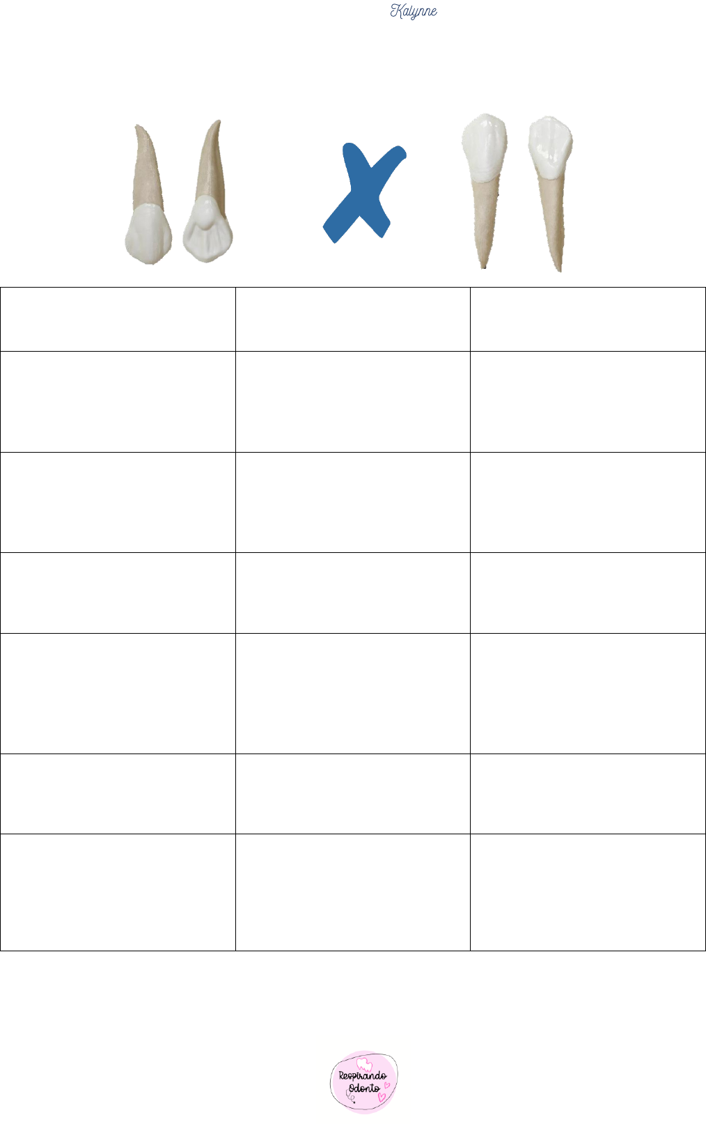 P3 - ODONTOLOGIA UNINASSAU-RN - @respirando_odonto Inspiração: @odonto.show Diferenças entre Caninos: Fonte: Aula teórica de Anatomofisiologia Oral. Faculdade Maurício de Nassau, odontologia, 2020. Canino Superior Canino inferior Raiz Mais longa e espessa + Única e cônica. + Sulcos longitudinais nas faces proximais + câmara pulpar e canal radicular amplos + Ápice desviado para a distal. Tamanho: 17 mm. Ápice mais pontiagudo + Curvaturas são incomuns + pode ter aspecto birradicular + câmara pulpar e canal radicular amplo + Ápice desviado para a mesial. Tamanho: 16 mm. Coroa Cúspide mais desenvolvida e mais larga + altura da coroa semelhante ao incisivo central superior + Ligeiramente menor que o canino inferior. Tamanho: 10mm. Cúspide menos desenvolvida + altura da coroa semelhante ao canino superior + Ligeiramente maior que o canino superior. Tamanho: 10 mm. Face Vestibular Lóbulo médio mais desenvolvido – Crista vestibular + depressões de desenvolvimento. + Contorno mesial mais reto que o distal. Crista vestibular + Contorno mesial mais reto que o distal + depressões de desenvolvimento tênues. Face Lingual Características da face lingual mais evidentes + mais estreita que a face vestibular + Cíngulo + crista lingual + duas fossas linguais (mesial e distal). Características da face lingual menos evidentes + mais estreita que a vestibular+ mais suave e regular + cíngulo pouco desenvolvido + crista lingual menos nítida (exceto em direção à ponta de cúspide). Faces proximais Cúspide deslocada para a vestibular. A Face mesial é mais plana, A JAC possui curvatura mais acentuada na face mesial. Cúspide deslocada para lingual. + Mesial maior e mais convexa. + O cíngulo não é tão pronunciado. Incisal Dimensão vestibulolingual maior de todos os dentes anteriores e maior que a mesiodistal + contorno da coroa é assimétrico: + cúspide deslocada para vestibular e mesial. Tamanho: 7,5 mm. Dimensão vestibulolingual maior que a mesiodistal + coroa deslocada para o lado mesial; + cíngulo deslocado no sentido distal. Tamanho: 7mm. Mais longo Mais curto