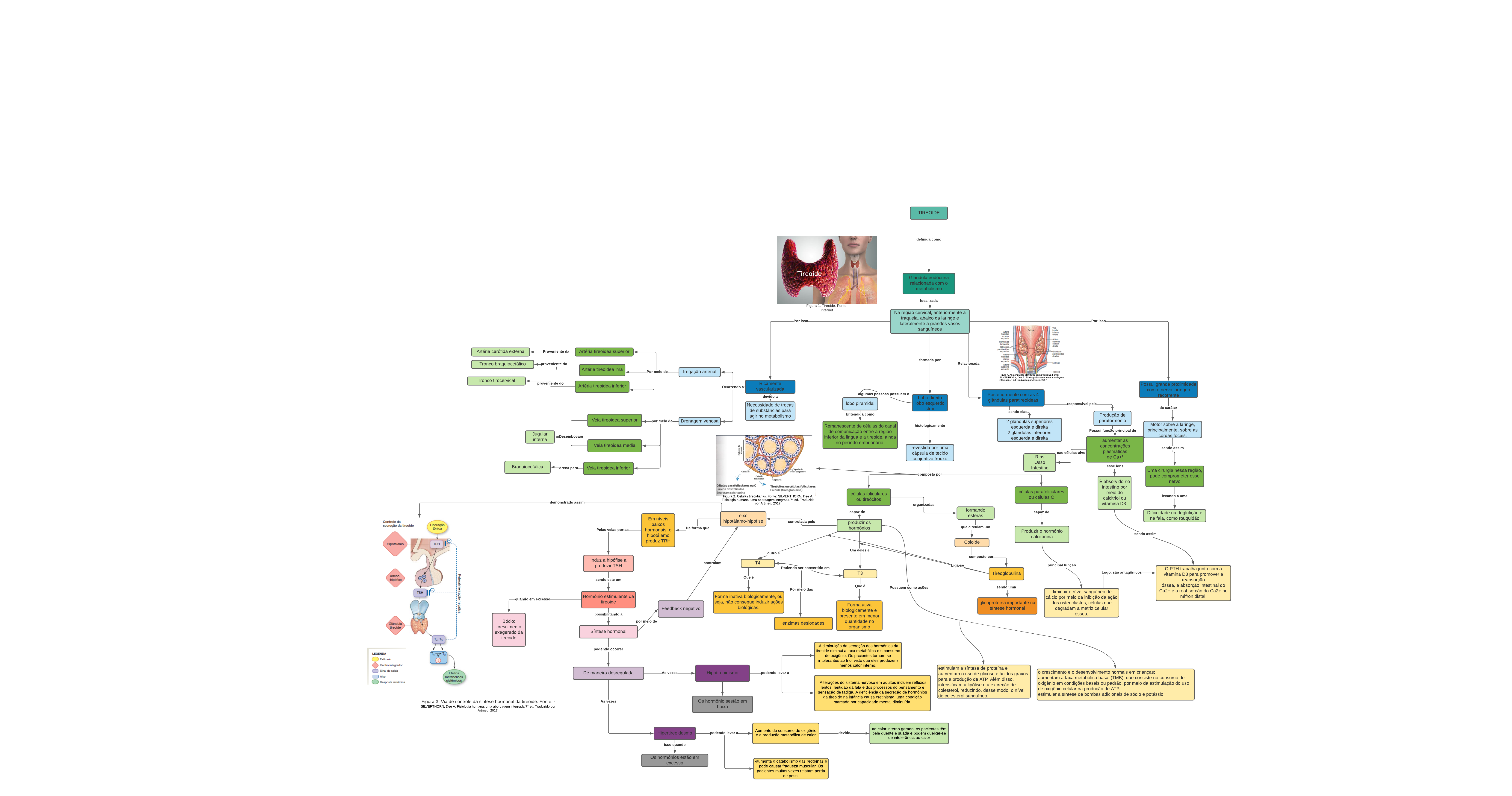 TIREOIDE definida como Glândula endócrina relacionada com o metabolismo localizada Na região cervical, anteriormente à traqueia, abaixo da laringe e lateralmente a grandes vasos sanguíneos formada por Lobo direito lobo esquerdo istmo algumas pessoas possuem o lobo piramidal Entendida como Remanescente de células do canal de comunicação entre a região inferior da lingua e a tireoide, ainda no período embrionário. histologicamente revestida por uma cápsula de tecido conjuntivo frouxo composta por células foliculares ou tireócitos células parafoliculares ou células C capaz de produzir os hormônios organizadas formando esferas que circulam um Coloide composto por Tireoglobulina sendo uma glicoproteína importante na síntese hormonal Um deles é T3 outro é T4 Liga-se Que é Forma ativa biologicamente e presente em menor quantidade no organismo Que é Forma inativa biologicamente, ou seja, não consegue induzir ações biológicas. Podendo ser convertido em enzimas desiodades Por meio das Por isso Possui grande proximidade com o nervo laríngeo recorrente de caráter Motor sobre a laringe, principalmente, sobre as cordas focais. sendo assim Uma cirurgia nessa região, pode comprometer esse nervo levando a uma Dificuldade na deglutição e na fala, como rouquidão Por isso Ricamente vascularizada devido a Necessidade de trocas de substâncias para agir no metabolismo Irrigação arterial Ocorrendo a Drenagem venosa Artéria tireoidea superior Artéria tireoidea ima Artéria tireoidea inferior Por meio de Artéria carótida externa Proveniente da Tronco tirocervical proveniente doTronco braquiocefálico proveniente do Veia tireoidea inferior Veia tireoidea superior Veia tireoidea media por meio de Jugular interna Desembocam drena paraBraquiocefálica capaz de Produzir o hormônio calcitonina Relacionada Posteriormente com as 4 glândulas paratireoideas sendo elas 2 glândulas superiores esquerda e direita 2 glândulas inferiores esquerda e direita Produção de paratormônio responsável pela Possui função principal de aumentar as concentrações plasmáticas de Ca+² nas células-alvo Rins Osso Intestino esse íons É absorvido no intestino por meio do calcitriol ou vitamina D3. sendo assim O PTH trabalha junto com a vitamina D3 para promover a reabsorção óssea, a absorção intestinal do Ca2+ e a reabsorção do Ca2+ no néfron distal; controlada pelo eixo hipotálamo-hipófise De forma que Em níveis baixos hormonais, o hipotálamo produz TRH Pelas veias portas Induz a hipófise a produzir TSH sendo este um Hormônio estimulante da tireoide possibilitando a Síntese hormonal por meio de Feedback negativo controlam demonstrado assim Figura 3. Via de controle da sintese hormonal da tireoide. Fonte: : SILVERTHORN, Dee A. Fisiologia humana: uma abordagem integrada.7° ed. Traduzido por Artmed, 2017. Figura 2. Células tireoidianas. Fonte: SILVERTHORN, Dee A. Fisiologia humana: uma abordagem integrada.7° ed. Traduzido por Artmed, 2017. podendo ocorrer De maneira desregulada As vezes Hipotireoidismo As vezes Hipertireoidesmo Os hormônio sestão em baixa isso quando Os hormônios estão em excesso podendo levar a Aumento do consumo de oxigênio e a produção metabólica de calor devido ao calor interno gerado, os pacientes têm pele quente e suada e podem queixar-se de intolerância ao calor ·aumenta o catabolismo das proteínas e pode causar fraqueza muscular. Os pacientes muitas vezes relatam perda de peso. ·A diminuição da secreção dos hormônios da tireoide diminui a taxa metabólica e o consumo de oxigênio. Os pacientes tornam-se intolerantes ao frio, visto que eles produzem menos calor interno. podendo levar a ·Alterações do sistema nervoso em adultos incluem reflexos lentos, lentidão da fala e dos processos do pensamento e sensação de fadiga. A deficiência da secreção de hormônios da tireoide na infância causa cretinismo, uma condição marcada por capacidade mental diminuída. Figura 1. Tireoide. Fonte: internet Figura 4. Anatomia das glândulas paratireoideas. Fonte: SILVERTHORN, Dee A. Fisiologia humana: uma abordagem integrada.7° ed. Traduzido por Artmed, 2017 Possuem como ações o crescimento e o desenvolvimento normais em crianças; aumentam a taxa metabólica basal (TMB), que consiste no consumo de oxigênio em condições basais ou padrão, por meio da estimulação do uso de oxigênio celular na produção de ATP. estimular a síntese de bombas adicionais de sódio e potássio estimulam a síntese de proteína e aumentam o uso de glicose e ácidos graxos para a produção de ATP. Além disso, intensificam a lipólise e a excreção de colesterol, reduzindo, desse modo, o nível de colesterol sanguíneo. principal função diminuir o nível sanguíneo de cálcio por meio da inibição da ação dos osteoclastos, células que degradam a matriz celular óssea. Logo, são antagônicos quando em excesso Bócio: crescimento exagerado da tireoide Tireoideee Página 1