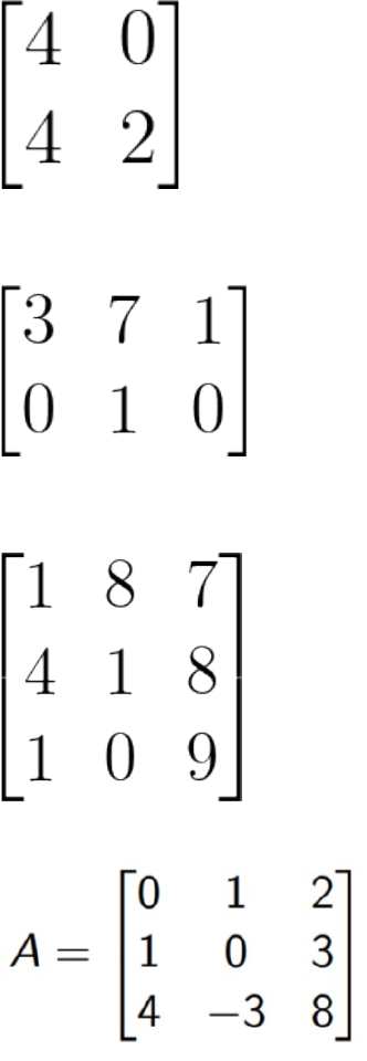 Exercícios: 1) Para a matriz quadrada abaixo, encontre a matriz transposta e oposta. 2) Seja a matriz abaixo de ordem 2×3, encontra a matriz transposta. 3) Considera a matriz quadrada abaixo, encontre a matriz transposta. 4) Encontre a oposta da matriz A: