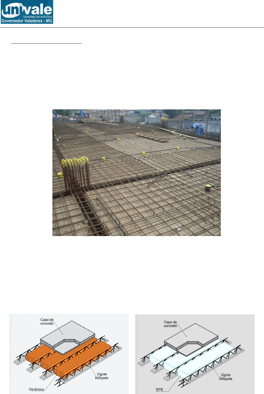 UNIVERSIDADE VALE DO RIO DOCE (UNIVALE) DIMENSIONAMENTO DE ESTRUTURAS DE CA 1) LAJES (DEFINIÇÃO) A laje maciça pode ser definida como sendo uma placa de concreto armado, cuja função é resistir esforços de compressão e de tração em edificações. Esse tipo de laje é moldado in loco e, além disso, não possui em sua composição nenhum outro material que não seja aço e concreto. As lajes maciças são executadas diretamente no canteiro de obras, e não necessitam de mão de obra muito especializada, além disso, apresentam um tempo razoável de execução, o que depende basicamente da cura do concreto. As lajes maciças são comuns em edifícios de múltiplos pavimentos e em construções como escolas, indústrias, hospitais. Geralmente, não são aplicadas em residências e outros imóveis de pequeno porte, e o motivo é simples: devido às formas que são utilizadas na metodologia executiva. Assim, em edifícios de múltiplos pavimentos as formas são reutilizadas a cada andar, o que torna o método muito mais viável do que em edificações térreas, onde a forma seria montada e utilizada apenas uma vez. Para edificações térreas, as lajes pré-fabricadas apresentam vantagens nos aspectos custo e facilidade de construção. Porque não é comum utilizar vigotas treliçadas em edifícios de múltiplos andares? Pois o modelo de cálculo de uma vigota treliçada é do tipo bi-apoiada. Normalmente, edifícios de múltiplos andares apresentam vãos relativamente grandes que requer uma maior rigidez nas regiões de continuidades de lajes (engastes) de modo a reduzir as flechas da laje. Ao criar um modelo engastado em uma laje treliçada, ela estará submetida a momento fletor negativo, comprimindo a região inferior que apresenta um material de enchimento (EPS ou cerâmico) além de um concreto de baixa resistência na pré-laje, e não um concreto de resistência adequada (que seria a situação ideal). Com isso, quanto mais você tirar a peça de trabalhar no modelo natural, mais trincas terão para que ela fique em equilíbrio. Ou seja, a laje tende a fissurar para trabalhar da forma que queremos. Destaca-se, contudo, que regiões (maciças) de concreto podem ser utilizadas em continuidades de lajes para atender aos momentos negativos gerados. Além disso, outra desvantagem das lajes treliçadas em edifícios de múltiplos pavimentos está na dificuldade em fazer furos para passagens de instalações na mesma em razão das treliças. 2) VANTAGENS DA LAJE MACIÇA Podemos destacar alguns pontos positivos das lajes maciças: · Execução simplificada, não exigindo mão-de-obra especializada; · Possui um bom desempenho em relação a resistência dos esforços; · Pode auxiliar no sistema de contraventamento da edificação, através da propriedade de chapas; · Menos suscetível à ocorrência de patologias, como por exemplo, fissuras e trincas; · Acabamento liso na parte inferior; · Permite diferentes formatos dos panos da laje. 3) DESVANTAGENS DA LAJE MACIÇA Dentre os pontos negativos do sistema estrutural de lajes maciças, podemos destacar: · Custo elevado em relação a diversos outros sistemas de laje; · Mal desempenho da acústica nos ambientes; · Elevado consumo de concreto; · Peso próprio elevado, o que estimula maiores reações no restante da estrutura; · Utilização de formas, com dificuldade de reaproveitamento; · Não indicada para vencer grandes vãos. 4) VÃOS USUAIS PARA LAJES MACIÇAS Para pavimentos em que o menor vão a ser vencido pelas lajes é pequeno ou médio (lajes com vãos até 5m) e as cargas a serem suportadas não são muito elevadas, normalmente se tem empregado as lajes maciças apoiadas em vigas (sistemas tradicionais), uma vez que a espessura demandada pelas lajes, nesta situação, é pequena. Para este tipo de sistema, é grande a rigidez quanto aos deslocamentos verticais. Por outro lado, para grandes vãos, as lajes maciças podem ser antieconômicas, pois a espessura necessária da laje, para atender ao ELU e ao critério de pequenos deslocamentos transversais, certamente será elevada. Portanto, é interessante utilizar um sistema estrutural que tenha comportamento semelhante ao das placas (lajes maciças), porém com eficiência das vigas na flexão, ou seja, grande inércia e peso próprio relativamente pequeno. As lajes nervuradas quase sempre atendem a esses requisitos, representando um avanço em relação às maciças por necessitarem, em geral, de menor quantidade de material, quando os vãos são grandes. 4.1) ESPECIFICAÇÕES DE PROJETO QUANTO AOS VÃOS As lajes maciças são dimensionadas para resistir aos esforços solicitantes de projeto. Basicamente o projeto e dimensionamento devem seguir as especificações da ABNT NBR 6118:2014 – Projeto de estruturas de concreto — Procedimento – que estabelece os requisitos básicos exigíveis para estruturas de concreto armado. No projeto de lajes maciças, devem ser determinados os vãos teóricos (l): também chamado de vão equivalente, consiste na distância entre os eixos dos apoios; A partir disso os vãos teóricos são considerados como sendo lx o menor vão e ly, o maior, e estabelecem uma relação (λ = ly/lx) que classificam as lajes em armada em duas direções (λ ≤ 2) e armada em uma direção (λ > 2). Vãos teóricos lx (menor vão) e ly (maior vãos) 5) VÍNCULOS DA LAJE A maioria dos dimensionamentos das lajes maciças consideram três tipos de vínculos no apoio: bordas livres, bordas simplesmente apoiadas e bordas engastadas. As lajes maciças podem ter diversas formas de combinações quanto aos vínculos das bordas. A seguir são apresentadas algumas das principais combinações e como são representadas: 6) ESPESSURAS A ABNT NBR 6118:2014 determina alguns valores limites mínimos para a espessura das lajes que devem ser respeitados: · 7 cm para cobertura não em balanço; · 8 cm para lajes de piso não em balanço; · 10 cm para lajes em 