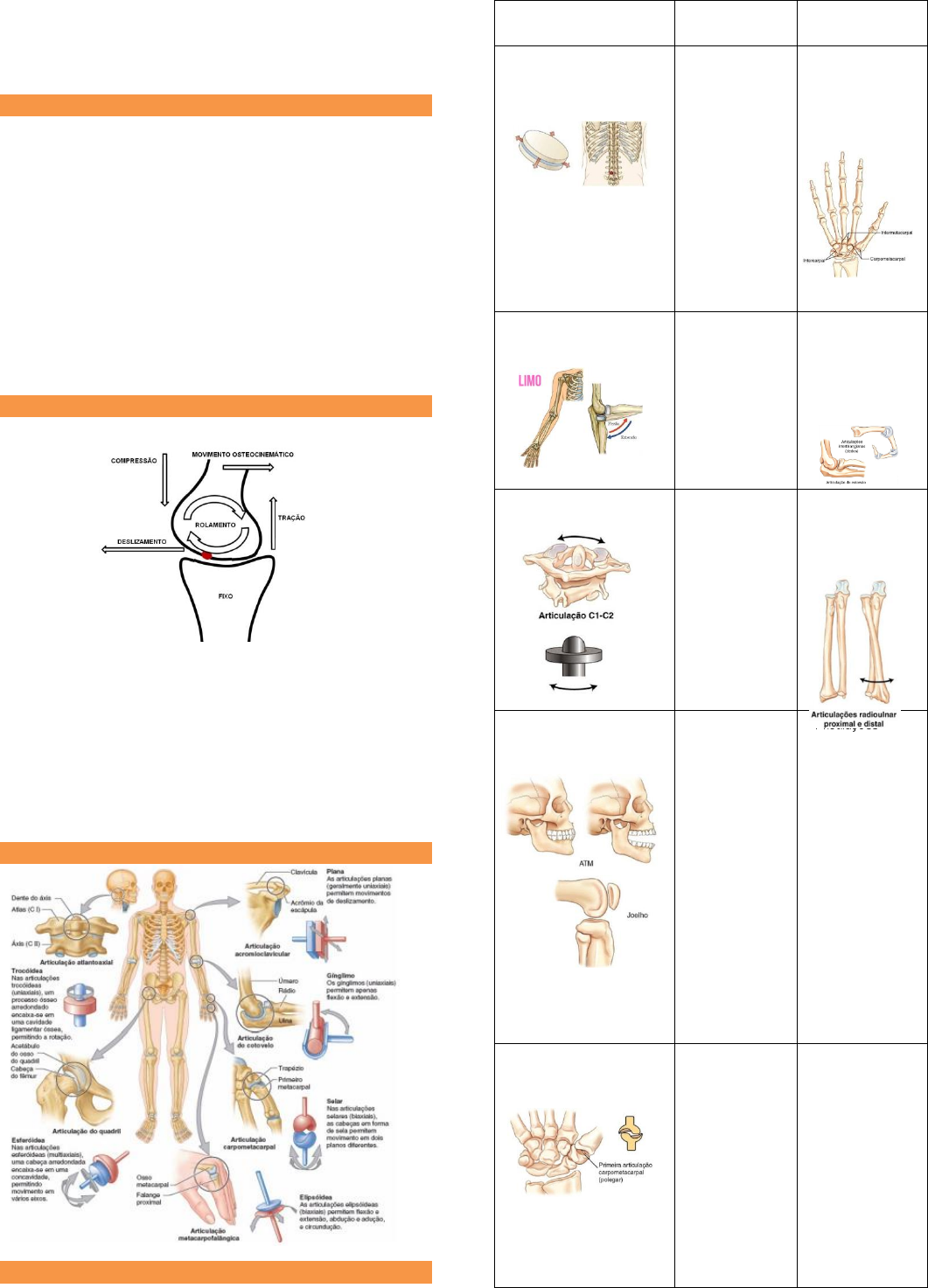 1 @fisiolavinia Cinemática Descrição do movimento sem considerar as forças ou torque que atuam. TIPOS DE MOVIMENTOS: Translatório (linear): As partes de um corpo se movimentam na mesma direção e com igual velocidade Pode ser retilíneo ou curvilíneo. Ex: vértebras Rotatório (angular): Ocorre ao redor de um eixo Segmento adjacente à articulação segue um arco (círculo), cujo centro está no eixo. Os pontos no segmento movem-se a diferentes velocidades lineares. Artrocinemática ARTROCINEMÁTICA: Movimentos das superfícies articulares Os movimentos articulares são comumente produzidos como um resultado da combinação de movimentos acessórios: deslizamento, rolamento e rotação. A incongruência superfícies articulares e a combinação dos movimentos artrocinemáticos faz com que o eixo de movimento mova-se à medida que a posição da articulação se altera. Ex: entorse no pé, acontecendo uma vez, acontece sempre. Importância clínica/prática: rigidez, instabilidade e encurtamento. Terapias: banhos quentes. ARTICULAÇÕES SINOVIAIS: TIPOS DE ARTICULAÇÕES TIPO DE ARTICULAÇÃO CARACTERÍSTICA S EXEMPLOS Plana/Artrodal Superfície chata ou planas justapostas; Realiza movimentos acessórios (deslizamento ou deslizamento- rotação) e não apresenta grau de liberdade articular. Articulações intercarpais e intertarsais e interfacetárias. Gínglimo/Dobradiça/Trocle ar Dobradiça de uma porta. Tem apenas um plano de movimento (flexão/extensão ). Articulações umeroulnar, umerorradial, temporomandibula r e interfalângica. Trocoide/Pivô Maçaneta da porta; Realiza giro em volta de um único eixo de rotação. Articulações radioulnar proximal e atlantoaxial. Condilar/Bicondilar Superfície convexa articulada com uma superfície côncava rasa. Realiza movimento em dois planos de movimentos (flexão/extensão e adução e abdução ou flexão/extensão e rotação medial/lateral) Articulações femorotibial, atlantoccipital e metacarpofalângic a. Selar Cavaleiro sentado numa sela. Movimento em dois planos de movimentos (flexão/extensão e adução e abdução). Uma rotação artrocinemática pode ser Articulações esternoclavicular e carpometacarpal do polegar. 2 @fisiolavinia possível, mas é limitada pela congruência da articulação. Esferóide Bola e soquete. Superfície convexa esférica articulada com uma superfície côncava. Três planos de movimentos (flexão/extensão , adução e abdução e rotação medial/lateral). Articulações glenoumeral e coxofemoral. Elipsoidea Superfície convexa achatada articulada com uma concha côncava. Dois planos de movimento (flexão/extensão e adução e abdução). Articulação radiocarpal. TIPOS DE ARTICULAÇÕES QUANTO AOS GRAUS DE LIBERDADE: Graus de liberdade: numero de planos nos quais uma articulação pode se mover; Uniaxiais (1 grau de liberdade): possui apenas um plano de movimento. São as dos tipos gínglimo/dobradiça, trocoide/pivô. Biaxiais (2 graus de liberdade): podem mover-se em dois planos de movimento. São as do tipo condilar e selar. Triaxiais ou Poliaxiais (2 graus de liberdade): podem se movimentar em 3 ou mais planos de movimento. são as dos tipo: esferoide/enartrose. LEI DO CÔNCAVO-CONVEXO A lei do convexo-côncavo refere-se ao movimento da superfície do osso convexo (móvel) em relação ao osso côncavo, relativamente fixo. Nessa o movimento artrocinemático ocorrerá no sentido oposto do movimento osteocinemático. Já a lei do côncavo-convexo refere-se ao movimento da superfície do osso côncavo (móvel) em relação ao osso convexo, relativamente fixo. Nessa o movimento artrocinemático ocorrerá no mesmo sentido do movimento osteocinemático. B: move-se o osso proximal convexo (deslizamento – para cima); e a flexão (para baixo). C: move-se o osso distal côncavo (para baixo) e a flexão (para baixo) ARTICULAÇÕES DO CORPO E LEI DO CONCÂVO: Na imagem abaixo o osso fixo (escápula) é côncavo e o osso móvel (úmero) é convexo. A lei será convexo-côncavo, onde os movimentos artrocinemático e osteocinemático ocorrem no sentido opostos. Na imagem abaixo o osso fixo (úmero) é convexo e o osso móvel (rádio-ulna) é côncavo. A lei será côncavo-convexo, onde os movimentos artrocinemático e osteocinemático ocorrem no mesmo sentido. Na imagem abaixo o osso fixo (ulna-rádio) é côncavo e o osso móvel (carpo) é convexo. A lei será convexo-côncavo, onde os movimentos artrocinemático e osteocinemático ocorrem no sentido opostos. Na imagem abaixo o osso fixo (quadril) é côncavo e o osso móvel (fêmur) é convexo. A lei será convexo-côncavo, onde os movimentos artrocinemático e osteocinemático ocorrem no sentido opostos. Na imagem abaixo o osso fixo (fêmur) é convexo e o osso móvel (tíbia) é côncavo. A lei será côncavo-convexo, onde os movimentos artrocinemático e osteocinemático ocorrem no mesmo sentido. 3 @fisiolavinia Na imagem abaixo o osso fixo (tíbia) é côncavo e o osso móvel (fêmur) é convexo. A lei será convexo-côncavo, onde os movimentos artrocinemático e osteocinemático ocorrem no sentido opostos. Na imagem abaixo o osso fixo (tíbia-fíbula) é convexo e o osso móvel (calcâneo) é côncavo. A lei será côncavo-convexo, onde os movimentos artrocinemático e osteocinemático ocorrem no mesmo sentido. REABILITAÇÃO OBSERVANDO A LEI 1º escolher o osso que vai mexer. 2º observar o deslizamento articular (artrocinemático) 3º observar movimento osteocinemático. É mais fácil mover o distal. POSIÇÃO DE AJUSTE MÁXIMO E AJUSTE FROUXO: Ajuste máximo (bloqueio): Máxima congruência das superfícies articulares. Maior tensão ligamentar e capsular Maior estabilidade articular e resistência às forças de tração Ocorre no externo da ADM Ajuste frouxo (desbloqueio): As superfícies articulares estão relativamente livres para se moverem uma em relação a outra. Menor tensão ligamentar e capsular Maior “jogo” articular.