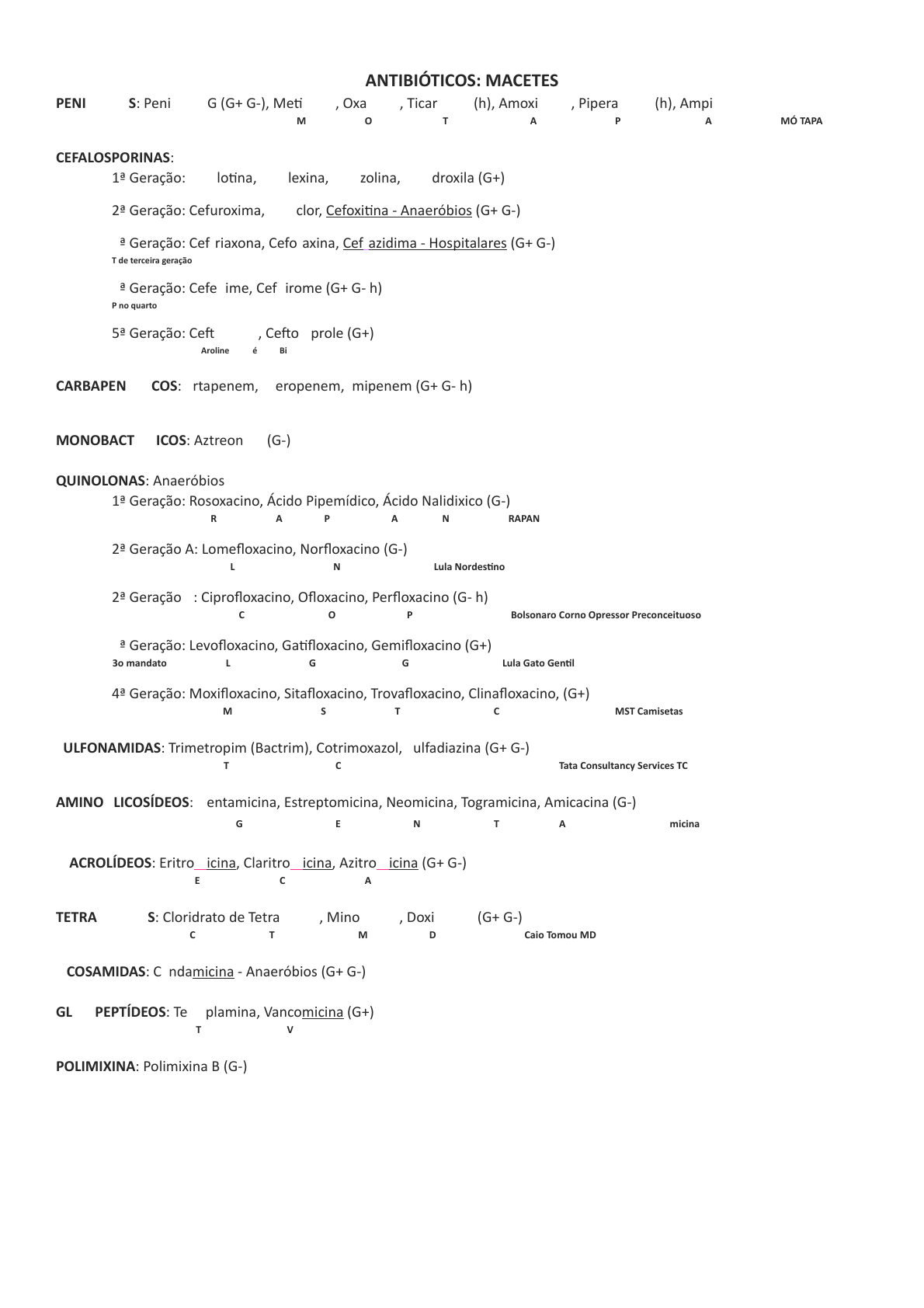 GABRIELLA PACHECO - MED102 ANTIBIÓTICOS: MACETES PENICILINAS: Penicilina G (G+ G-), Me>cilina, Oxacilina, Ticarcilina (h), Amoxicilina, Piperacilina (h), Ampicilina M O T A P A MÓ TAPA CEFALOSPORINAS: 1ª Geração: Cefalo>na, Cefalexina, Cefazolina, Cefadroxila (G+) 2ª Geração: Cefuroxima, Cefaclor, Cefoxi>na - Anaeróbios (G+ G-) 3ª Geração: Ceftriaxona, Cefotaxina, Ceftazidima - Hospitalares (G+ G-) T de terceira geração 4ª Geração: Cefepime, Cefpirome (G+ G- h) P no quarto 5ª Geração: CeTaroline, CeTobiprole (G+) Aroline é Bi CARBAPENÊMICOS: Ertapenem, Meropenem, Imipenem (G+ G- h) E M I carbapenEMIcos MONOBACTÂMICOS: Aztreonam (G-) QUINOLONAS: Anaeróbios 1ª Geração: Rosoxacino, Ácido Pipemídico, Ácido Nalidixico (G-) R A P A N RAPAN 2ª Geração A: Lomefloxacino, Norfloxacino (G-) L N Lula NordesIno 2ª Geração B: Ciprofloxacino, Ofloxacino, Perfloxacino (G- h) B C O P Bolsonaro Corno Opressor Preconceituoso 3ª Geração: Levofloxacino, Ga>floxacino, Gemifloxacino (G+) 3o mandato L G G Lula Gato GenIl 4ª Geração: Moxifloxacino, Sitafloxacino, Trovafloxacino, Clinafloxacino, (G+) M S T C MST Camisetas SULFONAMIDAS: Trimetropim (Bactrim), Cotrimoxazol, Sulfadiazina (G+ G-) T C S Tata Consultancy Services TCS AMINOGLICOSÍDEOS: Gentamicina, Estreptomicina, Neomicina, Togramicina, Amicacina (G-) G E N T A GENTAmicina MACROLÍDEOS: Eritromicina, Claritromicina, Azitromicina (G+ G-) E C A ECA TETRACICLINAS: Cloridrato de Tetraciclina, Minociclina, Doxiciclina (G+ G-) C T M D Caio Tomou MD LICOSAMIDAS: Clindamicina - Anaeróbios (G+ G-) GLICOPEPTÍDEOS: Teicoplamina, Vancomicina (G+) T V TV POLIMIXINA: Polimixina B (G-)