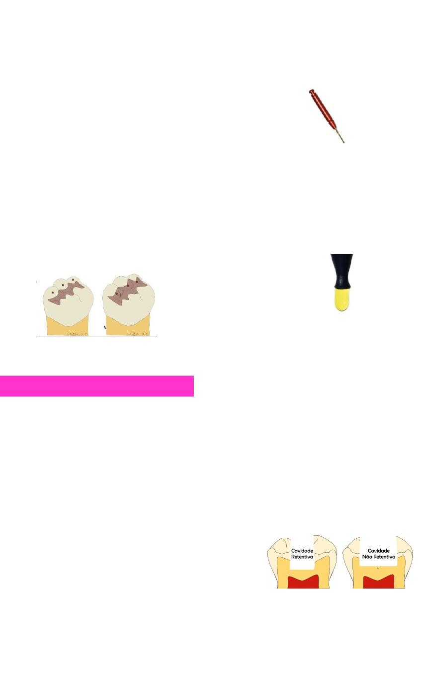 AULA 3- 23/08 Atenção: cheque a oclusão antes de iniciar os preparos cavitários; O paciente não acostuma com restaurações altas, podendo levar a dores na ATM dentre outros; Não deixar sem os pontos de contato, mas sim distribui-los melhor; Forma de retenção Configuração dada a cavidade para prevenir que uma restauração se desloque. Existindo três tipos: · Atrito: restauração de coroa, atritando o material; · Mecânicas adicionais: coloca um pino na cavidade e o material restaurador por cima; · Micromecânicas: sistema adesivo, penetra entre as fibrilas de colágeno · Profundidade: quando a profundidade de uma cavidade for igual ou maior que sua largura vestíbulo-lingual, por si só ela será retentiva; Conformação das paredes circundantes: Paredes convergentes: cavidade retentiva (para restauração direta) Paredes paralelas: cavidade não retentiva, (para restauração direta) Paredes divergentes: cavidade expulsiva: (para restaurações indiretas e próteses) Determinada por: · Inclinação das paredes · Profundidade cavitária · Retenção friccional do material restaurador; · Retenções adicionais · Adesão micromecânica (resina) · Varia de acordo com o material restaurador podendo ser adesivo ou não; Forma de retenção amálgama: Profundidade cavitária: profundidade igual ou maior que a largura vestíbulo-lingual e espessura mínima de 2mm (preparo retentivo) Retenções mecânicas adicionais: para cavidades compostas e ou/ complexas retenções adicionais podem ser necessárias: · Canaletas · Sulcos · Orifícios · Pinos Forma de conveniência Artifícios para facilitar o acesso e visão durante a realização do preparo e restauração; Depende: · Material restaurador · Localização e extensão da cárie Técnicas alternativas de acesso a lesão cariosa: · Slot horizontal: tem que adentrar na cavidade pela proximal, devendo separar um dente do outro com as borrachinhas; · Slot vertical: cárie progredida, acometendo a proximal e crista marginal; · Túnel: cárie começa na proximal e progride até formar esse “túnel” · Separação mecânica Interdentária mediata (necessário para o acesso a cárie) · Separação mecânica Interdentária imediata: separadores mecânicos interdentais; · Isolamento absoluto campo operatório · Proteção do dente vizinho Matriz de aço+ cunha pré fabricada de madeira · Afastamento gengival podendo ser: Mecânico : utilizados fios, afastadores ou grampos; Químico: através de vasos constritores Mecânico- Químico: fios embebidos em vasos construtores ou substancias adstringentes; Evitado na Dentística pois o uso de substancias adstringentes e vasoconstritores pois atrapalha a adesão do material; Remoção do tecido cariado A permanência da cárie após as etapas prévias do preparo cavitário deve ser removida; A dentina cariada pode se apresentar de duas formas: Dentina infectada: amolecida, então consegue ser retirada sem o menor esforço; Dentina afetada: ela apresenta uma rigidez portanto pode ser remineralizada e deve ser preservada; Depressões nas paredes de fundo podem surgir após este procedimento, Elas deveram ser preenchidas com material base para permitir uma melhor distribuição das forças que incidem na restauração; Acabamento das paredes de esmalte Objetivos: · Remover prismas de esmalte fragilizados · Regularizar o ângulo Cavossuperficial · Remoção das irregularidades das paredes internas; · Facilita adaptação do material restaurador; · Melhor vedamento marginal Amálgama Ângulo Cavossuperficial nítido e sem bisel; Resina Composta Ângulo Cavossuperficial nítido e com bisel Para melhor estética e selamento marginal; Somente em dentes anteriores Podendo ser utilizados : Limpeza da cavidade Remover quaisquer debris do preparo cavitário para que o material restaurador em qualquer superfície; Pode lavar com algodão, mas jamais secar com o mesmo, apenas com papel absorvente (filtro de café); Proteção complexo DENTINO-PULPAR “A polpa vive para dentina e a dentina vive das graças da polpa” Desafios clínicos: entrou por slot horizontal pois já havia comprometido a crista e houve uma exposição pulpar. Substrato Dental Dentina: 45% de hidroxiapatita (mineral responsável pela composição inorgânica, desordenado devido a matriz colágena; Esmalte: 92% de hidroxiapatita se rearranjam em prismas ordenados; Dentina A dentina é um tecido de suporte físico do dente; para adesão de materiais é mais complexa; 70% matéria inorgânica (fibrilas de colágeno que pode ser degradado) 2% matéria orgânica 10% água (vem da polpa) Densidade tubular Funciona como um aro de pneu de bicicleta, os filetes metálicos representam os túbulos dentinário; A importância de saber a profundidade de uma cavidade pois isso tem ligação direta com a polpa; · Dentina superficial: 10.000 (poucas embocaduras de tubos) · Dentina média: 30.000 · Dentina profunda: 50.000 A maior complexidade da dentina acarreta em maiores cuidados na obtenção de uma adesão mais efetiva; · Dentina peritubular · Dentina intertubular · Túbulos dentinários · Prolongamento odontoblásticos dentro dos túbulos; · Espaço periodontoblástico Polpa · É um tecido conjuntivo frouxo altamente especializado, (capacidade de dar um STAR nas células odontoblasticas para produzir mais dentina frente a uma agressão) · Ricamente vascularizado, · Inervado · Responsável pela formação e manutenção de dentina · Permite a vitalidade ao dente; Tipos de dentina: · Dentina primaria: constituída anteriormente á erupção do dente · Dentina secundária: constituída após a erupção do dente · Dentina esclerosada: maior mineralização de dentina pré-formada; Houve uma mineralização da dentina pela polpa, fechou os túbulos então houve uma diminuição da permeabilidade e aumento da dureza impedindo que sintam dor e atinjam a polpa; Aspecto mais amarelado porem extremamente dura; Ca