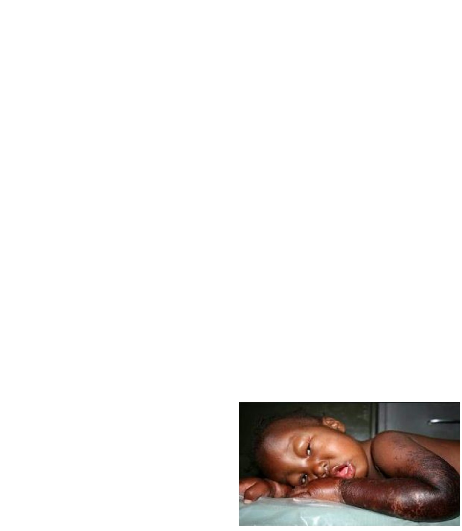 · DESNUTRIÇÃO Desnutrição Proteico Calórica na Infância · Apesar do direito inalienável de todo ser humano de não padecer de fome.... · A desnutrição é a segunda causa de morte mais frequente em menores de 5 anos nos países em desenvolvimento · Pela Organização Mundial de Saúde, a desnutrição é o resultado de uma falta crônica de atenção nutricional e emocional por parte das pessoas que cuidam das crianças, que, por falta de conhecimentos, por pobreza ou por problemas familiares, são incapazes de proporcionar a nutrição e os cuidados que estas requerem. · A desnutrição geralmente se inicia no útero, acomete as crianças e, através das meninas e mulheres, se estende à vida adulta e às próximas gerações, pelo seu efeito negativo aditivo sobre o baixo peso dos bebês. Fatores etiológicos · Baixo nível socioeconômico que está associado a falta de ingestão alimentar; · Más condições ambientais, levando a maior probabilidade de infecções e hospitalizações; · Baixo nível educacional e cultural, levando as crianças a uma privação afetiva e ao desmame precoce; · Desestruturação familiar, sendo muitas vezes os pais separados, a mãe trabalha fora deixando o cuidado da criança para idosos ou pessoas não habilitadas para isto. Manifestações Clínicas · A manifestação clínica da desnutrição pode ser leve, moderada ou grave e dependente do grau e da duração da deficiência alimentar bem como da atuação de fatores predisponentes. · Os sinais e sintomas mais frequentes são a diminuição da atividade física, a parada do crescimento, do ganho de peso e em fases mais avançadas a perda de peso. Formas da Desnutrição Grave · A desnutrição grave quando instalada pode ser classificada em 3 tipos clínicos: marasmo, Kwashiorkor-marasmático e Kwashiorkor. · As crianças que não apresentam as características clínicas do marasmo, mas que apresentam déficit de crescimento, são consideradas desnutridas moderadas ou leves. Desnutrição Kwashiorkor · Retardo no crescimento; · Perda de gordura subcutânea e muscular; · Edema depressível que se localiza principalmente nas pernas, nas crianças que caminham, mas que pode atingir todo o corpo; · Hepatomegalia acentuada devido a esteatose hepática; · Alterações mentais e de humor; · Lesões de cabelos (textura, cor, sem brilho, queda) generalizadas ou localizadas (sinal da bandeira); · Lesões de pele (despigmentação, dermatose de áreas de fricção, descamação) Sinais e Sintomas · Anorexia, diarreia, infecções e deficiências de micronutrientes (vitamina A, zinco, ferro) são frequentes. · A presença de um significante grau de perda de peso e a presença de edema são os aspectos essenciais para o diagnóstico de Kwashiokor. Desnutrição Marasmo · A criança com marasmo avançado tem um aspecto inconfundível. · É muito magra, com evidente perda de massa muscular, extremidades muito delgadas e abdome às vezes proeminente. · A face tem uma aparência de “velho” ou “simiesca”. · Pregas frouxas da pele podem ser vistas, principalmente nas nádegas. · Peso muito baixo (peso por idade inferior a 60% do peso previsto para a idade); · Retardo no crescimento (baixa estatura para a idade); · Gordura cutânea escassa ou ausente; · Diarreia, infecção respiratória, parasitoses e tuberculose comumente estão presentes, bem como sinais de carências de micronutrientes, como xeroftalmia, deficiência de vitamina B, anemia ferropriva e outras; · O estado de ânimo pode ser mais ansioso do que apático; · A temperatura corporal tende à hipotermia. Kwashiorkor – Marasmático · Uma proporção das crianças desnutridas pode apresentar uma forma de desnutrição mista, o Kwashiorkor-marasmático, com características mistas em relação às duas outras formas clínicas. · Geralmente, quando desaparece o edema com o tratamento, pode-se ver que elas são portadoras de marasmo Avaliação do Estado Nutricional · Atualmente, por recomendação da OMS, são utilizados os indicadores: · altura por idade; · peso por altura; · peso por idade Escore Z · Escore Z negativo, indica que a criança está abaixo do padrão de estado nutricional desejável. · Se o escore Z é igual ou inferior a -3 DP, considera-se que existe desnutrição grave; · Se entre 2 a -2,9 DP, desnutrição moderada. Diagnóstico da Desnutrição · O diagnóstico de desnutrição é feito a partir da história clínica da criança, bem como pelo seu exame clínico e determinação do estado nutricional. · A avaliação e cuidadoso acompanhamento clínico da criança é o guia mais importante para o diagnóstico e para definir e monitorizar o tratamento da criança. · A clínica da criança é soberana em todos os momentos do tratamento, inclusive nas situações de impossibilidade de realização ou de dificuldades de interpretações de exames laboratoriais. - peso e altura preferencialmente sem roupa Tratamento da Desnutrição · Na dependência da sua gravidade, as crianças desnutridas podem ser tratadas em hospital, centros de nutrição, ambulatórios e na comunidade/domicílio Tratamento Hospitalar · Devem ser hospitalizadas para tratamento as crianças com manifestações clínicas de Kwashiorkor, Marasmo ou Kwashiorkor-marasmático, cujo peso para a idade (P/I) seja menor que -3DP, associado a inapetência acentuada; · Diarreia e/ou vômitos; · Qualquer infecção associada; · Também devem ser hospitalizadas crianças com DEP grave (P/I < -3DP) que não podem ser referidas para tratamento ambulatorial Fases do Tratamento da Desnutrição · Na fase de estabilização, que vai do 1º ao 7º dia de tratamento, são identificados e tratados os problemas com risco de vida, corrigidas as deficiências específicas, assim como as anormalidades metabólicas, e inicia-se a alimentação. · Na fase de reabilitação, que dura da 2ª até 6ª semana, a criança deve ser alim