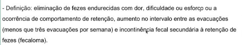 CONSTIPAÇÃO INTESTINAL · Síndrome do intestino irritável: intercala diarreia com constipação; · Evitar introdução de fórmula nas primeiras 48 horas de vida porque pode aumentar risco de alergia a proteína do leite de vaca. · Diquesia do lactente: horas de choro e quando a criança elimina gases ou evacua passa a dor. Geralmente dura até 9 meses. · Em aleitamento materno exclusivo, o bebê pode ficar até 10 dias sem evacuar. · Dobra o joelho da criança sobre o abdome para auxiliar o peristaltismo. Massagem com punho fechado da fossa ilíaca direita até hipocôndrio direito depois vai para hipocôndrio esquerdo. · Coloca a pontinha do supositório no ânus da criança e começa a rodar. Porque isso já estimula o reflexo da evacuação em bebes muito novinhos. · Constipação: se ato de evacuar estiver relacionado com esforço e fazes em síbalos. · O normal do coco do bebe em aleitamento materno exclusivo: é líquido ou pastoso. · Supositório de glicerina mais crianças por exemplo de 1 ano. · Comportamento de retenção: criança tem o estímulo para evacuar e prende as fezes. Aí vai reabsorvendo água das fezes no cólon e com isso fica mais endurecida e dói para evacuar. E com isso a criança prende novamente as fezes para não sentir a dor, pois ela associa o hábito de evacuar com sentir dor (devido fissuras). CICLO VICIOSO DE RETENÇÃO E DOR. · Incontinência fecal: é quanto tenta segurar as fezes mas não conseguiu segurar devido ao fecaloma. E com isso causa eliminação de um ou dois síbalos só para conseguir fazer a contração anal novamente. (tem contração do esfíncter anal voluntária mas não consegue segurar as fezes, e com isso elimina fezes em síbalo). · Sintomas associadas a constipação: dor abdominal e hematoquezia devido fissuras. · Hematoquezia; pode ser secundária a fissura anal. · Até 4 anos, tem que ter dois dos seguintes critérios por pelo menos 1 mês. · Maior de 4 anos, dois dos seguintes critérios pelo menos uma vez por semana por 2 meses. · Perda insensível de fezes: soiling – é perda involuntário e insensível de fezes. ‘’pai fala, dor abdominal com diarreia, os pais vê calcinha ou cueca suja mas a criança não percebeu’’ mas na verdade é soiling devido fecaloma. A criança não percebe que teve perda de fezes. Soiling perda insensível das fezes devido fecaloma. · Encoprese: criança sabe fazer coco só no vaso sanitário, mas evacua em locais inapropriados. Criança sabe que o local certo para fazer coco é no vaso, mas mesmo assim faz coco em locais inapropriados (ex: sala, sofá, loja). Isso é muito comportamental. · A principal queixa que leva uma criança com constipação no PS é DOR ABDOMINAL. · Causa orgânica de constipação: hipotireoidismo, tumor (por isso é importante perguntar de febre e perda de peso) · 50% dos constipados tem massa palpável no hipogastro ou fossa ilíaca esquerda. · Espinha bífida oculta: má formação, não tem um corpo vertebral e pode aparecer um tufo de cabelo. · Prolapso retal SINAIS DE ALERTA CONSTIPAÇÃO: · Doença de hirschsprung (megacolón congênito): pensar quando tem constipação antes do 1 mês de vida. · Não eliminação de mecônio em até 48 horas: suspeitar de ânus imperfurado ou fibrose cística (devido secreções espessas, também pode causar eliminação de mecônio tardio). · Fezes em fita: pensar em tumor fazendo efeito de massa, criança fica constipada e quando consegue evacuar, faz fezes em fita em pouca quantidade. Fezes que muda o formato, tem que pensar. (mudança no formato de fezes). · Mau ganho ponderal, febre, vômitos biliosos · Fraqueza ou hipotonia dos membros: pensar em causa neurológica · Tufo de pelos · Fistulas perianal, posição anormal do ânus: má formações do TGI · Bócio no pescoço: pensar em hipotireoidismo · Escaras anais · Ausência dos reflexos cremastéricos. · Vomito amarelados: biliosos. Não tem comida é aquela coisa amarela. 1) Fecaloma em todo cólon e reto. (desce o colon ascendente) · Atenção para casos de constipação aguda, febre, parou de eliminar fezes, tem distensão abdominal. Ex: pneumonia causando íleo infeccioso que causou diminuição da peristalse e constipação aguda. · Sempre que diagnosticar fecaloma, tem que fazer alguma coisa no pronto atendimento. · Como esvaziar o fecaloma: enema fosfatado (não pode usar antes dos 2 anos), antes dos dois anos pode usar solução de glicerina (10ml/kg-via retal em gotejamento lento para hidratar o fecaloma – máximo 500ml, demora umas 3 ou 4 horas). · Lactentes pode usar minienemas com sorbitol · Primeiro esvaziamento deve ser feito no ambiente hospitalar para aliviar o desconforto da criança. · PEG ou lactulose: pode ser usado por via oral para MANUTENÇÃO. · Aí depois que tratar a fase aguda, aí faz educação e orientação. PARASITOSES INTESTINAIS · Helmintíases transmitidas pelo contaminação fecal do solo; · Quimioprofilaxia: remédio para verme 1 vez por ano. Às vezes até 2 vezes ao ano. Essa orientação é feita com base na prevalência das helmitíase. · Fatores de risco: precisa lavar frutas, verduras e legumes (com hipoclorito de sódio), lavar as mãos, não ingerir carne crua. · Prevalência: ascaridíase (forma bolo de áscaris), tricuríase e giardíase. Podem ser tratadas sem esperar exame de fezes. · Áscaris: duodeno, jejuno e íleo. · Tricurís: colón e reto · Gíardia: duodeno e jejuno · Maioria dos casos de parasitoses são assintomáticas ou pouco sintomáticas. · Sintomas inespecíficos de parasitoses: diarreia, vômito, dor abdominal, distensão abdominal, desnutrição. · Manchas brancas na pele NÃO significa verme, não tem nada a ver com verme. · Giárdia lesa a mucosa e impede a absorção de nutrientes. · Ascaris faz competição alimentar. · Necator e tricurís causam microsangramentos. · Suboclusão ou obstrução intestinal: ascaridíase – bolo de as