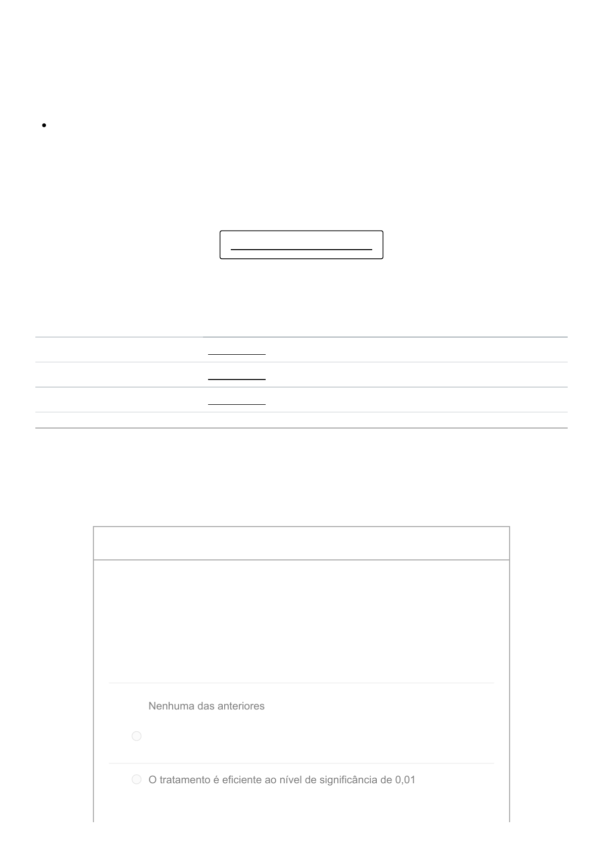 26/09/2021 15:00 Prova Eletrônica: PROBABILIDADE E ESTATÍSTICA https://dombosco.instructure.com/courses/7151/quizzes/20088 1/7 Instruções Histórico de tentativas Tentativa Tempo Pontuação MANTIDO Tentativa 2 38 minutos 30 de 30 MAIS RECENTE Tentativa 2 38 minutos 30 de 30 Tentativa 1 54 minutos 9 de 30 As respostas corretas estarão disponíveis em 9 out em 0:00. Pontuação desta tentativa: 30 de 30 Enviado 26 set em 14:59 Esta tentativa levou 38 minutos. A Prova Eletrônica tem peso 30 e é composta por: 10 (dez) questões objetivas (cada uma com o valor de 3 pontos Você terá 60 (sessenta) minutos para finalizar esta atividade avaliativa e as respostas corretas serão apresentadas um dia após a data encerramento da Prova Eletrônica. Fazer o teste novamente 3 / 3 ptsPergunta 1 Em um teste de medicamentos foram criados dois grupos A e B que consistem de 100 indivíduos (cada) com portadores de determinada doença. Aplica-se um soro ao grupo A, mas não ao grupo B; afora isso os dois grupos são tratados de maneira idêntica. Constata-se que, nos grupos A e B, 75% e 65%, respectivamente, se curam da doença. Teste a hipótese de que o soro é eficiente. Nenhuma das anteriores O tratamento é eficiente ao nível de significância de 0,01 https://dombosco.instructure.com/courses/7151/quizzes/20088/history?version=2 https://dombosco.instructure.com/courses/7151/quizzes/20088/history?version=2 https://dombosco.instructure.com/courses/7151/quizzes/20088/history?version=1 https://dombosco.instructure.com/courses/7151/quizzes/20088/take?user_id=42295 26/09/2021 15:00 Prova Eletrônica: PROBABILIDADE E ESTATÍSTICA https://dombosco.instructure.com/courses/7151/quizzes/20088 2/7 Os resultados são devido ao acaso ao nível de significância de 0,10 O tratamento é eficiente ao nível de significância de 0,05 O tratamento é eficiente ao nível de significância de 0,10 3 / 3 ptsPergunta 2 Em uma rede corporativa de computadores, as conexões dos usuários ao sistema podem ser modeladas como um processo de Poisson, com média de 25 conexões por hora. Qual a probabilidade de que o tempo até a próxima conexão esteja entre 2 e 3 minutos? 0,1366 0,1290 0,1517 0,1441 0,1669 3 / 3 ptsPergunta 3 Uma empresa farmacêutica alega que um medicamento acusou 95% de eficiência em aliviar a dor por um período de 4 horas. Em uma amostra de 100 indivíduos que sofriam de alergia, o remédio deu resultado positivo em 87. Determine se a alegação do fabricante é legítima, ou não? 26/09/2021 15:00 Prova Eletrônica: PROBABILIDADE E ESTATÍSTICA https://dombosco.instructure.com/courses/7151/quizzes/20088 3/7 Nenhuma das anteriores É legítima com um nível de significância de 0,01 Não é legítima com um nível de significância de 0,05, mas é legítima para o nível 0,01 Não é legítima com um nível de significância de 0,05 É legítima com um nível de significância de 0,05 3 / 3 ptsPergunta 4 Em uma pesquisa estatística, realizada em uma turma com 20 alunos, foram obtidos os seguintes pesos (em Kg): 89 99 96 89 101 75 87 90 120 85 115 80 110 116 102 105 109 100 82 110 Com base nos dados coletados, calcule o Coeficiente de Variação dessa pesquisa. 0,1527 0,1627 0,1427 0,1327 0,1727 26/09/2021 15:00 Prova Eletrônica: PROBABILIDADE E ESTATÍSTICA https://dombosco.instructure.com/courses/7151/quizzes/20088 4/7 3 / 3 ptsPergunta 5 Em uma pesquisa estatística, realizada em uma turma com 20 alunos, foram obtidos os seguintes pesos (em Kg): 89 99 96 89 101 75 87 90 120 85 115 80 110 116 102 105 109 100 82 110 Com base nos dados coletados, calcule a Média dessa pesquisa. 75 110 98 120 89 3 / 3 ptsPergunta 6 Em um jogo de dados temos a possibilidade de obter seis números distintos em cada jogada. Qual a probabilidade de no lançamento de dois dados obtermos os números 1 ou 3 nas faces superiores de ambos os dados? 0,33 0,11 0,50 26/09/2021 15:00 Prova Eletrônica: PROBABILIDADE E ESTATÍSTICA https://dombosco.instructure.com/courses/7151/quizzes/20088 5/7 1,00 0,00 3 / 3 ptsPergunta 7 Em uma pesquisa estatística, realizada em um grupo de 20 alunos de uma determinada turma, foram obtidos os seguintes pesos (em Kg): 89 99 96 89 101 75 87 90 120 85 115 80 110 116 102 105 109 100 82 110 Com base nos dados coletados, calcule o Desvio Médio dessa pesquisa. 10,9 8,9 11,9 12,9 9,9 3 / 3 ptsPergunta 8 Uma amostra aleatória de 1000 eleitores de certo distrito eleitoral dá 65% como favoráveis a determinado candidato. 26/09/2021 15:00 Prova Eletrônica: PROBABILIDADE E ESTATÍSTICA https://dombosco.instructure.com/courses/7151/quizzes/20088 6/7 Quais os limites de confiança para a proposição global de eleitores favoráveis ao candidato com base de 99%. 0,61 a 0,69 0,45 a 0,69 0,61 a 0,65 0,45 a 0,61 0,45 a 0,65 3 / 3 ptsPergunta 9 Com base nos dados coletados em uma pesquisa estatística, realizada em uma turma com 20 alunos, foram obtidos os seguintes pesos (em Kg): 89 99 96 89 101 75 87 90 120 85 115 80 110 116 102 105 109 100 82 110 Com base nos dados coletados, qual é o valor Mínimo e Máximo da amostra. 98 e 120 99 e 101 75 e 116 89 e 120 26/09/2021 15:00 Prova Eletrônica: PROBABILIDADE E ESTATÍSTICA https://dombosco.instructure.com/courses/7151/quizzes/20088 7/7 75 e 120 3 / 3 ptsPergunta 10 A altura média de 50 estudantes do sexo masculino que tiveram participação acima da média em competições esportivas de uma universidade é de 170,5cm, com desvio padrão de 6,3cm, enquanto que um grupo de 60 estudantes que não demonstraram interesse em tais competições acusa altura média de 168,8cm com desvio padrão de 7,0cm. Teste a hipótese de que os estudantes que participaram ativamente das competições esportivas são mais altos do que os que não se interessam por elas. Não podemos rejeitar a hipótese de que não há diferenças significativas entre as alturas médias no nível de significância de 0,10 Todas são falsas Podemos rejeitar a hipótese de que não há diferen
