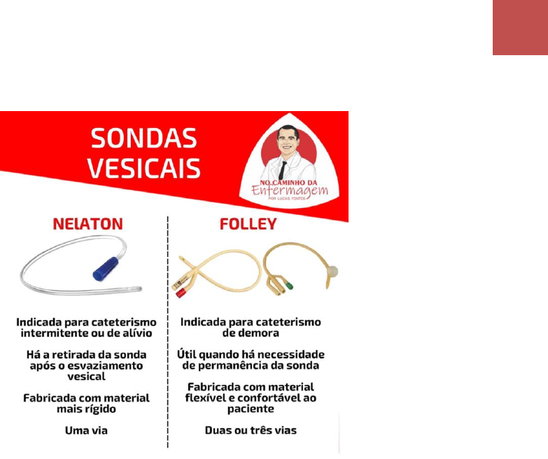 Arlinda Marques M. Dourado – Medicina 2021 1 SONDA VESICAL DE ALÍVO E DEMORA 1. Descrever os procedimentos de cateterismo vesical de demora masculino e feminino no paciente adulto; 2. Realizar os procedimentos de cateterismo vesical de demora masculino e feminino no paciente adulto, considerando as técnicas propedêuticas aplicadas na aula prática; 3. Conhecer os fundamentos relacionados a técnica do cateterismo vesical de demora masculino e feminino no paciente adulto. Cateterismo vesical: É a introdução de um cateter na bexiga, através da uretra para drenagem de urina. Uretral supra-púbica: Uretra feminina= 3 a 4 cm . Uretra masculina aproximadamente 18 cm. INDICAÇÕES: Retenção urinária Pré – operatório Pós – operatório Monitorização do débito urinário Determinação de urina residual bexiga neurogênica Obtenção de urina para exame (CVA) Sistema fechado de drenagem OBJETIVOS: Obter amostras de urina, livre de contaminção (CVA); mpedir a distenção da bexiga (CVD) Manter o cateter nos casos de incontinência urinaria(CVD) Irrigar a bexiga no caso de ressecção trans-uretral de próstata(RTU); P.O. prostatectomia ( CVD 3 vias); Intervir na retenção urinária,controle de diurese. Auxiliar em exames (Cistostomia, Uretrocistografia miccional) Arlinda Marques M. Dourado – Medicina 2021 2 CATETERISMO VESICALDE ALÍVIO MATERIALUTILIZADO: Luvas estéreis. Sonda uretral estéril descartável. Clorexedine Solução 2% Compressas de gaze estéril. Bandeja de materiais estéreis para cateterismo (cuba rim, cúpula, pinça cheron). Campo fenestrado. Frasco para coleta de urina se necessário. Lidocaína gel. PROCEDIMENTO Paciente do sexo feminino 1-Posicionar a paciente confortavelmente. 2-Lavar as mãos. 3-Abrir a bandeja de cateterismo usando a técnica asséptica. Colocar o recipiente para os resíduos em local acessível. 4-Colocar a paciente em posição de decúbito dorsal com os joelhos flexionados, os pés sobre o leito mantendo os joelhos afastados. 5-Calçar as luvas estéreis. 6-Separar, com uma das mãos, os pequenos lábios de modo que o meato uretral seja visualizado; mantendo-os afastados até que o cateterismo termine. 7-Realizar antissepsia da região perineal com clorexedine 2% e gaze estéril com movimentos únicos. 8-Evitar contaminar a superfície da sonda. 9-Realizar o esvaziamento da bexiga totalmente ou coletar a urina caso seja para exame laboratorial. 10-Remover a sonda suavemente, quando a urina parar de fluir. 11-Secar a área, tornar o paciente confortável. Paciente do sexo masculino 1-Lubrificar bem a sonda com lubrificante ou anestésico tópico prescrito. 2-Realizar a assepsia com clorexedine solução 2% e gaze estéril em movimentos únicos da base do pênis até o púbis, e após da base do pênis até raiz da coxa, bilateralmente. Após, da glande até a base, e por último em movimentos circulares sobre o meato, de dentro para fora. 3-Usar as luvas estéreis, introduzir a sonda dentro da uretra até que a urina flua. 4-Realizar o esvaziamento da bexiga totalmente ou coletar a urina caso seja para exame laboratorial. 5-Remover a sonda suavemente, quando a urina parar de fluir. 6-Secar a área, tornar o paciente confortável. 7-Lavar as mãos. 8-Realizar anotação de enfermagem, assinar e carimbar. 9-Registrar procedimento em planilha de produção. 10-Manter ambiente de trabalho em ordem Arlinda Marques M. Dourado – Medicina 2021 3 CATETERISMO VESICALDE DEMORA MATERIAL UTILIZADO Luvas estéreis. Sonda folley estéril descartável. Clorexedine solução 2% Ÿ ompressas de gaze estéril. Lidocaína gel. Coletor de urina de sistema fechado. Bandeja de materiais estéreis para cateterismo (cuba rim, cúpula, pinça cheron). 2 Seringas de 20 ml. Água destilada – ampola ou Soro Fisiológico 0,9% Campo fenestrado. Arlinda Marques M. Dourado – Medicina 2021 4 PROCEDIMENTO Paciente do sexo feminino 1-Posicionar a paciente confortavelmente. 2-Lavar as mãos. 3-Abrir a bandeja de cateterismo usando a técnica asséptica. Colocar o recipiente para os resíduos em local acessível. 4-Colocar a paciente em posição de decúbito dorsal com os joelhos flexionados, os pés sobre o leito mantendo os joelhos afastados. 5-Calçar as luvas estéreis. 6-Separar, com uma das mãos, os pequenos lábios de modo que o meato uretral seja visualizado; mantendo-os afastados, até que o cateterismo termine. 7-Realizar antissepsia da região perineal com clorexedine solução 2% e gaze estéril com movimentos únicos: Horizontalmente, do meato até monte de Vênus. A seguir, verticalmente do meato até final da comissura labial posterior, inicialmente sobre grandes lábios, após entre grandes e pequenos lábios e, por último, em movimentos circulares sobre o meato, de dentro para fora. 8-Lubrificar bem a sonda com lubrificante ou anestésico tópico prescrito. 9-Introduzir a sonda pré-conectada a um coletor de drenagem de sistema fechado, bem lubrificada por 5 a 7 cm no meato uretral, utilizando técnica asséptica estrita. 10-Tracionar suavemente a sonda até sentir até sentir resistência. 11-Insuflar o balonete com água destilada (aproximadamente 10 ml), certificando-se de que a sonda está drenando adequadamente. 12-Fixar a sonda de demora, prendendo-a juntamente com o equipo de drenagem na coxa. 13- Secar a área e manter paciente confortável. 14-Lavar as mãos. 1 5-Realizar anotação de enfermagem, assinar e carimbar. 16-Registrar procedimento em planilha de produção. 17-Manter ambiente de trabalho em ordem. Paciente do sexo masculino 1-Lubrificar bem a sonda com lubrificante ou anestésico tópico prescrito. 2-Realizar a antissepsia com clorexedine solução 2% e gaze estéril em movimentos únicos da base do pênis até o púbis, e após da base do pênis até raiz da coxa, bilateralmente. Após, da glande até a base, e por último em movimentos circulares sobre o meato, de dentro para fora. 3-Introduzir a sonda dentro da uretra