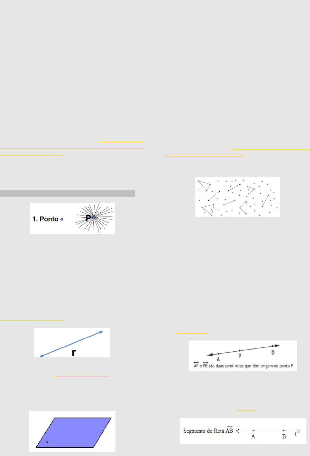 Geometria Plana: Entes primitivos, medidas e distâncias Prof.ª: Rafael Câmera Temas: definição, retas, construções geométricas e estudo do ângulo. Entes Geométricos Tem-se os conceitos de: a) Ponto O ponto geométrico não tem dimensão, sendo representado por uma letra maiúscula do alfabeto. Segundo Gomes Filho, é a unidade mais simples e irredutivelmente mínima da comunicação visual. Ele determinará a posição espacial, assim, existe apenas se relacionado a outros elementos. “Por um ponto passam infinitas retas”. b) Linha Não pode ser medida (imensurável), não possuindo início nem fim. É determinada por uma letra minúscula do alfabeto. São compostas por infinitos pontos, podendo ser definida por 2. Podem ser retas ou curvas. É definida por Gomes Filho como uma sucessão de pontos. c) Plano É resultado da união de linhas, formando uma superfície. Dessa forma, um mesmo plano contém infinitos pontos e linhas. É imensurável, sem início ou fim. São determinados através do uso de letras do alfabeto grego: ß, Ø, Ù, á, ë, ö, ∏, entre outras. d) Espaço Definido como o conjunto de todos os pontos, retas e planos. É tridimensional. Assim, o mais importante é entender que: · O ponto determina uma posição no espaço; · A linha é o resultado do deslocamento de um ponto; · A superfície é resultado do deslocamento de uma linha. e) Semi-reta Qualquer um dos pontos pertencentes a uma reta divide esta em 2 semi-retas. Exemplo: o ponto P marca a origem das semi-retas A e B. Assim, elas tem início mas não tem fim, são infinitas. f) Segmento de reta Tem definição parecida com a de semi-reta, se diferenciado por ter seu fim determinado. Isto é, um segmento de reta é uma linha finita e limitada. Além disso, as retas podem ter diferentes posições, são elas: · Vertical · Horizontal · Oblíqua/inclinada · Perpendicular – em ângulo reto, 90º; · Paralelas – retas com mesma distância esse si mas que nãos e tocam; · Oblíquas/concorrentes – retas que se cruzam formando um ângulo; · Colineares – segmentos que pertencem à mesma reta; · Consecutivos – segmentos onde a extremidade de um é a origem de outro; · Co planares – retas pertencentes ao mesmo plano; · Coincidentes – retas paralelas com disTãncia 0, coicindindo em todos os pontos. E, por último, o eixo, definido como uma linha imaginária que existe no centro de alguns objetos e figuras. Como o eixo horizontal x, e o vertical, y. Construções geométricas *Resolução de exercícios É importante ressaltar o conceito de mediatriz. Mediatriz será a reta que passa pelos pontos 1 e 2, formando o ponto médio “M” de AB. Sua propriedade é dividir um segmento em duas partes. Estudo do ângulo Ângulo é a região do plano limitado por duas semi-retas que concorrem em um ponto “O”. Possui 3 elementos: 1) Vértice – ponto de origem comum das 2 semi-retas. 2) Lado – cada uma das semi-retas. 3) Abertura – região angular entre 2 semi-retas, delimitando o próprio ângulo. A unidade de medida do ângulo é o grau, representado pelo símbolo de xº. O instrumento de medida é o transferidor, tendo os elementos de: a) Graduação ou limbo - circunferência ou semi circunferência externa, podendo medir 180º ou 360º. b) Linha de fé – base retilínea do transferidor. c) Centro – ponto médio da linha de fé. Quanto à classificação, os ângulos se dividem de acordo a sua abertura: · Agudo (acutângulo) - é o ângulo que mede menos que 90º. · Obtuso (obtusângulo) - possui abertura maior que 90°. · Reto (retângulo) - é o ângulo que mede 90º. · Raso (meia volta) - é o ângulo que mede 180º. · Pleno - é o ângulo que mede 360°. · Nulo - é o ângulo com abertura igual a 0° · Congruentes: dois ou mais ângulos são congruentes quando têm aberturas iguais. · Consecutivos - são aqueles que possuem o mesmo vértice e um lado em comum. AOC e BOC são ângulos consecutivos. OC é o lado comum. · Adjacentes - são ângulos consecutivos que não têm pontos internos comuns. AOB e BOC são ângulos adjacentes. · Opostos pelo vértice - na figura, os dois ângulos de 64º são opostos pelo vértice. De igual modo, os ângulos de 116º. Dessa forma, são congruentes entre si. · Complementares – quando a soma de suas medidas é igual a 90°. Por exemplo: 30 e 60, 70 e 20, 4 e 86, 25 e 43 e 22. · Suplementares - quando a soma de suas medidas é igual a 180°. Por exemplo: 130 e 50, 70 e 110, 34 e 146, 65 e 48 e 67. · Replementares – quando a soma de suas medidas é igual a 360º. Por exemplo: 300 e 60, 70 e 290, 47 e 313, 20 e 195 e 40 e 105. Sobre o transporte de ângulo, é importante ressaltar o conceito de bissetriz. Bissetriz será a semi reta que divide um ângulo em dois congruentes.
