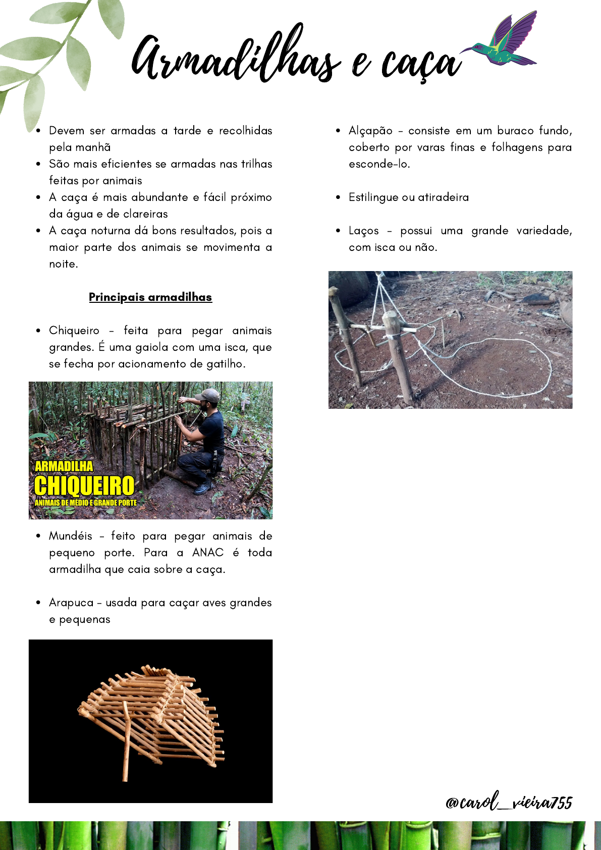 Armadilhas e caça Devem ser armadas a tarde e recolhidas pela manhã São mais eficientes se armadas nas trilhas feitas por animais A caça é mais abundante e fácil próximo da água e de clareiras A caça noturna dá bons resultados, pois a maior parte dos animais se movimenta a noite. Chiqueiro - feita para pegar animais grandes. É uma gaiola com uma isca, que se fecha por acionamento de gatilho. Principais armadilhas Mundéis - feito para pegar animais de pequeno porte. Para a ANAC é toda armadilha que caia sobre a caça. Arapuca - usada para caçar aves grandes e pequenas Alçapão - consiste em um buraco fundo, coberto por varas finas e folhagens para esconde-lo. Estilingue ou atiradeira Laços - possui uma grande variedade, com isca ou não. @carol_vieira755
