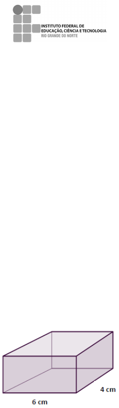 Campus Avançado Parelhas Professores: Fábio Dantas / Renan Fernandes Lista de Volumes 1 - (IFRN - 2018) Um fazendeiro contratou 19 caminhões com a mesma capacidade de carga, para transportar um total de 456m3 de madeira. Suponha que cada caminhão fez apenas uma viagem, transportando sempre sua capacidade máxima. O volume de madeira, em dm3, que cada caminhão transportou foi de A) 24.000. B) 2.400. C) 240. D) 24. 2 - (IFRN - 2017) Uma caixa para transporte e armazenamento de vacina da dengue contém 12 frascos com 6ml do líquido em cada um deles. O conteúdo líquido dos 12 frascos foi despejado em um recipiente em forma de paralelepípedo retângulo, conforme ilustrado na Figura. Se a face, com dimensões 6 cm x 4 cm desse recipiente, está assentada sobre uma mesa plana paralela ao solo, então, a altura do nível do líquido contido no recipiente é igual a A) 1 cm. B) 2 cm. C) 3 cm. D) 4 cm. 3 - IFRN - 2016 Devido ao crime ambiental, em Mariana, que afetou 4 cidades do Espírito Santo, o sistema de abastecimento de água foi comprometido e, por isso, foi necessário distribuir caixas d´água em forma de um paralelepípedo de base quadrada, cujo lado mede 80cm e cuja altura mede 60cm. Com essas medidas, a capacidade de cada caixa d?água é A) 238 litros. B) 294 litros. C) 368 litros. D) 384 litros. 4 - (IFRN - 2012) Oito agricultores de uma região doam água para uma escola da comunidade. Cada um contribui com litros de água por dia para encher a caixa d?água, que tem formato de paralelepípedo retângulo com as seguintes dimensões: 90 cm de altura; 1,5 m de comprimento; e 1,1 m de largura. Assim, para encher completamente a caixa d’água da escola, cada agricultor doa, por dia, cerca de A) 215 litros. B) 198 litros. C) 165 litros. D) 186 litros. 5 - (IFRN - 2011) No dia 21 de setembro de 2010, o campus Pau dos Ferros do IFRN comemorou seu primeiro aniversário. Para a comemoração, foram organizadas várias atividades e um lindo bolo com a logomarca do Instituto. Considere que o bolo tinha o formato de um paralelepípedo retoretângulo de dimensões 120 cm de comprimento, 60 cm de largura e 20 cm de altura. O bolo foi distribuído por inteiro e em fatias de igual volume para os 850 alunos participantes da cerimônia, podemos afirmar que cada um deles recebeu A) 136,00 cm3 de bolo. B) 143,82 cm3 de bolo. C) 152,25 cm3 de bolo. D) 169,41 cm3 de bolo. 6 - (IFRN - 2012) Em um curso de alfabetização de adultos, para a conclusão da primeira turma, foram confeccionadas canecas comemorativas. Cada um desses utensílios tinha forma cilíndrica com 12 cm de altura e base com 9 cm de diâmetro em seu interior. Considerando π = 3,14, podemos afirmar que a capacidade máxima de cada caneca era, aproximadamente, de A) 763 ml. B) 502 ml. C) 550 ml. D) 600 ml. 7 - (IFRN - 2012) No pátio de uma escola para jovens e adultos, a partir de sugestões de alunos, foram construídos bancos de concreto na forma de paralelepípedos retângulos, com as seguintes dimen- sões: 120 cm de largura, 50 cm de altura e 60 cm de comprimento. Para construir 8 bancos com essas características, podemos afirmar que o volume gasto em concreto foi, no mínimo, de a) 2,88 m3. b) 3,65 m3. c) 2,68 m3. d) 5,14 m3. 8 - (IFRN - 2012) Para simbolizar o respeito dos cinco continentes à raça humana, os governantes de uma grande cidade decidiram erguer um monumento de concreto, formado por cinco colunas de base circular, medindo 50 cm de diâmetro por 3,3 m de altura cada. Considerando π = 3,14, o volume de concreto necessário para construir essas colunas foi aproximadamente de A) 1,1 m3. B) 1,7 m3. C) 2,9 m3. D) 3,2 m3. 9 - (PROITEC 2011) A caixa d?água de uma escola tem a forma de um cilindro circular reto e mede 0,90 m de raio na base e 2,40 m de altura. Essa caixa comporta, aproximadamente, (use π = 3,14) A) 1,4m3 de água. B) 2,4m3 de água. C) 6,1m3 de água. D) 8,5m3 de água. 10 - (PROITEC 2012) Uma caixa para DVD tem formato de paralelepípedo retângulo de dimensões 20,5 cm por 14 cm por 1,8 cm. O volume ocupado por três caixas de DVDs com essas medidas é de A) no máximo igual a 721,50 cm3 B) exatamente igual a 360,75 cm3 C) no mínimo igual a 1.549,8 cm3. D) exatamente igual a 1.150,25 cm3.
