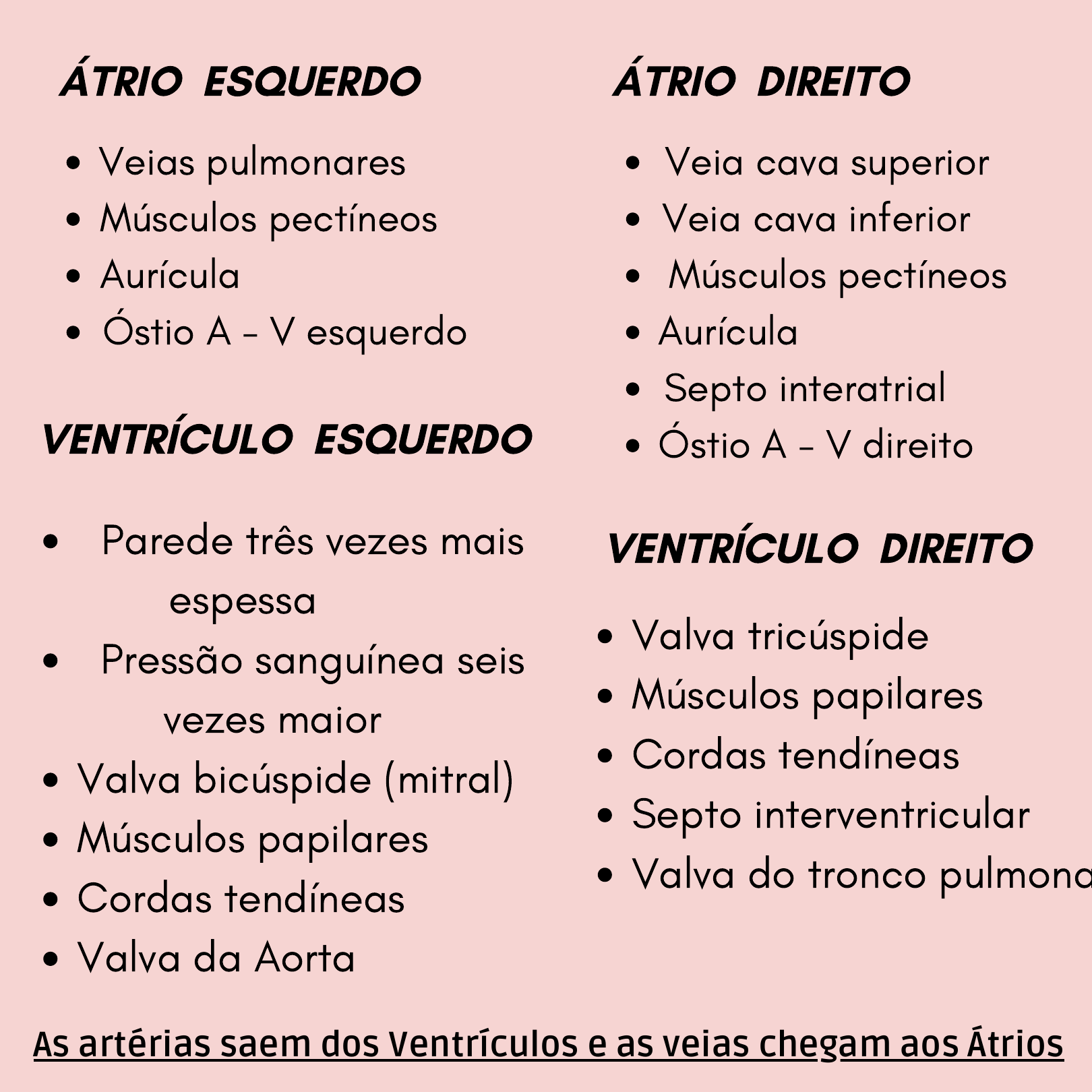 ÁTRIO DIREITO Veia cava superior Veia cava inferior Músculos pectíneos Aurícula Septo interatrial Óstio A - V direito ÁTRIO ESQUERDO Veias pulmonares Músculos pectíneos Aurícula Óstio A - V esquerdo VENTRÍCULO DIREITO Valva tricúspide Músculos papilares Cordas tendíneas Septo interventricular Valva do tronco pulmona VENTRÍCULO ESQUERDO Parede três vezes mais espessa Pressão sanguínea seis vezes maior Valva bicúspide (mitral) Músculos papilares Cordas tendíneas Valva da Aorta As artérias saem dos Ventrículos e as veias chegam aos Átrios