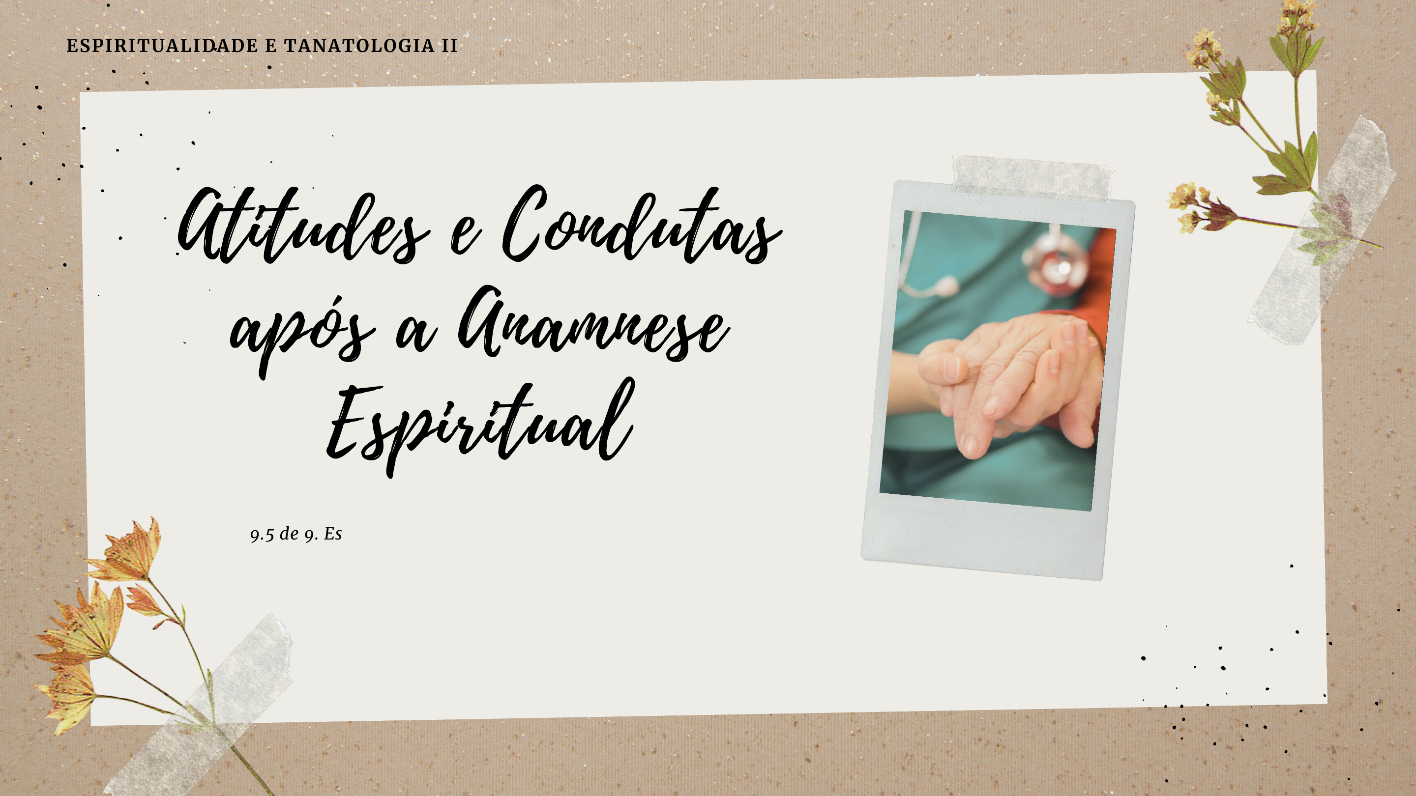Atitudes e Condutas após a Anamnese Espiritual ESPIRITUALIDADE E TANATOLOGIA II 9.5 de 9. Espiritualidade e Fatores Psicossociais em Medicina Cardiovascular ALINE IAMARINO, JADDY CAROLINE, LETICIA FLORES, LÍVIA SANTOS E MATHEUS DURAN. 9.2.5. Atitudes e Condutas após a Anamnese Espiritual Com as informações da dimensão espiritual dos pacientes, é possível estabelecer novas possibilidades de entendimento da fisiopatologia da enfermidade e consequente intervenção médica. Algumas linhas gerais podem ser estabelecidas: Introdução Atualização da Diretriz de Prevenção Cardiovascular da Sociedade Brasileira de Cardiologia – 2019- 9.5 Questões religiosas são delicadas e nem sempre objetivas a ponto de comportar uma resolução plausível, ainda que possam ter grande importância para o paciente. Muitas vezes, a melhor conduta consiste apenas em oferecer sua empatia e compreensão; Empatia 1 Respeito Não tomar nenhuma ação 2 PrevençãoIncorporar espiritualidade na saúde preventiva: O médico pode estimular o paciente a usar sua espiritualidade como ferramenta de prevenção as doenças, ao exercer atividades como oração e meditação; 3 Enfrentament o Incluir espiritualidade no tratamento adjuvante: O médico pode ajudar o paciente a identificar aspectos espirituais que, juntamente com o tratamento padrão, possam auxiliar no desfecho da doença; no caso de doenças graves o médico, após a coleta da história espiritual, pode ajudar o paciente a encontrar significado, aceitar a doença, e enfrentar a situação usando os seus recursos espirituais da melhor forma; 4 AdaptaçãoModificar o plano de tratamento: Cabe ao médico compreender que o paciente tem autonomia de poder modificar o plano terapêutico com base em suas crenças religiosas e assim propor modificações no rumo do tratamento. Por exemplo, apoiar técnicas de meditação como uma opção à dor crônica, mudar planos de tratamento quimioterápico, buscar suporte da comunidade. 10 de agosto de 2021Espiritualidade e Tanatologia II Tenha um ótimo dia! Obrigado!! 10 de agosto de 2021Espiritualidade e Tanatologia II Referências * https://www.scielo.br/j/pe/a/6QBFP9YLtTmtMgMhYfFjjNs/abstract/? lang=pt#:~:text=La%20experiencia%20subjetiva%20de%20la%20pr%C3% A1ctica%20de%20meditaci%C3%B3n&text=Conclui%2Dse%20que%20a% 20experi%C3%AAncia,para%20o%20desenvolvimento%20psicol%C3%B3gi co%20saud%C3%A1vel. https://www.scielo.br/j/rpc/a/HCc9kdndvxXFjdXZtfpdGyP/?lang=pt