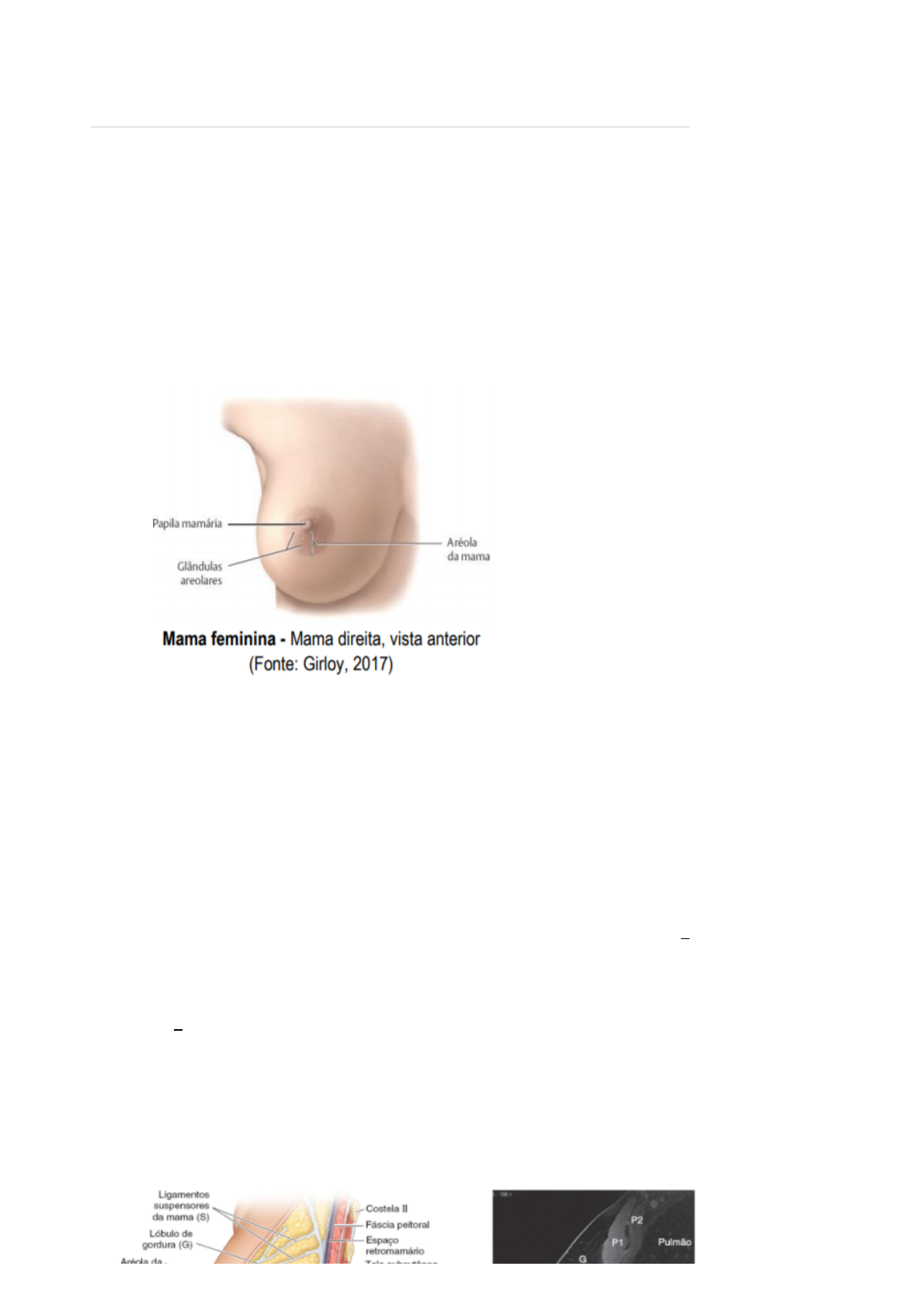 27/09/2021 10:28 OneNote https://onedrive.live.com/redir?resid=8324C4DE991344CF%211677&page=View&wd=target%28LMF.one%7C%2F%2810%5C%2F08%5C%2F… 1/15 (10/08/2020)Aula 29 °–° UCX: Aspectos Anatômicos, histológicos e Fisiológicos das Glândulas Mamárias segunda-feira, 10 de agosto de 2020 14:54 Aula 29 – UCX: Aspectos Anatômicos, histológicos e Fisiológicos das Glândulas Mamárias Objetivo da aula - Reconhecer estruturas anatômicas, histológicas, citológicas e do desenvolvimento das mamas. Entender as principais doenças da mama. Objetivos específicos da aula - Compreender o desenvolvimento das mamas; - Identificar as diferentes estruturas que compõem as mamas; - Relação anatômica com os músculos da parede torácica; - Drenagem venosa e linfática - Compreender a importância da mamografia digital - Estudar as alterações que ocorrem das mamas durante a vida reprodutiva; - Entender as principais doenças associadas. CHECK-LIST Seção Anatomia 1. De acordo com a representação anatômica da mama caracterize as estruturas: a) Aréola da mama: A aréola demonstra pequenas elevações pontuais em sua superfície, que são produzidas pelas muitas glândulas areolares. Estas são em sua maioria glândulas sudoríparas e sebáceas, bem como glândulas mamárias modificadas, chamadas de glândulas de Montgomery. As glândulas mamárias estão localizadas na tela subcutânea, sobre os músculos peitorais maior e menor. Na parte mais proeminente da mama está a papila mamária, circundada por uma área cutânea pigmentada circular, a aréola. A pigmentação areolar aumenta durante o segundo mês de gravidez. A extensão da aréola e seu grau de pigmentação são variáveis. b) Papila mamária: A papila mamária é circundada pela aréola pigmentada, ligeiramente elevada e circular, cuja cor depende da cor da pele. Às vezes há inversão (retração) de uma ou ambas as papilas; essa pequena anomalia congênita pode dificultar a amamentação. Em homens e em mulheres nulíparas jovens – aquelas que nunca tiveram um filho viável – com mamas de tamanho médio, a papila mamária situa-se anteriormente ao 4o espaço intercostal, distante aproximadamente 10 cm da LMA. Em geral, porém, a posição das papilas varia muito com o tamanho da mama, sobretudo em mulheres multíparas – aquelas que deram à luz duas ou mais crianças. Assim, tendo em vista as variações no tamanho e formato, as papilas não servem como referência segura para localizar o 4o espaço intercostal em mulheres adultas. c) Glândulas areolares : glândulas areolares (glândulas sebáceas na pele da aréola). A aréola contém glândulas sebáceas, glândulas sudoríparas e glândulas mamárias modificadas (glândulas de Montgomery). Acredita-se que as glândulas de Montgomery produzam uma secreção lubrificante e protetora que modifica o pH da pele e inibe o crescimento microbiano assim como também hidratam a papila mamária, evitando rachaduras e possíveis infecções. 27/09/2021 10:28 OneNote https://onedrive.live.com/redir?resid=8324C4DE991344CF%211677&page=View&wd=target%28LMF.one%7C%2F%2810%5C%2F08%5C%2F… 2/15 Roteiro do Laboratório Morfofuncional 2 2. Observe a figura abaixo e descreva a relação entre o posicionamento da mama e as estruturas torácicas: As mamas são as estruturas superficiais mais proeminentes na parede anterior do tórax, sobretudo nas mulheres. As mamas são formadas por tecido glandular e tecido fibroso de sustentação integrados a uma matriz adiposa, junto com vasos sanguíneos, vasos linfáticos e nervos. Homens e mulheres têm mamas; normalmente, elas só são bem desenvolvidas em mulheres. As glândulas mamárias estão localizadas na tela subcutânea, sobre os músculos peitorais maior e menor. Na parte mais proeminente da mama está a papila mamária, circundada por uma área cutânea pigmentada circular, a aréola. As glândulas mamárias presentes nas mamas estão relacionadas com a reprodução nas mulheres. Nos homens, são rudimentares e não funcionais formadas apenas por alguns pequenos ductos ou cordões epiteliais. Em geral, a gordura presente em mamas masculinas não é diferente da tela subcutânea encontrada em outras partes do corpo, mas normalmente não há desenvolvimento do sistema glandular. A gordura ao redor do tecido glandular determina o tamanho das mamas não lactantes. O corpo aproximadamente circular da mama feminina fica apoiado sobre um leito que se estende transversalmente da margem lateral do esterno até a linha axilar média e verticalmente da costela II a VI. Dois terços do leito são formados pela fáscia peitoral sobre o músculo peitoral maior; o outro terço, pela fáscia que cobre o músculo serrátil anterior. Entre a mama e a fáscia peitoral há um plano de tecido conjuntivo frouxo ou espaço potencial – o espaço retromamário. Esse plano, que contém pouca gordura, permite que a mama tenha algum grau de movimento sobre a fáscia peitoral. Uma parte menor da glândula mamária pode estender-se ao longo da margem inferolateral do músculo peitoral maior em direção à fossa axilar, formando um processo axilar ou cauda de Spence. O processo axilar pode aumentar durante o ciclo menstrual. 27/09/2021 10:28 OneNote https://onedrive.live.com/redir?resid=8324C4DE991344CF%211677&page=View&wd=target%28LMF.one%7C%2F%2810%5C%2F08%5C%2F… 3/15 3. Sobre o exame físico descreva os aspectos relacionados a inspeção e palpação da mama: O exame físico mamário é dividido em três etapas distintas, quais sejam: INSPEÇÃO (estática e dinâmica), PALPAÇÃO (cadeias linfáticas, mamas e outras estruturas) e terminamos com a EXPRESSÃO MAMÁRIA. Inspeção Estática: para esta etapa do exame físico, a paciente deverá estar em posição ortostática ou sentada, com os braços soltos ao longo do corpo, conforme pode ser observado na Figura 1. Lembrar que nas pacientes com mamas muito volumosas, e/ou muito flácidas, devemos ele
