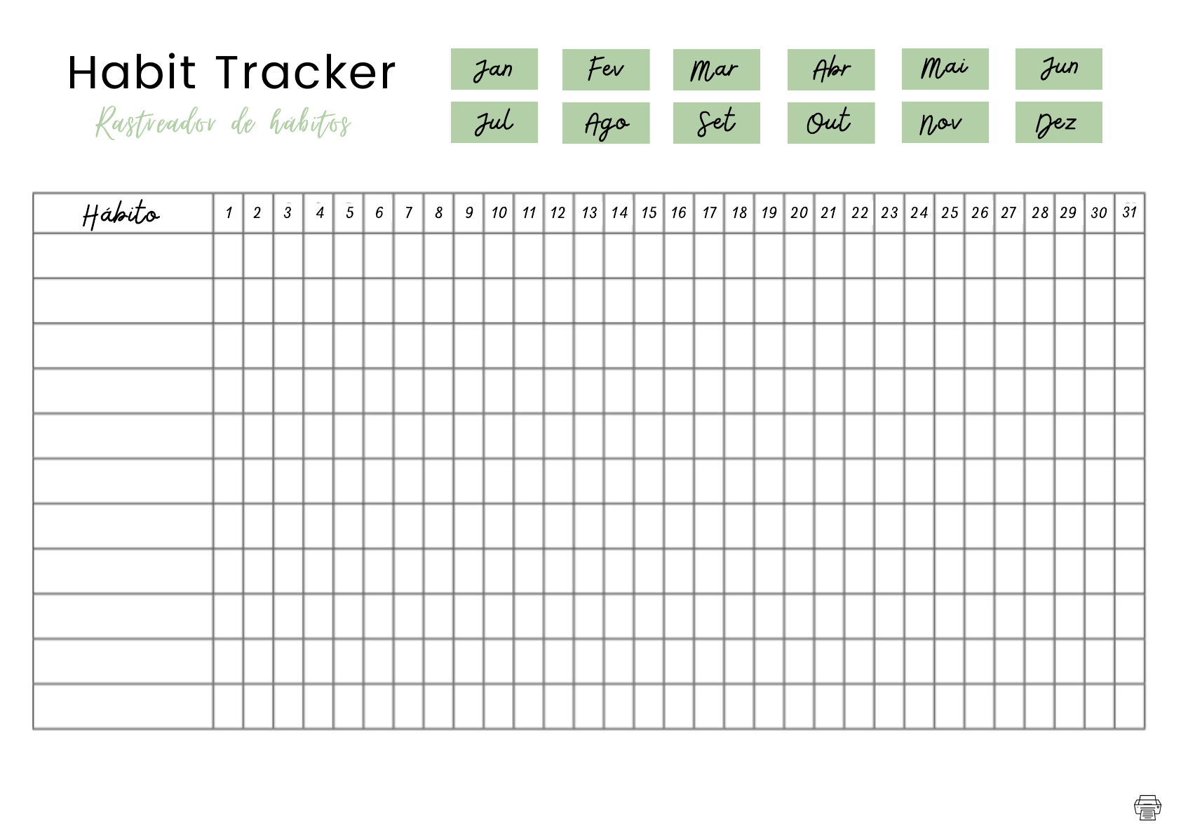 Rastreador de hábitos Habit Tracker Hábito 1 2 3 4 5 6 7 8 9 10 11 12 13 14 15 16 17 18 19 20 21 22 23 24 25 26 27 28 29 30 31 Jan Fev Mar Abr Mai Jun Jul Ago Set Out Nov Dez