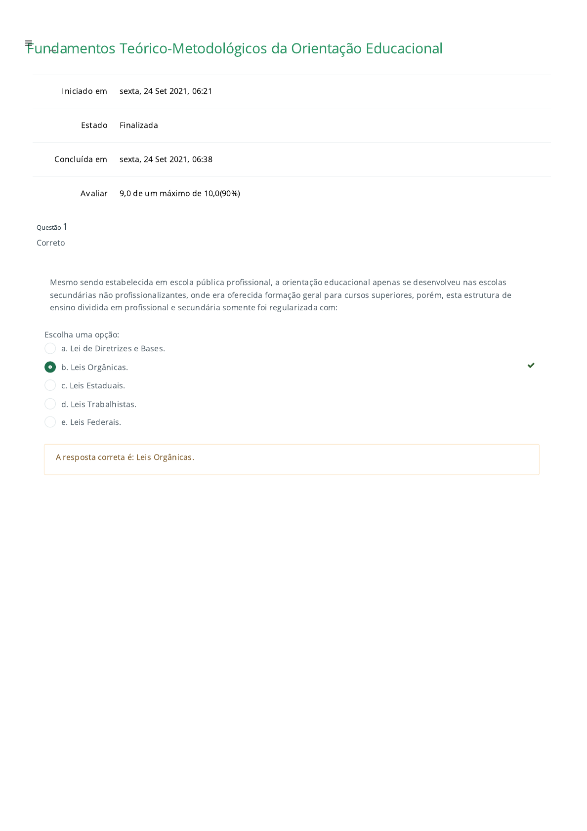 Fundamentos Teórico-Metodológicos da Orientação Educacional Iniciado em sexta, 24 Set 2021, 06:21 Estado Finalizada Concluída em sexta, 24 Set 2021, 06:38 Avaliar 9,0 de um máximo de 10,0(90%) Questão 1 Correto Mesmo sendo estabelecida em escola pública pro�ssional, a orientação educacional apenas se desenvolveu nas escolas secundárias não pro�ssionalizantes, onde era oferecida formação geral para cursos superiores, porém, esta estrutura de ensino dividida em pro�ssional e secundária somente foi regularizada com: Escolha uma opção: a. Lei de Diretrizes e Bases. b. Leis Orgânicas. c. Leis Estaduais. d. Leis Trabalhistas. e. Leis Federais. A resposta correta é: Leis Orgânicas. https://aula.fael.edu.br/ Questão 2 Incorreto Questão 3 Correto Sabe-se que a Orientação Educacional deve ser vista como a área que pode caminhar junto com todos que buscam uma educação de melhor qualidade e, se possível, numa dimensão mais ampla de um mundo melhor (GRINSPUN 2003, p. 93) e que a necessidade de aperfeiçoar o processo de seleção motivou a criação dos primeiros Escritórios de Orientação Pro�ssional. Com relação á orientação pro�ssional o que não é correto a�rmar: Escolha uma opção: a. A orientação pro�ssional originou-se nos países subdesenvolvidos, aprimorando seus procedimentos, principalmente nos períodos pós guerra. b. A orientação pro�ssional desenvolveu-se baseada nas recentes formulações da psicologia diferencial, a qual criou os testes psicológicos de inteligência. c. A orientação pro�ssional amplia e aperfeiçoa o processo de seleção, fazendo com que as pessoas procurem emprego partindo de suas habilidades. d. A orientação pro�ssional antes realizada fora da escola passou a atuar dentro dela, para orientar os alunos a direcionarem seus estudos de acordo com suas aptidões. e. A orientação pro�ssional é realizada por instituições exteriores à empresa, convence os indivíduos que, obter ou não um emprego depende somente de suas habilidades. A resposta correta é: A orientação pro�ssional originou-se nos países subdesenvolvidos, aprimorando seus procedimentos, principalmente nos períodos pós guerra. De acordo com a orientação educacional, a formação pro�ssional parte da formação do homem então, a escolha da pro�ssão, seu desempenho e ajustamento na pro�ssão escolhida dependerão da sua personalidade. O orientador é incumbido de formar o cidadão responsável e transformador. Assim, baseada nas ideias apresentadas analise as descrições abaixo e assinale aquelas que melhor apresentam características do orientador educacional: I. Auxiliar o educando a tornar-se consciente e autônomo. II. Auxiliar o aluno, na identi�cação de seu processo de consciência dos fatores socioeconômico politico-ideológico. III. Ajudar a superar a alienação. IV. Buscar a formação de um homem-coletivo. V. Possibilitar a formação de um responsável e transformador. Estão Corretas: Escolha uma opção: a. Apenas as alternativas I, II e V estão corretas. b. Todas as alternativas estão corretas. c. Apenas as alternativas III, IV e V estão corretas. d. Todas as alternativas estão incorretas. e. Apenas as alternativas I e V estão corretas. A resposta correta é: Todas as alternativas estão corretas. https://aula.fael.edu.br/ Questão 4 Correto Questão 5 Correto Deve ser vista como a área que pode caminhar junto com todos que buscam uma educação de melhor qualidade e, se possível, numa dimensão mais ampla de um mundo melhor. As descrições apresentadas estão se referindo a: Escolha uma opção: a. Orientação Educacional. b. Orientação Psicológica. c. Orientação Espacial. d. Orientação Pro�ssional. e. Orientação Pedagógica. A resposta correta é: Orientação Educacional. Amplia e aperfeiçoa o processo de seleção, fazendo com que as pessoas procurem emprego partindo de suas habilidades. Ela, realizada por instituições exteriores à empresa, convence os indivíduos que, obter ou não um emprego depende somente de suas habilidades. De-senvolveu-se baseada nas recentes formulações da psicologia diferencial, a qual criou os testes psicológicos de inteligência (geral e especí�ca), de personalidade e interesses, o que identi�cava a individualidade de cada um. A descrição abaixo esta apresentando características da: Escolha uma opção: a. Orientação Pedagógica. b. Orientação Pro�ssional. c. Orientação Espacial. d. Orientação Psicológica. e. Orientação Educacional. A resposta correta é: Orientação Pro�ssional. https://aula.fael.edu.br/ Questão 6 Correto Questão 7 Correto A orientação educacional no Brasil criou métodos e técnicas que prevalecem até hoje. Sua especialidade será para auxiliar o estudante no desenvolvimento integral e harmonioso de sua personalidade ajustadas a si mesmo, às características individuais e em consenso com o meio ambiente. Contudo a orientação educacional acontece de que forma no Brasil. Acerca desta a�rmativa marque a alternativa. Escolha uma opção: a. Individualmente. b. Coletiva. c. Em grupos pequenos. d. Individual e grupo. e. Coletivamente e grupos fechados. A resposta correta é: Individual e grupo. O Orientador Educacional trabalha promovendo atividades que favoreçam a integração individual e social do educando. A atuação deste pro�ssional no acompanhamento escolar é bastante complexa, para bem desenvolver suas funções, há a necessidade de um espaço �xo, em horários de diferentes classes. A sala do Orientador não �que conhecida como sala das punições ou então, de visita de alunos, pais e outras pessoas, porém, é preciso ter jogo de cintura para não �car conhecido nem como “bonzinho” nem como disciplinador de alu-nos ou controlador de professores e demais funcionários da escola. Contudo a atuação deste pro�ssional deve estar pautada numa ação. Marque a alternativ