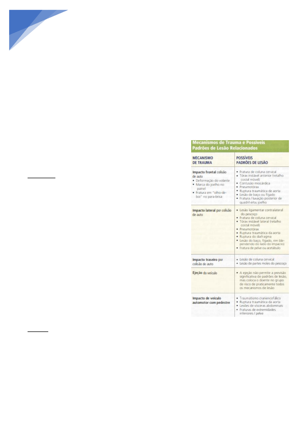 Avaliação inicial ATLS Material escrito e resumido por Leonardo Wallau Fontana, acadêmico do curso de medicina da Universidade de Santa Cruz do Sul (UNISC). 1 Avaliação inicial é uma abordagem sistematizada de avaliação rápida das lesões e instituição de medidas terapêuticas de suporte de vida, e inclui: 1. Preparação 2. Triagem 3. Avaliação primária (XABCDE) 4. Reanimação 5. Medidas auxiliares à avaliação primária e à reanimação 6. Considerar a necessidade de transferência do doente 7. Avaliação secundária (da cabeça aos pés) e história 8. Medidas auxiliares a avaliação secundária 9. Reanimação e monitorização contínua após a reanimação 10. Tratamento definitivo Neste resumo, abordaremos os primeiros 5 pontos. Deve ser repetida com frequência para identificar qualquer alteração do estado clínico do doente que indique a necessidade de intervenção adicional. Na prática, muitas dessas atividades ocorrem simultaneamente. Preparação • Fase pré-hospitalar: O hospital de destino deve ser notificado antes de se iniciar o transporte do ferido, dessa forma, é possível a mobilização da equipe de trauma de modo que todos os recursos humanos e materiais necessários ao atendimento estejam presentes no serviço de emergência à chegada do doente. Deve ser dada ênfase à manutenção da via aérea, ao controle da hemorragia externa e do choque, à imobilização do doente e ao transporte imediato ao hospital apropriado mais próximo. Abreviar ao máximo a permanência na cena. Realizar também a obtenção e documentação de informações necessárias à triagem ao chegar ao hospital, incluindo hora do trauma, eventos relacionados ao trauma e história do doente. • Fase hospitalar: O planejamento antecipado à chegada do doente traumatizado é essencial. Organizar e testar todo o material de pronto uso. Deixar prontas soluções cristaloides aquecidas. Todo pessoal que entrar em contato com o ferido deve estar protegido contra doenças transmissíveis, como hepatites e AIDS. Triagem Segue, em grande parte, o esquema XABCDE Classificação dos doentes de acordo com o tipo de tratamento necessário. Envolve também a decisão do local para qual o paciente deve ser transportado. Refere-se “múltiplas vítimas” quando o número de feridos não ultrapassa a capacidade de atendimento do hospital. Já “vítimas em massa”, o número de doentes e a gravidade das lesões excedem a capacidade de atendimento da instituição e da equipe. Avaliação inicial ATLS Material escrito e resumido por Leonardo Wallau Fontana, acadêmico do curso de medicina da Universidade de Santa Cruz do Sul (UNISC). 2 Avaliação primária Uma rápida avaliação do A, B, C e D no doente traumatizado pode ser obtida quando você se apresenta, perguntando ao doente seu nome e o que aconteceu. Uma resposta apropriada sugere que não há comprometimento grave da via aérea ( habilidade para falar claramente), a ventilação não está comprometida gravemente ( habilidade para gerar movimento aéreo que permita falar) e não há maior diminuição do nível de consciência (alerta suficientemente para descrever o que aconteceu). A falha na resposta a essas questões sugere anormalidades no A, B ou C, que implicam avaliação e tratamento urgentes. X – Conter hemorragias graves A hemorragia é a principal causa de morte pós-traumática evitável. Deve ser antes mesmo do manejo das vias aérea uma vez que, epidemiologicamente, apesar da obstrução de vias aéreas ser responsável pelos óbitos em um curto período, o que mais mata no trauma são as hemorragias graves. Hemorragia externa grave deve ser tratada por compressão direta. Torniquetes podem ser usados nas extremidades, quando a compressão não foi eficiente. A – Via aérea com proteção da coluna cervical Deve incluir aspiração e inspeção para a presença de corpos estranhos e fraturas que podem resultar em obstrução da via aérea. Como medida inicial para permeabilizar a via aérea é recomendada a manobra de elevação do mento (chin lift) ou de tração da mandíbula (jaw thrust), sempre mantendo a proteção da coluna cervical. Se o doente consegue comunicar-se verbalmente, é pouco provável que a obstrução da via aérea represente um risco imediato; no entanto, é prudente que a permeabilidade da via aérea seja avaliada a curtos intervalos de tempo. Cabe enfatizar que os doentes com trauma craniencefálico grave e rebaixamento do nível de consciência ou portadores de um escore na escala de coma de Glasgow ( GCS) igual ou inferior a 8 habitualmente exigem o estabelecimento de uma via aérea definitiva (isto é, tubo com balão insuflado, na traqueia). O achado de respostas motoras descoordenadas sugere fortemente a necessidade de uma via aérea definitiva. Via aérea cirúrgica deve ser indicada se trauma maxilofacial extenso, distorção anatômica resultante de trauma de pescoço, incapacidade de visualizar cordas vocais. Com base na história do trauma, deve-se presumir perda de estabilidade da coluna cervical, principalmente nos casos de trauma grave, depressão do sensório ou trauma acima das clavículas, sendo que um exame neurológico isolado não exclui esse risco. Avaliação inicial ATLS Material escrito e resumido por Leonardo Wallau Fontana, acadêmico do curso de medicina da Universidade de Santa Cruz do Sul (UNISC). 3 Atualmente, para ferimentos perfurantes (tiro, facada, ...) não se prega mais colocar colar cervical em todos os pacientes. Exceto em situações que ponham a coluna em risco, como, por exemplo, um bandido que tomou um tiro e veio a cair de um telhado em consequência disso. Pode se fazer Rx após o tratamento das lesões com risco imediato, mas lembrando que radiografia de perfil identifica somente 85% das lesões. B – Ventilação e respiração A permeabilidade da via aérea, por si só, não garante ventilação adequada. Lembrar da sequência “ac