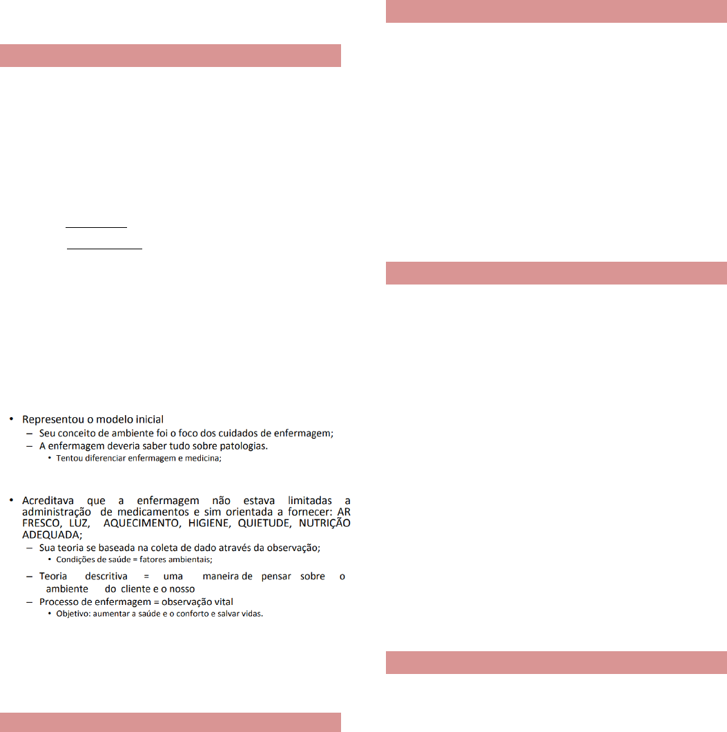 TEORIAS DE ENFERMAGEM TEORIA AMBIENTALISTA - 1859 F. Nightingale (1820/1910) Foco: Ambiente Homem: Indivíduo cujas defesas naturais são influenciadas por um ambiente saudável ou não- saudável. Saúde: Estado em que o ambiente é excelente para que os processos naturais do corpo alcancem processos reparadores. Ambiente: Todas as condições externas capazes de prevenir, suprimir ou contribuir para a doença ou a morte. Enfermagem: Modificar os aspectos não-saudáveis do ambiente a fim de colocar o paciente na melhor condição para ação da natureza “Demonstrou que ambiente limpo diminuía a infecção, conceito que hoje se compreende como infecção hospitalar.” TEORIA DAS RELAÇÕES INTERPESSOAIS EM ENFERMAGEM Hildegard Peplau (1952) Assistir o indivíduo, família e comunidade na obtenção e manutenção de nível máximo de bem-estar total através de intervenções propositais, com ações situadas nos níveis primários, secundário e terciário de prevenção. Tem enfoque holístico do indivíduo, fisiológico, sociocultural, de desenvolvimento, psicoespiritual, ajustando-se e sendo ajustado pelo ambiente, visto como um estressor; “Apresenta o processo de interação enfermeiro/cliente, o modo como acontecem que elementos estão contidos nesta relação e como agir.” TEORIA DAS NECESSIDADES BÁSICAS Virginia Henderson (1897) Foco: Necessidades Básicas Homem: Indivíduos com necessidades humanas com significado e valor singular a cada pessoa Saúde: Capacidade para satisfazer as necessidades humanas (Físicas, Psicológicas e Sociais) Ambiente: Cenário em que o indivíduo aprende padrões singulares de vida. Enfermagem: Assistência temporária a um indivíduo que possua dificuldades para satisfazer uma ou mais necessidades básicas TEORIA DO AUTOCUIDAD0 - 1970 Dorothea Orem 1914 Foco: Autocuidado. Homem: Indivíduo que utiliza o autocuidado para manter a vida e a saúde, recupera-se da doença e consegue enfrentar seus defeitos Saúde: Resultado das práticas aprendidas pelos indivíduos para manter a vida e o bem- estar Ambiente: Os elementos externos com os quais o homem interage em sua luta para manter o autocuidado. Enfermagem: Auxilia o indivíduo a maximizar, progressivamente, seu potencial para o autocuidado. “A enfermagem se apresenta como um sistema de ajuda para o autocuidado, quando o paciente não possui condição de realizá-lo, com o propósito de tornar o paciente independente.” TEORIA DA ADAPTAÇÃO - 1970 Sister Calista Roy 1939 Foco: Homem em adaptação Homem: Ser social, mental, espiritual e físico afetado por estímulos do ambiente interno e externo. Saúde: Capacidade do indivíduo para adaptar-se a mudanças no ambiente Ambiente: Forças internas e externas em um estado de contínua mudança Enfermagem: Arte humanitária e ciência em expansão que manipula e modifica os estímulos de modo a promover e facilitar a capacidade adaptativa do homem “Homem ser social, mental,espiritual e físico afetado por estímulos do ambiente interno e externo. Saúde Capacidade de um indivíduo para adaptar-se a mudanças no ambiente. Ambiente, forças internas e externas em um estado contínuo de mudança. A enfermagem manipula e modifica os estímulos para promover e facilitar a capacidade adaptativa do homem.” TEORIA ALCANCE DOS OBJETIVOS - 1964 Imogenes King (1971) • A estrutura conceitual preconizada por King inclui meta, estrutura, função, recursos e tomada de decisão como elementos essenciais para o trabalho do enfermeiro; • Nesse processo, o enfermeiro interage com cliente por meio de percepção, comunicação, transação, o ser, o papel de cada um, o estresse envolvido, o crescimento e desenvolvimento, o tempo e o espaço, estabelecendo-se metas a serem obtidas. “King apresenta a enfermagem como um processo de interação enfermeira/cliente que colabora para o alcance dos objetivos no ambiente natural. Baseou-se na teoria dos sistemas, apoiando a idéia de que há um sistema social, interpessoal e pessoal.” TEORIA DO CUIDADO JEAN WATSON HUMANO 1979 “Formulou a teoria do cuidado/cura, afirma que o cuidado é a essência da enfermagem, acreditam que a interação cliente/enfermeiro é permeada por sentimentos, emoções, troca de energia e afeto. Esta teoria é apresentada como um futuro modelo para a prática de enfermagem.” TEORIA DO CONTROLE DO ESTRESSE JANET YONGER 1995 “A teoria explica os mecanismos como sofrimento afeta o sentido de um individuo o no meio em que vive e nas suas relações com os outros.” PESQUISA TEORIA PRÁTICA A “era da pesquisa” abrangeu as décadas de 1950, 60 e 70 quando os enfermeiros se tornaram cada vez mais envolvidos em realizar estudos e compartilhar suas descobertas. Os primeiros estudos tinham um enfoque psicossocial, antropológico e educacional. Nessa mesma época teve inicio a “era de educação em nível de pós graduação” e as primeiras versões das teorias de enfermagem foram desenvolvidas, oferecendo mais estrutura á pesquisa de enfermagem. Os teóricos renomados dessa época são: Johnsn, King Levine, Newman, Orem, Rogers e Roy. A era da teoria em 1980 e 90, contribuiu para o desenvolvimento do conhecimento, e o metaparadigma de enfermagem foi proposto por Fawcett. Isso resultou na publicação de diversas revisas de enfermagem, conferencias, programas de doutorado em enferm. O século XXI é considerado a era da utilização da teoria. Hoje, os enfermeiros tentam proporcionar prática baseada em evidencias (PBE), que deriva da TEORIA, PESQUISA E EXPERIÊNCIA. O enfoque da PBE é o cuidado seguro, abrangente, individualizado e de qualidade. DOMÍNIO DE ENFERMAGEM É a perspectiva ou território de uma profissão ou disciplina. Ele proporciona o assunto, conceitos centrais, valores e crenças, fenômenos de interesse e problemas centrais de uma disciplina. Proporciona aspecto pratico quanto teórico da disciplina. É o conhecimento da pratica de enfermagem, da histor