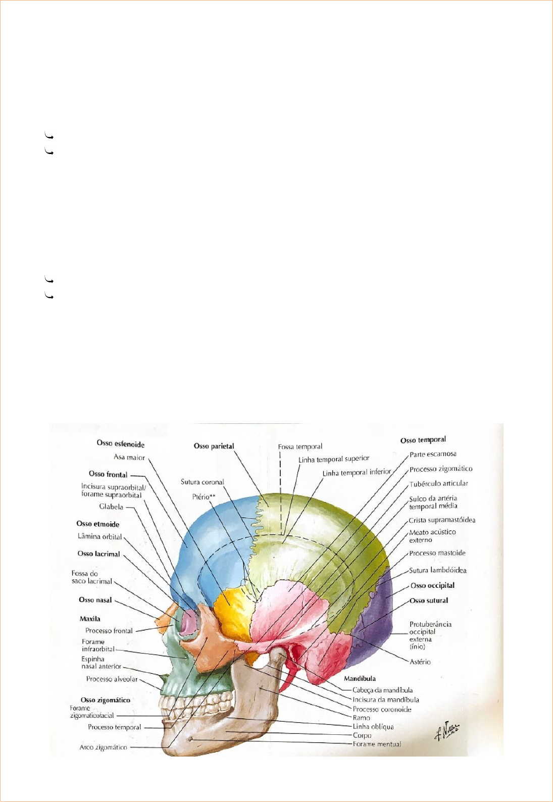 Crânio O crânio é formado por 22 ossos, 8 no neurocrânio e 14 no viscerocrânio O neurocrânio é a caixa óssea do encéfalo e das membranas que o reveste (meninges cranianas). Composto por 4 ossos pares e 4 ímpares. · Ímpares: frontal, etmoide, esfenoide e occipital · Pares: temporal e parietal O neurocrânio tem um teto em forma de cúpula, a calvária, e um assoalho ou base do crânio. A maioria dos ossos da calvária são unidos por suturas entrelaçadas fibrosas, todavia, durante a infância, são unidos por cartilagem hialina (sincondroses) O viscerocrânio compreende os ossos da face que se desenvolvem principalmente no mesênquima dos arcos faríngeos embrionários. Forma a parte anterior do crânio · Ímpares: vômer e mandíbula · Pares: ossos nasais, zigomáticos, maxilas, lacrimais, palatinos e conchas nasais inferiores Os ossos do crânio são chatos (achatados, planos ou laminares) e, com exceção da mandíbula, articulam-se entre si por junturas que não permitem mobilidade (=suturas). Além dos 22 ossos do crânio, temos 3 ossículos no interior do ouvido (bigorna, martelo e estribo) O osso mais forte é o occipital, mas também é o mais lesionado O osso temporal é responsável pela maior parte das dores de cabeça. Vista frontal do crânio O osso frontal, especificamente sua escama (parte plana), forma o esqueleto da fronte, articulando-se na porção inferior com o osso nasal e o zigomático. Ele também se articula com o lacrimal, etmoide e esfenoide, uma parte horizontal do osso (parte orbital) forma o teto da órbita e uma porção do assoalho da parte anterior da cavidade do crânio Classificação das articulações Sinartroses ou articulações fibrosas: imóveis · Suturas, sindesmoses, gonfoses (articulações dentárias) Anfiartroses ou articulações cartilagíneas: semi-móveis Diartroses ou cartilagens sinovais: móveis Suturas Suturas: o objetivo não é dar mobilidade, e sim, proteção. Existem suturas que possuem fibrose e outras que não. Suturas planas: no crânio existem 3 (internasal, intermaxilar e interpalatina) – repercutem na respiração e na deglutição Articulação temporomandibular A ATM é sinovial do tipo gínglimo, que permite o deslizamento (translação) e um pequeno grau de rotação (giro), além dos movimentos de flexão (elevação) e extensão (abaixamento) típicos das articulações do tipo gínglimo. A frouxa membrana fibrosa da cápsula articular se fixa às margens da cartilagem articular no temporal e ao redor do colo da mandíbula. As duas faces articulares ósseas são totalmente separadas por fibrocartilagem interposta, o disco articular da ATM, fixado e sua periferia à face interna da cápsula fibrosa. Isso cria cavidades articulares, ou compartimentos, superior e inferior separadas, revestidas por membranas sinoviais superior e inferior separadas. Dividida anatomicamente em 8 partes: Músculos da mastigação (músculos da ATM): · Temporal -> eleva a mandíbula, fechando a boca · Masseter -> eleva a mandíbula, fechando a boca · Pterigóideo lateral -> agindo bilateralmente, protrai a mandíbula e abaixa o queixo; agindo unilateralmente, balança a mandíbula para o outro lado · Pterigóideo medial -> atua sinergicamente com o músculo masseter para elevar a mandíbula, contribui para a proteusão Músculos da face Localizado abaixo da pele Camada muscular delgada Ação combinada (nenhum age sozinho) Movimenta pele e mucosa Abrem e fecham orifícios Fazem rugas e sucos Botox: a toxina interrompe os estímulos nervosos nos músculos, causando paralisia da musculatura. Como resultado, o músculo fica mais relaxado, pois deixa de ser estimulado