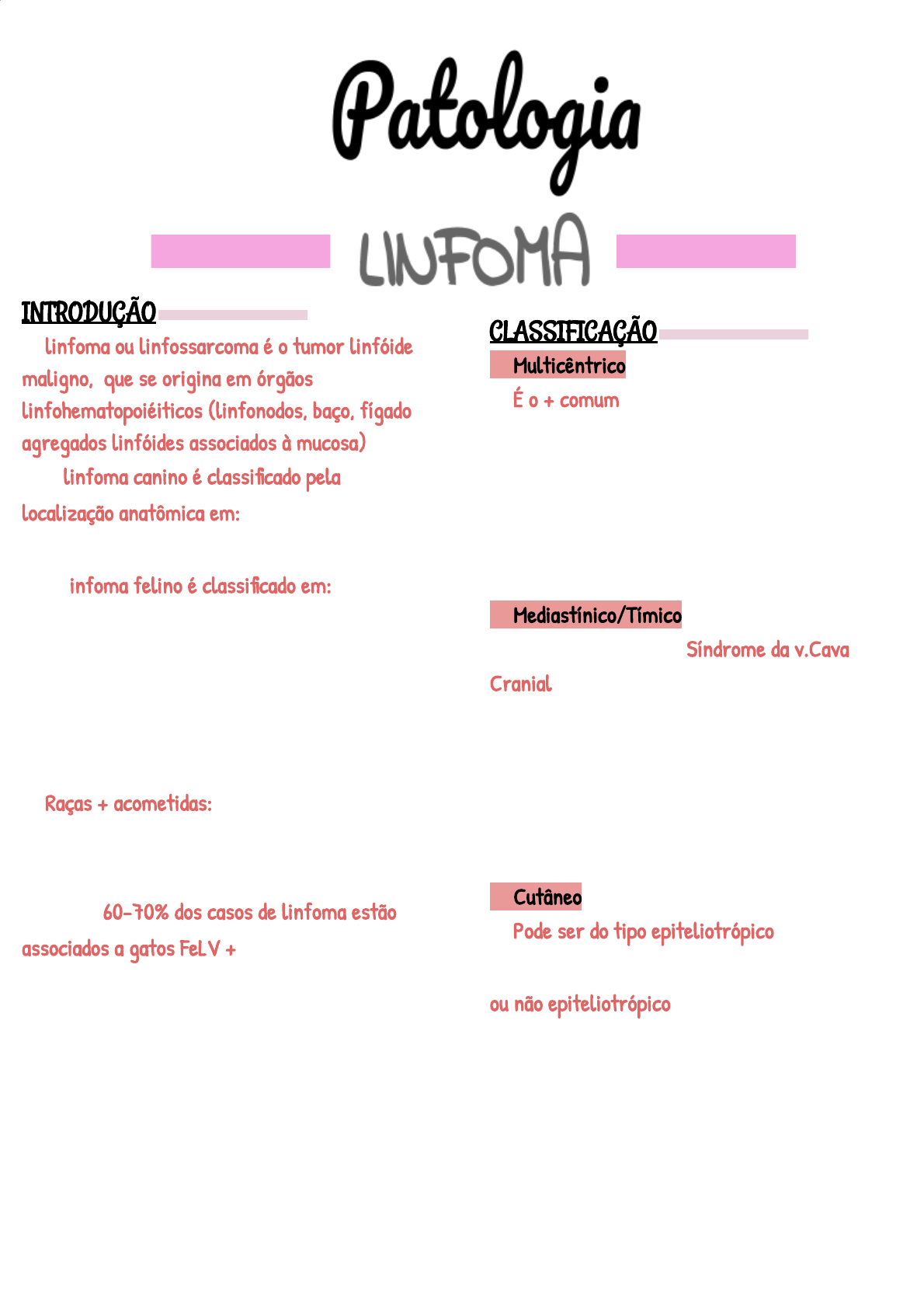 INTRODUÇÃO → linfoma ou linfossarcoma é o tumor linfóide maligno, que se origina em órgãos linfohematopoiéiticos (linfonodos, baço, fígado agregados linfóides associados à mucosa) → O linfoma canino é classi�cado pela localização anatômica em: Multicêntrico, Alimentar, Mediastinal, Cutâneo e Extranodal → O l infoma felino é classi�cado em: Alimentar, Mediastinal, Nodal e Extranodal → A etiopatogenia é multifatorial (envolve processos genéticos, de�ciência imunológica, etc → Ocorre em animais de ½ idade, s/predileção por sexo → Raças + acometidas: Boxer, Basset Hound, São Bernardo, Bu�dogs, Golden Retriever, Rottweiler → São os tumores + comuns nos felinos → 60-70% dos casos de linfoma estão associados a gatos FeLV + (tem papel direto na génese tumoral) → A FIV também pode aumentar a incidência do linfoma (tem papel indireto na oncogênese=Causa imunossupressão) → Os linfomas associados ao FIV têm maior probabilidade de serem de células B os linfomas associados a FeLV são predominantemente de células T CLASSIFICAÇÃO ➪Multicêntrico → É o + comum → Linfadenomegalia regional ou generalizada → Linfadenopatia é raro de se ver em gatos (+ comum o envolvimento dos linfonodos mesentéricos, fígado, baço e rins) → Pode se in�ltrar em qualquer parte do orgn ➪Mediastínico/Tímico → Ele pode ocasionar a Síndrome da v.Cava Cranial → Têm prognóstico desfavorável (principalmente se for linfoma de céls T ou tiver hipercalcemia) → A maioria dos gatos c/esse tipo de tumor são jovens (- de 5y), FeLV + e do tipo de céls T ➪Cutâneo → Pode ser do tipo epiteliotrópico (linfócitos neoplásicos na epiderme=geralm de origem T) ou não epiteliotrópico (linfócitos neoplásicos na derme=geralm de origem B) → Pode fazer metástase p/linfonodos, baço, fígado e med óssea → Pode ser uma lesão tardia decorrente de um envolvimento sistêmico (difícil de determinar o foco inicial) → Epiteliotrópico também pode ser chamado de Micose Fungóide ➪Alimentar → É a 2ª forma + comum de linfoma (nos gatos é a 1ª) → A maioria dos casos são de céls B → Pode ocorrer nas formas nodular ou difusa ➪Extranodal → Outras localizações como sist nervoso, coração, olhos, nasofaringe, ossos, testículos, vesícula urinária e pênis ➪Classi�cação Histológica → Segundo o sistema de Kiel: GRAU KIEL BAIXO Linfocítico Centrocítico (folicular) Centrocítico-centroblástico (folicular) INTERMEDIÁRIO Centrocítico-centroblástico Centrocítico (difuso) Centrocítico-centroblástico (difuso) ALTO Centroblástico Imunoblástico Linfoblástico B SINAIS CLÍNICOS → Variam de acordo c/imunidade, estágio da neoplasia e classi�cação do linfoma → Em gatos caquéticos geralmente não ↑linfonodo → O do tipo cutâneo é considerado a forma + complexa (terapeuticamente) → Pode ocorrer efusões no tórax ou abdômen → Síndrome da v.Cava Cranial= ↑linfonodos mediastinais e torácicos, comprimindo ela e deixando a cabeça/pescoço inchado) → Pode ter hipercalcemia (céls tiram Ca do osso e manda pra circulação) → Outros: Dermato�tose, uveíte, convulsões, insu�ciência renal, etc MULTICÊNT RICO Vômito, diarréia, dispnéia, polidipsia, poliúria, ascite, hipertermia, linfo-hepato-e splenomegalia ALIMENTAR Diarréia, vômito e esteatorréia (consecutiva síndrome da má absorção e obstrução parcial) TÍMICO (MEDIASTIN AL) -Normalm é um linfoma de céls T (pior que o de céls B) Poliúria, hipercalcemia, polidipsia, lesão renal, urolitíase, taquipneia, dispneia, ortopneia, tosse, cianose, síncope, anorexia, caquexia e letargia CUTÂNEO Lesões cutâneas multifocais, eritrodermia esfoliativa, prurido e despigmentaçã o mucocutânea SOLITÁRIO (EXTRANOD AL) Sintomas relacionados ao órgão acometido → Animal caquético deve ser diferencial p/câncer, doença renal e cardíaca DIAGNÓSTICO → Deve-se começar a suspeitar se animal tiver linfadenomegalia (não precisa ser todos) → O diagnóstico de�nitivo é feito pela citologia e por amostra obtidas por punção aspirativa com agulha �na (PAAF) e/ou histopato de tec → Para um diagnóstico + preciso é necessário usar a biologia molecular → Exames que são legais de fazer: RX, US, PAAF, CAAF (cito aspirativa por agulha �na), análise da efusão, histopato, hemograma, bioquímico, FiV/FeLV, etc → Para linfoma, a cito é decisiva!!! TRATAMENTO → Deve-se começar a tratar a síndrome paraneoplásica antes da quimio → Não usar corticóide de forma isolada no trat (ele lisa linfócitos neoplásicos e estimula o cresc de glicoprot P que tiram o quimioterápico + rápido da cél) → Se paciente tiver sido trat c/corticóide e precisa fazer a quimio mas não está funcionando, adm Ivermectina antes da quimio (ela bloq a glicoprot P) → Em cães que o uso da Ivermectina é proibído, pode-se usar o Verapamil (anti-hipertensivo) → Não colocar a agulha diretamente no frasco (usar �ltro de seringa (estab a ATM do frasco c/a seringa impedindo a disseminação de partículas) → DTM: Dose máxima tolerada ( no Br usa-se a menor dose ) → Estadiamento do linfoma em cães: I Envolvimento limitado a 1 linfonodo ou tec linfóide, exceto a medula II Envolvimento de linfonodos regionais III Aumento generalizado de linfonodos IV Envolvimento do fígado e/ou baço c/ou sem os estágios anteriores V Envolvimento do sangue, medula, c/ou sem o envolvimento dos estádios anteriores V a: Sem sinais sist V b: Com sinais sist → Estadiamento do linfoma em gatos: I Só um extranodal ou nodal Inclui tumores 1ºs intratorácicos II Só um extranodal c/envolvim de linfonodo regional 2 ou + nodais do msm lado do diafragma 2 tumores extranodais c/ou sem envolvim do linfonodo regional do msm lado do diafragma Tumor do TGI operável c/ou sem envolvim dos linfonodos mesentéricos III 2 extranodais em locais opostos do diafragma 2 ou 