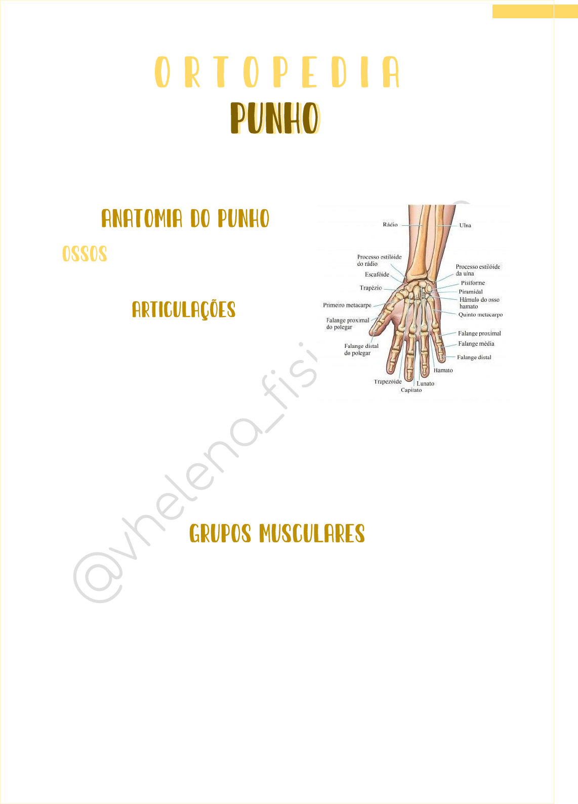 Resumo criado com base no meu entendimento sobre a aula de ortopedia punho, mãos e dedos – UNIEDUK 2021 - @vhelena_fisioterapia 1 Ortopedia - @vhelena_fisioterapia Não dá para falar de punho sem falar de mão, músculos, articulações. – Rádio, ulna, ossos do carpo : Rádio ulnar Radio carpal – conecta superfície articula antebraço e carpo Mediocarpal – articula entre as fileiras proximal e distal dos ossos do carpo Carpometacarpal - 0 contato entre carpo e metacarpo Facilitando a articulação do punho ADM DO PUNHO – Flexão, extensão, desvio radial e desvio ulnar. Grupo dos flexores e extensores, desvio radial e desvio ulnar Músculos do antebraço – camada superficial (Vista anterior) Pronador redondo, flexor radial do carpo, palmar longo, flexor ulnar do carpo. Músculos do antebraço – camada média (vista anterior) Flexor superficial dos dedos. Músculos do antebraço – camada profunda (vista anterior) Flexor longo do polegar, flexor profundo dos dedos, pronador quadrado. Resumo criado com base no meu entendimento sobre a aula de ortopedia punho, mãos e dedos – UNIEDUK 2021 - @vhelena_fisioterapia 2 Ortopedia - @vhelena_fisioterapia Músculo do antebraço – camada superficial (vista posterior) Braquiorradial, extensor radial longo do carpo, extensor radial curto do carpo, extensor dos dedos, extensor ulnar do carpo, extensor do dedo mínimo. Músculo do antebraço – camada profunda (vista posterior) Supinador, extensor longo do polegar, extensor do indicador, abdutor longo do polegar, extensor curto do polegar. Resumo criado com base no meu entendimento sobre a aula de ortopedia punho, mãos e dedos – UNIEDUK 2021 - @vhelena_fisioterapia 3 Ortopedia - @vhelena_fisioterapia Flexor radial do carpo e extensor longo e curto Flexor ulnar do carpo e extensor ulnar do carpo Fratura de Colles: Tem como causa mais frequente uma queda sobre a mão aberta (mão estendida). Fratura do rádio distal com deslocamento do fragmento no sentido dorsal e radial, devido a queda sobre a mão estendida. Fratura de Smith: Fratura do rádio distal com deslocamento do fragmento no sentido palmar e radial, acontece por uma queda sobre a mão fletida. Diferença entre fratura de colles e fratura de Smith Colles: Ocorre com desvio e angulação dorsal Smith: Ocorre um desvio e angulação palmar. Resumo criado com base no meu entendimento sobre a aula de ortopedia punho, mãos e dedos – UNIEDUK 2021 - @vhelena_fisioterapia 4 Ortopedia - @vhelena_fisioterapia Caindo sobre a mão flexionada para acima (Colles) ou para abaixo (Smith) causa compressão e deslocamento do final inferior do osso radial. No caso de uma fratura de Colles, a fratura mais comum que ocorre em humanos, o processo estilóide da ulna pode desconectar também. Estas fraturas do antebraço usualmente são imobilizadas após restaurar as condições anatômicas por um entalamento emplastrado do antebraço. Reposicionamento abrupto ou frequente pode causar a doença de Suddeck acompanhada por discreta atrofia do tecido, entorpecimento das articulações ou atrofia muscular. O túnel do carpo é formado pelos ossos cárpicos e o reticulo flexor. Os tendões flexores dos dedos e o nervo mediano passam através desse túnel. Lesões na área dos ossos cárpicos, doenças reumáticas, sobre esforço (ofício de alfaiate), tumores, mudanças hormonais, enfermidades metabólicas e fatores, até agora ainda desconhecidos, causam a compressão do nervo mediano. Os pacientes, frequentemente mulheres entre 40 / 50 anos de idade, queixam-se do entorpecimento da mão e formigamento nos três dedos do meio durante a noite, afirmando que conseguir alívio sacudindo e flexionando o punho. O curso seguido da enfermidade pode envolver atrofia tenar. As bainhas sinoviais (tendão) protegem os tendões em lugares em lugares onde de outra forma iriam atritar contra / sobre saliências ósseas ou outros tendões. Quando se faz um trabalho que não está acostumado ou quando causa uma sobrecarga, os músculos podem sofrer um estresse ficcional causando uma inflamação dolorosa do tecido da bainha do tendão deslizante. As bainhas sinoviais mais comuns afetadas são aquelas dos músculos flexores da mão e dos dedos causados pelo trabalho estereotipado tais como desempenhado por secretárias. Resumo criado com base no meu entendimento sobre a aula de ortopedia punho, mãos e dedos – UNIEDUK 2021 - @vhelena_fisioterapia 5 Ortopedia - @vhelena_fisioterapia Fraturas metacárpicas são causadas pelo impacto direto de força ou indiretamente pela queda sobre a mão ou por um golpe. As vezes são acompanhadas por deslocações na articulação carpo metacárpica do polegar. Ocorre inchaço, sensibilidade à pressão e dor ao movimento, e posições incorretas. A fratura cárpica mais comum é a fratura do osso escafoide. Ela ocorre em quedas sobre a mão estendida. Causa dor com o movimento do punho e sensibilidade à pressão entre os tendões extensores do polegar (Tabaqueira anatômica). Tenotomia dos tendões extensores e flexores ocorrem nas lesões causadas por cortes ou cortes serrados, fraturas ou degeneração através de reumatismo ou desordens no fornecimento de sangue. Aonde as falanges são flexionadas ou estendidas frequentemente elas estarão acompanhadas com avulsões do osso. Podem ocorrer, lesões caracteristicas, dependendo do tendão afetado e a localização da lesão, posição errada ou mal funcionamento. Danos ao nervo ulnar resultam na falha dos músculos intrínsecos da mão, levando a assim chamada ,mão de garra', na qual as articulações dos dedos permanecem estendidos e as articulações interfalangianas em posição flexionada. No caso de uma lesão do nervo mediano superior os primeiros três dedos não poderão fechar em punho. Esta representação também é referida como mão de benção. O punho caido é característico da lesão do nervo radial, que inerva os músculos extensores da mão. Resumo cr