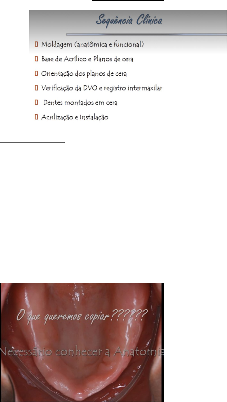 PRÓTESE TOTAL SÍNDROME DE KELLY: Paciente usa PT superior e na arcada inferior só tem os dentes inferiores anteriores anteriores. Classe I de Kennedy embaixo e portador de PT em cima. Nesse caso, como ele só tem dentes anteriores inferiores, ele força a dentadura na região anterior. Com isso, o paciente força o rebordo anterior e este rebordo reabsorve e a PT tende a deslocar na parte de tras. Quando ela desloca na parte de trás ela faz uma sucção na região de tuberosidade que faz aumento das destas tuberosidades maxilares, extrusão dos dentes naturais anteriores, perda óssea da região posterior do arco inferior sob a base da protese e hiperplasia papilar da mucosa do palato duro. Isso ocorre devido à fata de manutenção e acompanhamento. A cada 5 anos deve-se trocar as próteses ou pelo menos fazer reembasamemto pois os dentes delas se desgastam. Importante conhecer o rebordo; a prótese tem que estar adaptada ao fundo do vestíbulo; Há grande chance de reabsorção óssea. Única solução para minimizar reabsorção é estender a prótese além do rebordo, ou seja, para as áreas basais. Regiões de osso. Área basal da maxila: Palato Área basal da mandíbula: Papila retromolar Principal motivo da prótese não se fixar é a falta de saliva. Usar corega; saliva artificial; hidratação A prótese total tem 2 moldagens: Etapa mais importante é moldagem Mudar conceitos antigos: Moldagem anatômica é pra saber onde é o termino da prótese Prótese tem que ser para desdentado total Ir somente ate palato duro Moldagem anatômica com alginato Importante: Moldar inserções musculares Com esse modelo iremos descobrir a área chapeada, temos que desenhar a área que a prótese vai cobrir. Temos que fazer uma moldeira individual. Pra que serve essa moldeira individual? É como se tivesse colocando um fio retrator no fundo do vestíbulo, serve pra copiar as inserções musculares do fundo do vestíbulo, pra copiar melhor o término. Por cima do modelo anatômico fazer a moldeira funcional abaixo Colocar cera nas áreas retentivas Placa de acrílica fotopolimerizada (nova no mercado) Se der vácuo na hora de tirar quer dizer que a moldagem deu certo PODE MOLDAR TB DIRETO COM SILICONE, MAS NÃO TEM A MESMA QUALIDADE DA TÉCNICA ACIMA. É MAIS INDICADA PARA PT PROVISÓRIA Dimensão vertical de repouso é uma só. Pegar DVR – 3mm (espaço livre) = MIH Medir com compasso de willys Suporte do lábio O Inferior segue o superior Se tiver dente inferior não muda nada Só escolhe de canino a canino Oclusão mutuamente protegida Pasta em gel é menos abrasiva Na PPR agua sanitária até 10 minutos pq enferruja os metais
