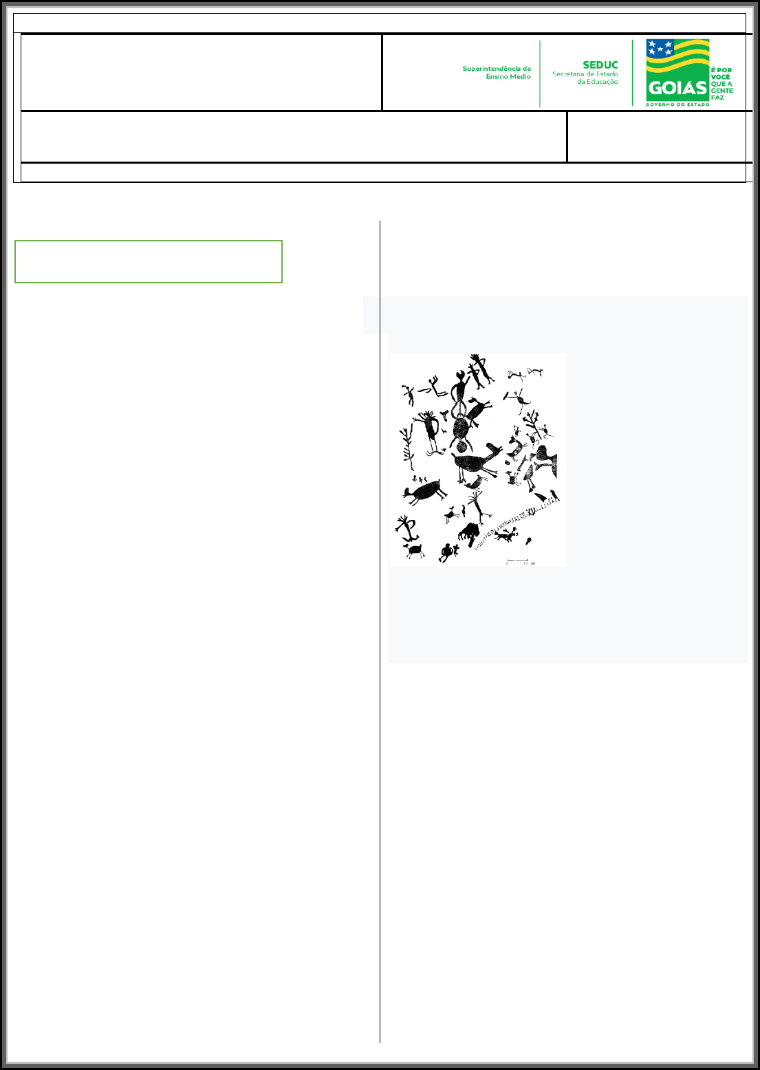 Avaliação 1º Bimestre – Goiás Tec - 1ª Série ARTE, HISTÓRIA E FÍSICA (QUARTA-FEIRA) DATA: ___/____/2021. NOME: QUESTÃO 01 A arte tem sido, no decorrer da história, uma das manifestações do desenvolvimento do ser humano. Na Pré-História, o início da agricultura e a domesticação dos animais, dando início à substituição da vida nômade por uma vida estabilizada, trouxe que mudança na arte? a) Construção arquitetônica de templos. b) Presença de figuras que imitavam fielmente a natureza. c) Ausência de representação da vida coletiva. d) Preocupação com o movimento; criação de figuras monumentais. e) Ocorrência do abandono do estilo naturalista. QUESTÃO 02 Nas variadas culturas, o interesse e o desprezo pela história da arte sofrem oscilações, e a função social da arte modifica-se nos diferentes grupos sociais. Contudo, inserida na cultura ocidental, a arte possui características próprias. Analise as alternativas, assinalando (V) para verdadeiro e (F) para falso: ( ) É uma forma de comunicação. ( ) É um produto social, cultural e histórico. ( ) Relaciona-se com a contemplação e utiliza-se da forma. ( ) Sua função original modifica-se com o passar do tempo. ( ) Possui exclusivamente objetivo prático e funcional. A sequência CORRETA é: a) V V V V F. b) F V V V F. c) V F V F F. d) F F V V V. e) F V V F V. QUESTÃO 03 1. Observe a reprodução de arte parietal encontrada no Parque Nacional da Serra da Capivara (PI). A partir da imagem, assinale a opção que caracteriza corretamente os elementos da arte parietal. a) Os elementos antropomórficos são traçados com linhas simples, mas capazes de gerar efeito tridimensional. b) Os homens e os animais são pintados de modo realista e proporcional com recursos de perspectiva. c) As figuras são representadas em posições que sugerem ação ou movimento. d) O grafismo abstrato prevalece em relação aos elementos antropomórficos e zoomórficos. e) A composição das cenas narra uma história de caça e está estruturada em primeiro e segundo plano. QUESTÃO 04 Em relação à função dos grafismos rupestres, analise as afirmativas a seguir e assinale V para a verdadeira e F para a falsa. ( ) Possuem uma função mágico-religiosa, na medida em que registram o mundo simbólico e os ritos das populações que as produziram. ARTE 2 ( ) Possuem uma função estética, uma vez que são expressões da imaginação humana e de sua capacidade criativa. ( ) Possuem uma função comunicativa, pois têm a propriedade de transmitir mensagens e narrar histórias. As afirmativas são, na ordem apresentada, respectivamente, a) F, V, F. b) F, V, V. c) V, F, F. d) V, V, V. e) V, V, F. QUESTÃO 05 No período da Pedra Lascada, o artista pintava os seres, um animal, por exemplo, do modo como o via de uma determinada perspectiva, reproduzindo a natureza tal qual sua vista conseguia captá-la. (PROENÇA, Graça. História da Arte. Editora Ática. São Paulo.) Considerando a Arte como linguagem, como produção e modos de leitura, marque a afirmação incorreta. a) O contexto de produção de uma determinada obra de arte pode enunciar muitas pistas sobre seu significado e sobre as intenções de quem a produziu. b) Se a arte transmite uma maneira de ver o mundo, cada artista revela seu olhar para a realidade de seu tempo, selecionando elementos que recria em sua obra. c) História, cultura, ideologia, religião são alguns dos fatores que fazem parte do contexto do artista e que contribuem para moldar seu olhar individual. d) Raramente, em razão da subjetividade do criador/ artista, uma obra de arte interage com o público. e) O artista, por meio do trabalho artístico, estabelece um diálogo com seus contemporâneos e lhes propõe uma reflexão sobre o contexto em que estão inseridos. QUESTÃO 06 No período denominado pré-histórico são encontrados desenhos, pinturas e relevos realizados em rochas: a chamada arte rupestre. Quanto a este tipo de manifestação artística, pode-se afirmar que: a) tem o mesmo significado que o grafismo infantil; b) é praticada pelas populações indígenas brasileiras atuais; c) é naturalista, com predomínio da representação de vegetais; d) está presente em extensas áreas do Brasil; e) é inexistente o elemento visual cor. QUESTÃO 07 Acerca da distinção nas sociedades indígenas entre artefato e arte, ou seja, entre objetos produzidos para serem usados e outros para serem somente contemplados, é correto afirmar que: a) não existe a figura do artista. b) há um compromisso com a invenção do novo. c) há independência entre as manifestações expressivas e a vida social. d) a figuração marca a relação entre as duas vertentes. e) a abstração é a principal característica. QUESTÃO 08 2. Acerca da arte africana, em todo o seu contexto continental e suas influências para outras culturas, principalmente no Brasil, é correto afirmar que: a) As produções escultóricas possuem um realismo, mas que se preocupa pouco com níveis de detalhamento profundo por conta do material utilizado para isso, madeiras duras e resistentes, onde geralmente eram aplicados acabamentos com metais preciosos. b) Sua produção é extensa e variada, cujos contornos são diversificados, exemplificando a variedade de culturas e povos que compõe o povo africano, impossibilitando o surgimento de uma identidade africana única sem descontextualizar com a realidade. c) Algumas culturas africanas possuem tradição na produção de máscaras e a origem sociocultural dessa modalidade artística faz parte dos rituais de guerra e de duelos – ponto comum para todos os povos africanos. d) A variedade de estilo dentro do continente africano não impediu a existência de uma unidade de expressão cultural, cuja estrutura hierárquica, permitia uma posição elevada aos artistas nas sociedades africanas, considerados como aqueles que davam forma as qualidades divinas. e) Os ritmos africanos são ex