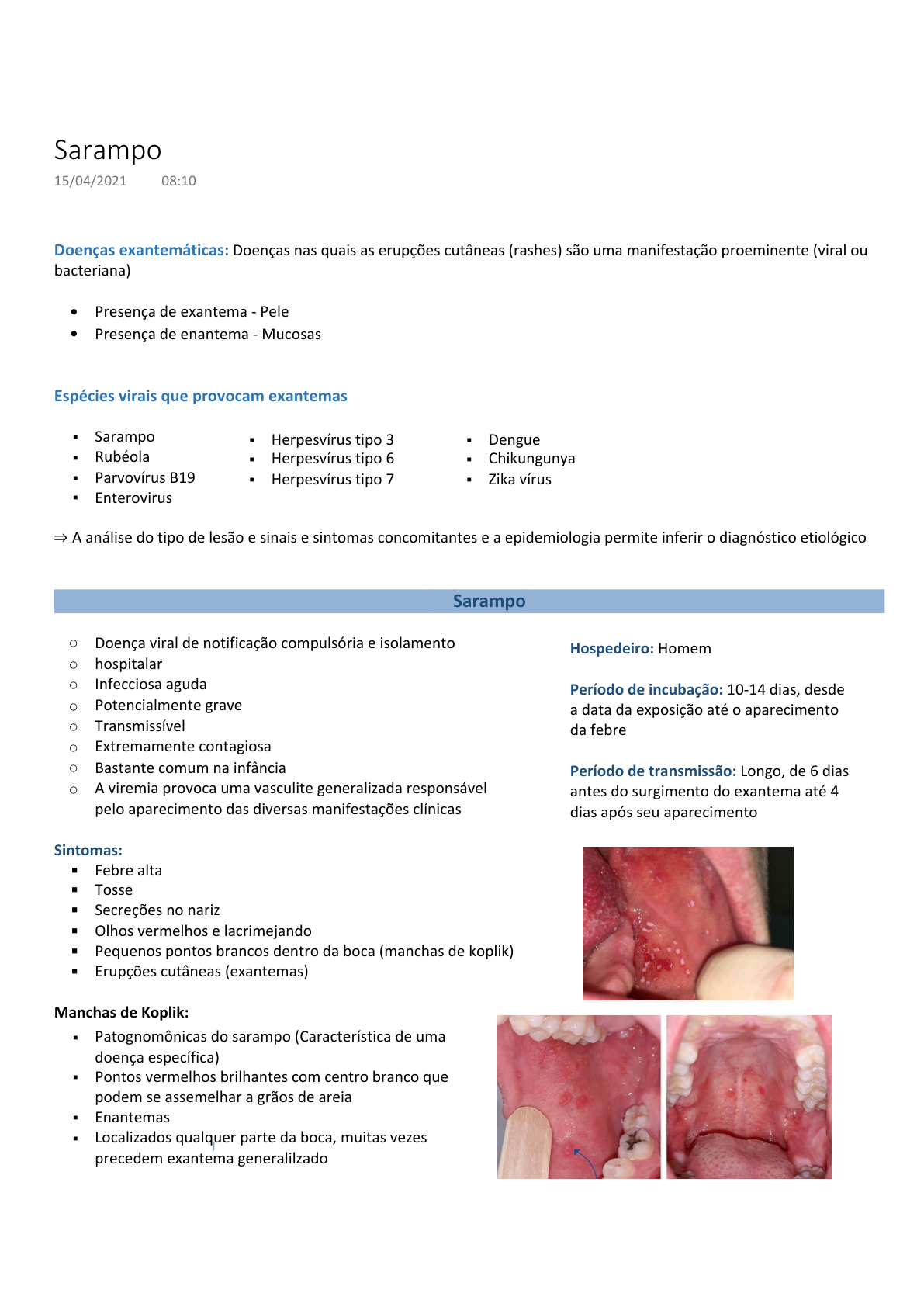 Doenças exantemáticas: Doenças nas quais as erupções cutâneas (rashes) são uma manifestação proeminente (viral ou bacteriana) Presença de exantema - Pele• Presença de enantema - Mucosas• Espécies virais que provocam exantemas Sarampo▪ Rubéola▪ Parvovírus B19▪ Enterovirus▪ ⇒ A análise do tipo de lesão e sinais e sintomas concomitantes e a epidemiologia permite inferir o diagnóstico etiológico Sarampo Doença viral de notificação compulsória e isolamento ○ hospitalar○ Infecciosa aguda○ Potencialmente grave○ Transmissível○ Extremamente contagiosa○ Bastante comum na infância○ A viremia provoca uma vasculite generalizada responsável ○ pelo aparecimento das diversas manifestações clínicas Sintomas: Febre alta§ Tosse§ Secreções no nariz§ Olhos vermelhos e lacrimejando§ Pequenos pontos brancos dentro da boca (manchas de koplik)§ Erupções cutâneas (exantemas)§ Manchas de Koplik: Vírus do Sarampo Proteínas do vírus Proteína F Permite a fusão de várias células formando células multinucleadas/sinciciais (gigantes) -> Aglomerado de células▪ Células gigantes de Warthin-Finkeldey Replicação viral: Vírus de RNA quando penetra na célula do hospedeiro precisa fazer tradução, portanto material genético do vírus ficará no citoplasma Patogênese Vírus entram pelo trato respiratório1. Entram através das células epiteliais do sistema respiratório pela proteína H e receptor CD462. Entram dentro dos macrófagos e DCs pelo receptor CD1503. São levados para os linfonodos regionais pelos macrófagos e DCs para serem apresentados aos LT e LB4. Infectam LT e LB ativados5. LT e LB carregam vírus para corrente sanguínea (viremia primária)6. Disseminam para o SRE e replicam7. Infectam outros tecidos linfóides8. Viremia secundária9. Replicam no endotélio vascular10. Disseminam para outros tecidos não linfóides e replicam no epitélio e endotélio (receptor nectina-4)11. Gera resposta imunológica12. Final da viremia secundária marcado por leucopenia13. ⇒ Infectividade:Mais alta no final da fase prodrômica quando ocorre o pico dos sintomas respiratórios Excreção: Prolongada em crianças desnutridas e pacientes imunocomprometidos ⇒ Imunossupressão associada à infecção pelo vírus é causa das infecções secundárias - mortalidade e morbidade associada ao sarampo ⇒ Deprime a resposta imune por meio da infecção direta de monócitos e células T e B, por deprimir a produção de interleucina (IL)-12 e a resposta de células T auxiliares, tipo TH1 Tropismo Proteína H (Hemaglutinina) liga-se aos receptores: Entrada: CD46: Expressa em células nucleadas, superfície apical de células○ Disseminação: CD150 (SLAM): Expressa em linfócitos T e B ativados, timócitos imaturos, macrófagos, DCs○ Transmissão: Nectina-4: Proteína de adesão presente em células epiteliais, principalmente em células da placenta e em células da traqueia ▪ Evolução da doença Resposta Imune Proteínas C e V diminuem efeitos dos IFN alfa e beta▪ Vírus consegue assim modular a resposta imunológica controlando o estado antiviral▪ Intensa multiplicação viral principalmente no período inicial da imunidade inata▪ Complicações associadas Grave em crianças desnutridas§ Infecções secundárias (pneumonia, otite média, estomatite)§ Ulcerações na boca dificultam a hidratação e alimentação§ Ulcerações na córnea - Cegueira§ Encefalomielite aguda (desmielinação por ação de anticorpos)§ Diagnóstico Clínico: Laboratorial: ⇒ Sarampo clássico é de fácil diagnóstico clínico Prevenção Através das vacinas§ Dupla viral, tríplice viral, tetra viral§ Herpesvírus tipo 3▪ Herpesvírus tipo 6▪ Herpesvírus tipo 7▪ Dengue▪ Chikungunya▪ Zika vírus▪ Patognomônicas do sarampo (Característica de uma doença específica) ▪ Pontos vermelhos brilhantes com centro branco que podem se assemelhar a grãos de areia ▪ Enantemas▪ Localizados qualquer parte da boca, muitas vezes precedem exantema generalilzado ▪ Hospedeiro: Homem Período de incubação: 10-14 dias, desde a data da exposição até o aparecimento da febre Período de transmissão: Longo, de 6 dias antes do surgimento do exantema até 4 dias após seu aparecimento Ordem:Mononegavirales Família: Paramyxoviridae Subfamília: Paramyxoviridae Gênero:Morbillivirus Envelopado (Dura menos na antureza, pois é facilmente destruído)§ RNAss negativo, linear não segmentado Maior parte dos vírus de RNA causam infecções agudas▪ § Codifica: 6 proteínas estruturais (P, L, N, H, F e M) e 2 não estruturais (NSP): V e C H e F importantes para a replicação viral▪ § Carrega RNA polimerase Ribossomo não consegue traduzir vírus RNA negativo (3' - 5') -> Precisa fazer tradução no citoplasma ▪ RNA polimerase traduz o vírus no citoplasma (transforma em RNA positivo -> 5' - 3') ▪ DNA - Transcrição -> RNA - Tradução -> Proteína▪ § Proteína H - Hematoglutinina Usada para reconhecimento pelos receptores da célula do hospedeiro ▪ Liga-se a receptores▪ Relacionadas com a patogênese: Proteínas C e V (não estruturais) Diminuem efeitos dos IFN, diminuindo o estado antiviral (importantes para o escape do sistema imune ▪ Vírus do sarampo consegue fazer com que várias células sejam fundidas gerando uma célula gigante -> Sincício Evasão: Passagem célula a célula e facilita vírus de escapar da ação dos anticorpos Reconhecimento/Adsorção: Mediada pela recepção ligante (V) receptor (H) 1. Penetração: Por fusão (envelope do vírus se funde com membrana plasmática do hospedeiro, jogando material genético dentro da célula do hospedeiro), endocitose (é endocitado e penetra dentro da célula do hospedeiro) 2. Biossíntese: Novos RNA e proteínas virais são produzidas no citoplasma da célula Hospedeira 3. Montagem: RNA e proteínas virais são montados (vários vírus são montados) 4. Liberação: Por