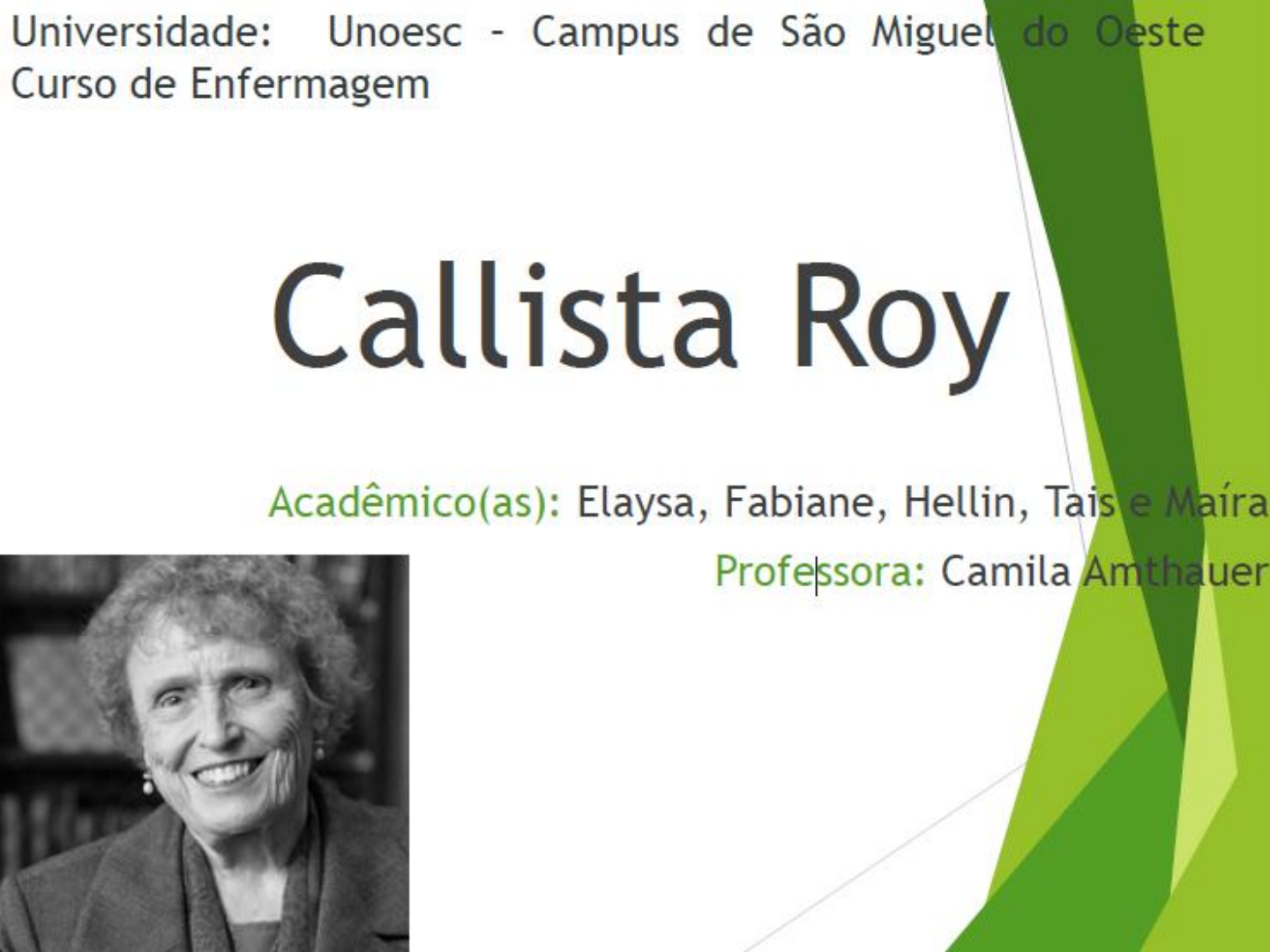 Referências bibliográfica UNIVERSIDADE FEDERAL DE SANTA CATARINA. https://repositorio.ufsc.br/. Cuidado da criança com câncer e seu familiar acompanhante em internação hospitalar: um olhar a partir da teoria da adaptação de sister callista roy. [S.l.]. Universidade Federal de Santa Catarina - Departamento de Enfermagem, 2005. Disponível em: https://repositorio.ufsc.br/bitstream/handle/123456789/1184 95/242070.pdf?sequence=1&isAllowed=y#:~:text=Sister%20Calli sta%20Roy%20nascida%20em,s%20College%2C%20em%20Los%20A ngeles.. Acesso em: 6 ago. 2021. COLUNISTA PORTAL - EDUCAÇÃO. https://siteantigo.portaleducacao.com.br/. Teori a de Callista Roy. [S.l.]. Portal Educação, 2021. Disponível em: https://siteantigo.portaleducacao.com.br/conteudo/artigos/e nfermagem/teoria-de-callista-roy/25161. Acesso em: 4 ago. 2021. Referências bibliográfica MAESTROVIRTUALE.COM. https://maestrovirtuale.com/. Callista Roy: biografia, teoria e obras. [S.l.]. Maestrovirtuale.com, 2021. Disponível em: https://maestrovirtuale.com/callista-roy-biografia-teoria-e- obras/. Acesso em: 3 ago. 2021. TRABALHOS FEITOS. https://www.trabalhosfeitos.com/. Teorias de roy - biografia. [S.l.]. Trabalhos Feitos, 2021. Disponível em: https://www.trabalhosfeitos.com/categoria/biografia-de- callista- roy/676009/0.html#:~:text=biografia%20Irm%C3%A3%20Callista %20Roy%20nasceu,L%C3%B3s%20Angeles%2C%20Calif%C3%B3rnia %20em%201966.&text=Irm%C3%A3%20Callista%20Roy%20desenv olveu%20o,envolve%20um%20processo%20de%20enfermagem. Acesso em: 5 ago. 2021. Referências bibliográficas MARIA DA CONCEIÇÃO MUNIZ, RENATA DOS SANTOS COELHO. http://revista.universo.edu.br. O ACADÊMICO DE ENFERMAGEM REFLETINDO SOBRE A TEORIA DE ENFERMAGEM DE CALLISTA ROY PARA A APLICAÇÃO NA SUA PRÁTICA. [S.l.]. UNIVERSO - UNIVERSIDADE DE SALGADO FILHO, 2017. Disponível em: http://revista.universo.edu.br/index.php?journal=2TRA BALHOSACADEMICOSAOGONCALO2&page=article&op=vie wFile&path%5B%5D=5026&path%5B%5D=2785. Acesso em: 8 set. 2021. BRAGA, Cristiane Giffoni (org.). Teorias de Enfermagem. Itajuba - MG: Saraiva, 2011. E- book (256p.) P&B. Disponível em: https://books.google.com.br/books?hl=pt- BR&lr=&id=4YuwDwAAQBAJ&oi=fnd&pg=PT4&dq=callista +roy+biografia&ots=2p1l935Z1F&sig=OeJk8E7N- VwQ6a69xilb9Vn2-eQ#v=onepage&q&f=false. Acesso em: 2 ago. 2021.