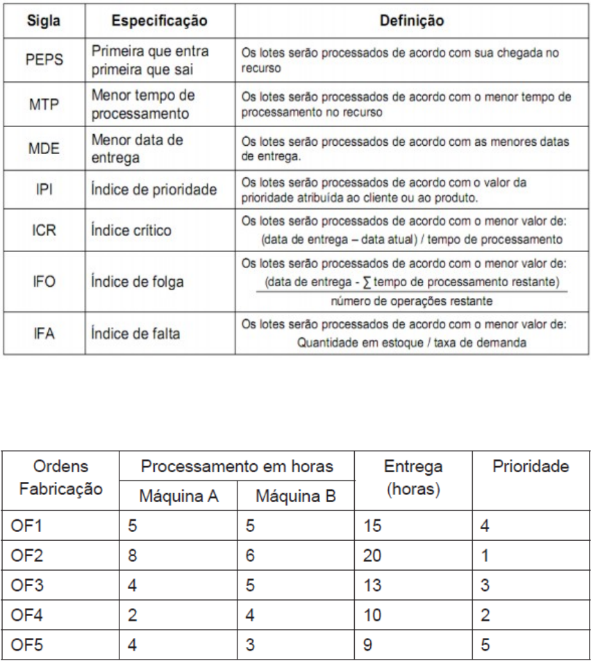 Ex: Cinco ordens de fabricação precisam ser estampadas na máquina A e, em seguida, na máquina B. Os tempos de processamento, as datas de entrega e as prioridades atribuídas a cada ordem estão resumidas no quadro a seguir. Vamos supor que as ordens deram entrada em carteira no sentido da OF1 para a OF5. Caso você queira sequenciar as ordens de fabricação pelos métodos apresentados, teremos a seguinte sequência: 1. Uma metalúrgica que recentemente implementou o processo de PCP necessita atualmente emitir e sequenciar as ordens de produção. Com base nos métodos apresentados qual seria a ordem produtiva para cada modelo conforme dados abaixo: ICR = (Data de entrega [coluna 5] – data de hoje) / (A + B) ICR = Regras Sequencia PEPS MTP MDE IPI ICR OSAB Prioridade recurso Entrega (Data) Prioridade OF135107/03/20214 OF2106301/04/20211 OF383106/03/20213 OF424202/03/20212 OF586401/04/20211 OF645315/04/20212 OF727110/02/20212 OF843201/02/20211