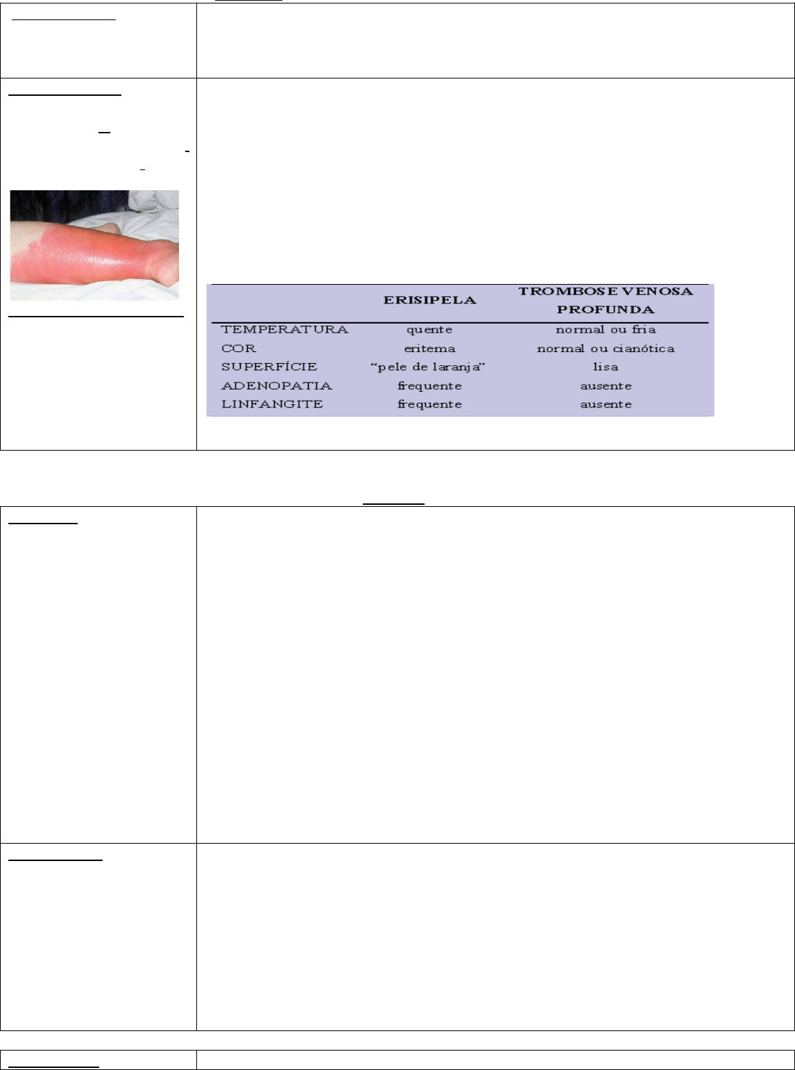 ERISIPELA: Celulite superficial com envolvimento linfático EPIDEMIOLOGIARaramente por estafilococos ou outros micro-organismos Mais comum em crianças e idosos (extremos de idade) Mais comum em MMII- 70-80% (5 a 20%- face) Principais Estreptococos do grupo A: Estreptococcia cutânea e Streptococcus pyogenes QUADRO CLÍNICOFatores de risco: Estase venosa; Isquemia de MMII (diabéticos); Obstrução linfática;Micose interdigital DIAGNÓSTICO DIFERENCIAL Pele de laranja: aspecto àspero Linfangite: mt + comum na erisipela Ex complementar: doppler de MMII (vai diferenciar TVP da erisipela/celulite Placa eritematosa e edemaciada, quente, dolorosa e brilhante, com bordas elevadas ''lesão bonitinha'' Faixas avermelhadas ao longo do trajeto dos vasos linfáticos: LINFANGITE Linfonodomegalia dolorosa satélite (quadro infeccioso inflamatório) *Classificação clínica: · Vesicular: forma vesículas (lesões menores) · Bolhosa: 5%, pode evoluir para celulite, abscesso subcutâneo, fasciite necrotizante · Hemorrágica · Gangrenosa: necrose superficial de tecido (aspecto escurecido da lesão) · Flegmonosa Obs : Quadro infeccioso aumento da temperatura da pele CELULITE: ETIOLOGIA Infecção + profunda= + grave que a erisipela (maioria pode evoluir p/ bacteremia quadros sépticos graves) A partir do foco da celulite, pode fazer foco infeccioso em outros lugares Crepitante: fala mais a favor de agentes anaeróbios. Qnd desconfiar da celulite fúngica: geralmente pcts com dçs associadasInflamação aguda piogênica (vários MOs) difusa da derme e tecido subcutâneo Geralmente se instala ao redor de um ferimento, ulceração ou dermatose Pode ocorrer bacteremia (mais grave) Superfície da lesão é lisa e opaca(s/ placa), sem demarcação de limites nítidos ''lesão feia'' Manifestações sistêmicas Fatores de risco: Déficit de circulação linfática Usuários de drogas injetáveis (complicações: tromboflebite séptica, artrite piogênica, osteomielite, endocardite...) CLASSIFICAÇÃO CLÍNICA: Celulite gangrenosa: necrose do tecido celular subcutâneo e pele adjacente Celulite crepitante: formação de gás em tecido celular subcutâneo; como se houvesse ar Agentes etiológicos: Bactérias gram + (agentes mais comuns da infecções de partes moles estrepto) Bactérias gram – : pcts imunossuprimidos Anaeróbios Fungos DIAGNÓSTICO: É CLÍNICO Se pct precisar de abordagem cirúrgica e ela não for realizada, chance de óbito é de 100 % Maioria das infecções de partes moles tto clínicoAgente etiológico: · Aspirado com cultura: pouca sensibilidade · Biópsia com cultura: aumenta sensibilidade apenas pcts imunossuprimidos com lesão de pele · Hemocultura: + em menos de 5% dos casos; fazer em TODO pct com quadro infeccioso · TC, RNM, USG: pode pedir, mas não p/ fim diagnóstico; serve p/ ver complicações · Necrose · Extensão da lesão · NÃO são utilizados para diagnóstico TRATAMENTO - ERISIPELA E CELULITES Vários ATB podem ser utilizados, de acordo com o agente 7 dias: infecção superficial, simples, sem repercussão hemodinâmica (não está com alteração do nível de consciência,oligúria,...) Pct com infecção complicada 14 dias de ATB ; se for area grande de abcesso até 3 sem Imptt: saber quais pcts apresentam indicação de abordagem cirúrgica (junto com ATBterapia) Faz prevenção com ATB p/ quem tem infecção de pele/partes moles, pois princ a celulite = há grande chance de pct fazer choque séptico . Independente se é erisipela/celulite, os princ agentes são gram + = estrepto ou estafilo Pcts imunossuprimidos: sempre pedir biopsia ATBterapia: empirica na maioria dos casos (fazer hist clinica bem feita) Antibioticoterapia: Maiores doses; Preferência ATBs bactericidas (infecção que pode evoluir p/ gravidade (princ celulite) -> usar ATB bactericida (NUNCA usar ATB bacteriostático em monoterapia) ATBs com ação nas toxinas Duração: 7 a 14 dias Pacientes NEUTROPÊNICOS e IMUNOSSUPRIMIDOS · Biópsia cutânea · Gram – SEMPRE pensar em gram – ( maiores causadores de celulite) NEUTROPÊNICOS · Sem resposta ao tto com ATBS: assumir infecção fúngica (Hemocultura pode demorar de 3-4 sem; se ATB não estiver resolvendo faz biopsia; se não estiver respondendo ao ATB = entra com antifúngico) · Uso de IMUNOGLOBULINA: CONTROVERSO (melhora resposta à infecção); pct que não responde aos ATB iniciais,que evoluiu p/ quadro cirúrgico · Uso de Anti-inflamatórios: CORTICÓIDE (contra indicado em caso de imunossupressão): De uma forma geral, AINEs não são indicados em infecções de pele/partes moles; mas pode aplicar corticóide na intenção de reduzir edema · Diagnóstico e tratamento precoces · Adequada decisão cirúrgica precoce: MORTALIDADE DE 100% · Cicatrização: terapia HIPERBÁRICA controversa · ATBprofilaxia: até não ter mais situação de imunossupressão · Pct que apresenta 3 a 4 episódios de celulite por ano · Presença de fatores de risco · Penicilina oral ou eritromicina por 4 -52 semanas · Penicilina benzatina a cada 2-4 semanas
