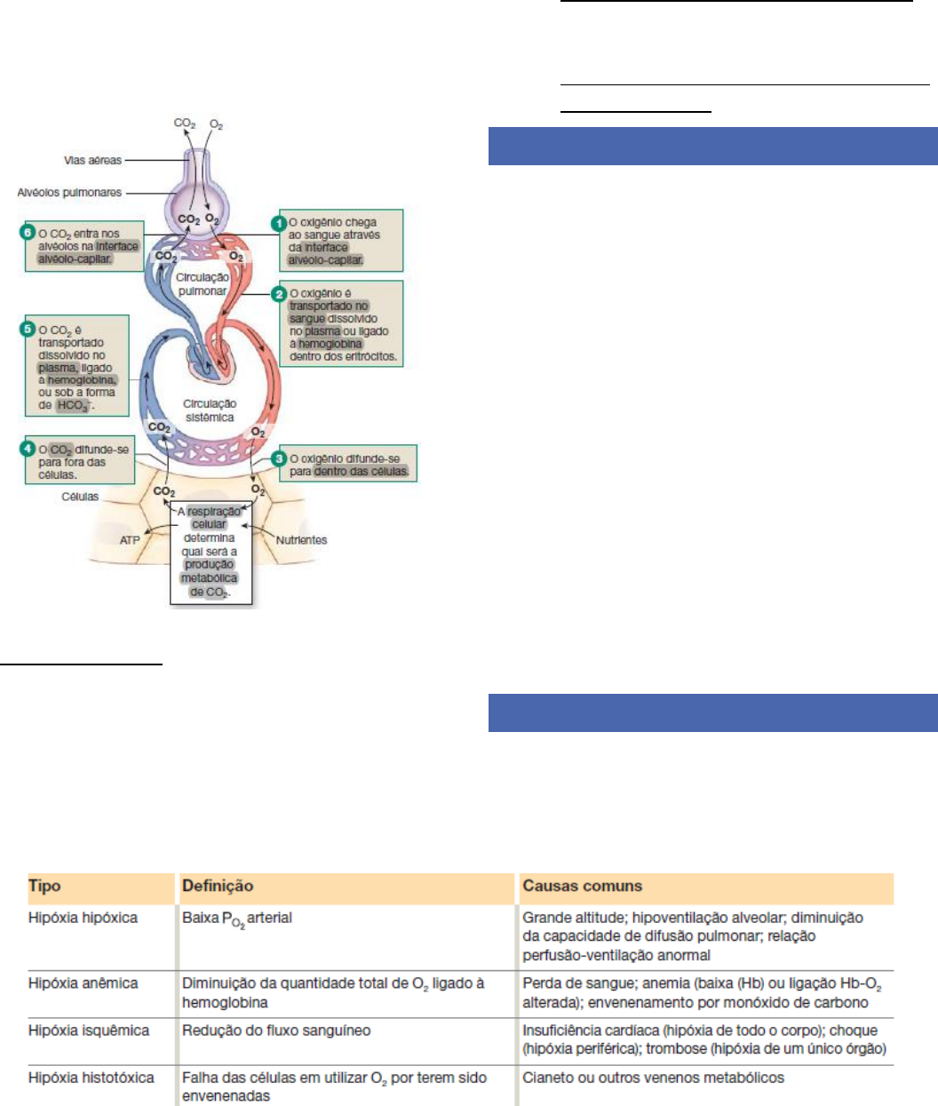 Dafne Moura – B19 1 TROCAS GASOSAS → A respiração pode ser dividida em: mecânica respiratória e trocas gasosas. → As trocas gasosas envolvem: transporte de gases no sangue, a troca dos gases entre os compartimentos. → A troca gasosa ocorre duas vezes: uma entre o sangue que está sendo transportado e o alvéolos, e entre o sangue e os tecidos. → Precisamos de oxigênio para que aconteça as reações metabólicas. Ex: formação de ATP. → O metabolismo de todas as biomoléculas (proteína, carboidrato, lipídios) produzem gás carbônico. • O metabolismo comum dos três macronutrientes é o ciclo de Krebs. → O pH deve ser mantido mais estável possível (entre 7,3 – 7,4). • Se ele for alterado, o Hidrogênio liberado pode se ligar a uma biomolécula, como a proteína. • Se ele se liga a uma proteína, ela pode fazer ligações de hidrogênio com outras proteínas. • O problema está quando essa proteína tem função estrutural, como receptor ou enzima. Se a sua conformação alterar, ela altera ou perde a sua função. HIPÓXIA: → Quando o transporte de oxigênio no sangue não é suficiente. → Normalmente é acompanhada por hipercapnia. Ou seja, alta concentração de Co2 no sangue. → Para evitar a hipóxia, o corpo possui alguns sensores que monitoram três parâmetros: O2, Co2 e pH. Se algum deles for alterado, o corpo entra em estado de alerta. → OXIGÊNIO: deve ser suficiente para manter a respiração aeróbica e a produção de ATP. → DIÓXIDO DE CARBONO: é o produto residual do ciclo de Krebs. Deve ser eliminado pelos pulmões, pois ele é depressor do S.N.C e gera um estado de acidose ao reagirem com a água (forma ácido carbônico). →PH: precisa ser estável para impedir a desnaturação de proteínas. É equilibrado a partir das alterações de ventilação (↑ respiração ↓ácido). TROCA DE GASES ENTRE PULMÕES E TECIDOS: → Respiração: fluxo de ar para dentro e para fora dos pulmões. → Gases se movimentam das regiões de maior pressão parcial para as de menor pressão. Dafne Moura – B19 2 1. O sangue venoso entra nos pulmões com pO2 menor que o pO2 alveolar. • O O2 se desloca a favor do gradiente de pressão (alvéolo → capilar). 2. O sangue arterial rico em O2 alcança os capilares teciduais. • O O2 é consumido no metabolismo celular, por isso as células estão com baixa pO2. • Um gradiente de pressão é formado, e o O2 passa do plasma para as células até o equilíbrio. • A PCO2 é maior nos tecidos que nos capilares, devido ao metabolismo celular. Dessa forma, o CO2 é deslocado dos tecidos para o plasma até o equilíbrio. 3. Nos alvéolos, PCO2 é menor que no sangue venoso. Dessa forma, o CO2 passa do sangue venoso para os alvéolos. VARIÁVEIS QUE INFLUENCIAM O PROCESSO: → Prestar atenção em três variáveis importantes que afetam as trocas gasosas: 1. A quantidade de oxigênio que chega nos alvéolos (Po2 alveolar). 2. A transferência dos gases entre os alvéolos e os capilares pulmonares. 3. O fluxo sanguíneo. PO2 ALVEOLAR: → Se a frequência e amplitude da respiração diminuírem, a ventilação alveolar diminui. → A maior resistência de passagem de sangue prejudica a ventilação alveolar. → A Po2 alveolar diminui junto com a pressão atmosférica em regiões de grandes altitudes. TROCAS GASOSAS ENTRE ALVÓELOS E CAPILARES: → A perda da complacência pulmonar (membrana alveolar mais espessa) diminui a ventilação alveolar. Ex: doença pulmonar fibrótica → A área de superfície dos alvéolos. Se há uma menor área de superfície entre alvéolos e capilares, menor a quantidade de gases que consegue ser difundida. • Ex: enfisema. → A distância entre os alvéolos e os capilares pode comprometer. Se tiver uma barreira mais espessa ou uma grande quantidade de fluído, a troca fica prejudicada. O oxigênio passa mais lentamente para os capilares, por isso a Po2 alveolar não altera e a Po2 arterial diminui. • Ex: edema pulmonar. → O gradiente de pressão do gás é um fator que influencia no movimento do gás do ar para um líquido. • Segue o gradiente de maior concentração para menor concentração. • É O PRINCIPAL FATOR EM PESSOAS SAUDÁVEIS! Dafne Moura – B19 3 FLUXO SANGUÍNEO: → A solubilidade do gás é o fator que mais define o movimento do ar entre o ar e o meio líquido. • Quanto mais solúvel, mais fácil será a sua difusão pelo sangue. GÁS CARBÔNICO. • Quanto menos solúvel, mais difícil será o transporte desse gás. Ele precisa de um transportador. OXIGÊNIO. • Transportador de oxigênio: hemoglobina, dentro dos eritrócitos. → A baixa solubilidade de oxigênio no sangue determina que pouco oxigênio pode ser dissolvido no plasma. → Já que o Co2 é mais solúvel, o aumento da distância entre capilar e alvéolo em casos de edema pulmonar não afetam sua pressão parcial arterial. → Balanço de massa: quanto os tecidos estão consumindo oxigênio. → Fluxo de massa: quanto de oxigênio está sendo transportado no sangue. HEMOGLOBINA: → Uma pequena parte do oxigênio é transportado dissolvido no plasma, a maior parte é transportada pela hemoglobina, dentro dos eritrócitos/hemácias. →Ligação ao oxigênio por coperatividade. → A hemoglobina do adulto é formada por genes Alfa- 2 e Beta-2. → Durante a via embrionária e fetal a hemoglobina é formada por outros genes do tipo Alfa e Beta. → A hemoglobina fetal possui muito mais afinidade ao oxigênio. → Grupo prostético heme: anél porfirico + ferro no estado ferroso. → O ferro liga o grupamento Heme a um aminoácido da hemoglobina. O ferro também se liga ao oxigênio. → Os grupamentos heme estão no interior da hemoglobina, para ele não ser oxidado. → Por serem 4 grupamentos heme no interior de cada hemoglobina, ela possui 4 sítios para ligação de Oxigênio. → A hemoglobina ligada ao oxigênio é chamada de oxi- hemoglobina (HbO2). → A hemoglobina es