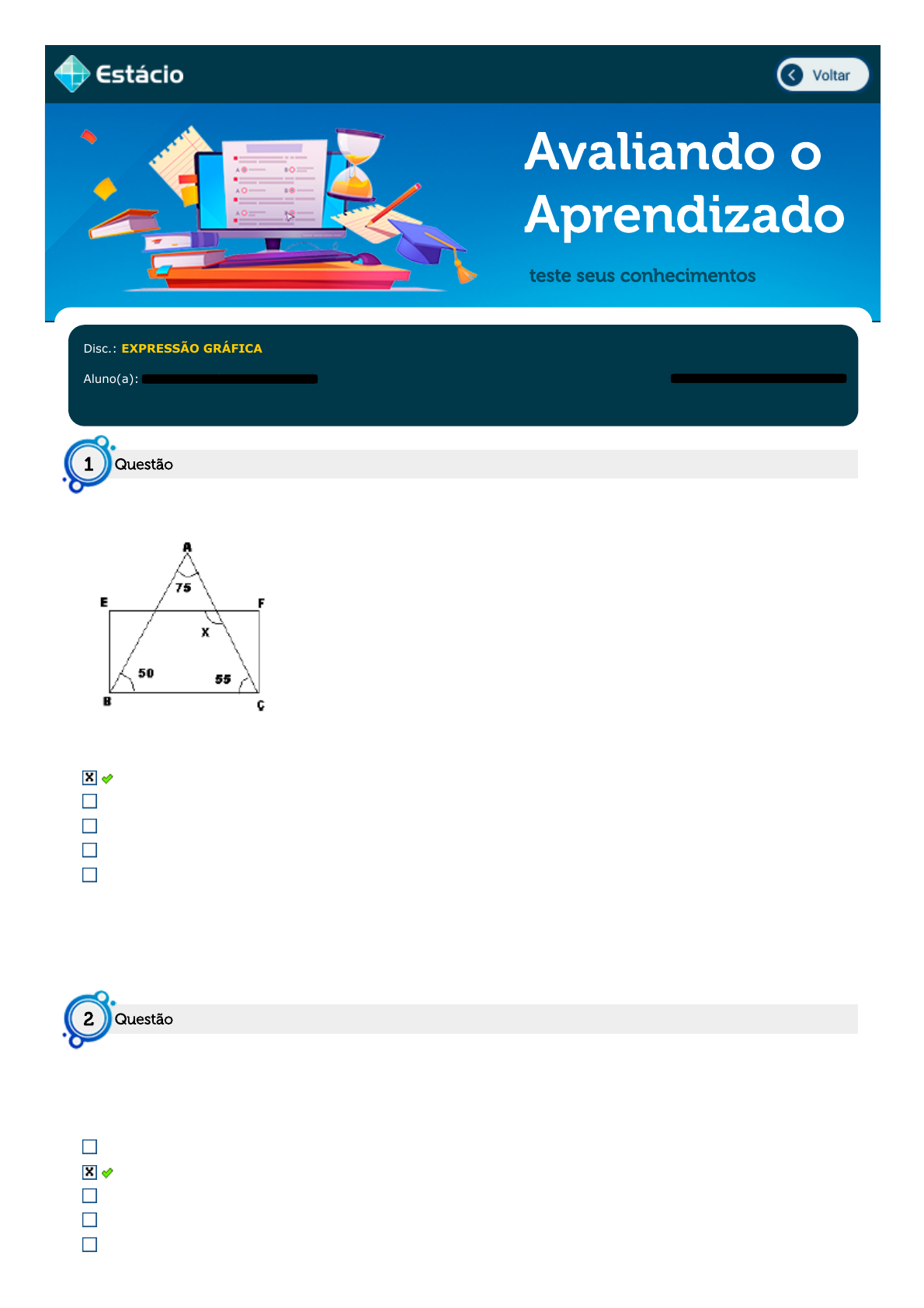 30/09/2021 13:16 Estácio: Alunos https://simulado.estacio.br/bdq_simulados_linear_view.asp 1/5 Avaliando o Aprendizado teste seus conhecimentos Disc.: EXPRESSÃO GRÁFICA Aluno(a): EDIVANDRO PERUZZO Matríc.: 202004117386 Acertos: 9 de 10 30/09/2021 (Finaliz.) Acerto: 1,0 / 1,0 Na figura a seguir, temos um retângulo sobre um triângulo. A medida do ângulo X é: 125° 105° 135° 115° 145° Respondido em 30/09/2021 13:04:54 Compare com a sua resposta: Acerto: 1,0 / 1,0 Escolha, entre as opções a seguir, a que indica a ESCALA de uma vista ortográfica na qual uma de suas linhas é representada com 20 cm de extensão, sabendo-se que, em outra vista, na escala de 1:20000, esta mesma linha mede 50 mm: Escala: 1:400 Escala: 1:5000 Escala: 1:1000 Escala: 1:100000 Escala: 1:50000 Questão1 Questão2 https://simulado.estacio.br/alunos/inicio.asp javascript:voltar(); 30/09/2021 13:16 Estácio: Alunos https://simulado.estacio.br/bdq_simulados_linear_view.asp 2/5 Respondido em 30/09/2021 13:02:07 Compare com a sua resposta: Acerto: 1,0 / 1,0 Sobre a projeção do objeto mostrada na figura abaixo podemos afirmar, EXCETO: a superfície gerada pelas linhas projetantes perpendiculares ao plano de projeção é cilíndrica ortogonal a projeção do objeto no plano é de mesma dimensão do que o objeto real (verdadeira grandeza) a fonte luminosa puntiforme é posicionada no infinito, sobre o centro do objeto o centro de projeção é um ponto visualmente identificado, pois está bem próximo do objeto as linhas projetantes são paralelas entre si e perpendiculares ao plano de projeção Respondido em 30/09/2021 13:05:52 Compare com a sua resposta: Acerto: 1,0 / 1,0 Analise as sentenças abaixo referentes aos conceitos de modelagem 3D: I. Consiste numa representação gráfica computacional que se aproxima do produto real, auxiliando na visualização desse produto antes mesmo deste ganhar uma estrutura física; II. O potencial de inovação desse tipo de modelagem é enorme, já que as ideais podem ser concebidas, analisadas, testadas e modificadas na tela do computador. Do esboço à produção, testando e modificando quantas vezes for necessário; III. Com a modelagem 3D as chances de que o desenvolvimento de um produto, do projeto à produção, seja bem-sucedido aumentam consideravelmente, o que pode ser enxergado como uma importante vantagem competitiva no mercado; IV. Atualmente, a modelagem tridimensional é pouco demandada, pois permite criar modelos pouco personalizados e que não se aproximam da realidade física do produto que está se querendo representar. Está(ão) correta(s), apenas: I e III III e IV Questão3 Questão4 30/09/2021 13:16 Estácio: Alunos https://simulado.estacio.br/bdq_simulados_linear_view.asp 3/5 I, III e IV I, II e III II e III Respondido em 30/09/2021 13:12:22 Compare com a sua resposta: Acerto: 1,0 / 1,0 São condições apresentadas na NBR 8402, EXCETO: Os caracteres devem ser claramente distinguíveis entre si, para evitar qualquer troca ou algum desvio mínimo da forma ideal No caso de larguras de linha diferentes, a distância deve corresponder à da linha mais estreita As principais exigências na escrita em desenhos técnicos são: legibilidade, uniformidade e adequação à microfilmagem e a outros processos de reprodução Para facilitar a escrita, deve ser aplicada a mesma largura de linha para letras maiúsculas e minúsculas A escrita pode ser vertical ou inclinada, em um ângulo de 15° para a direita em relação à vertical Respondido em 30/09/2021 13:07:32 Compare com a sua resposta: Acerto: 1,0 / 1,0 Analise as sentenças a seguir referentes a NBR 10067: I. A vista mais importante de uma peça deve ser utilizada como vista lateral esquerda, geralmente, essa vista representa a peça em sua posição de utilização. II. Quando outras vistas forem necessárias, inclusive cortes e/ou seções, elas devem ser selecionadas conforme os seguintes critérios: usar o maior número de vistas, se necessário, as seis; sempre que possível, repetir detalhes. III. Devem ser executadas tantas vistas quantas forem necessárias à caracterização da forma da peça, sendo preferíveis vistas, cortes e/ou seções ao emprego de grande quantidade de linhas tracejadas. IV. Quando a escala utilizada não permite demonstrar detalhe ou cotagem de uma parte da peça, este é circundado com linha estreita contínua e designado com letra maiúscula. Está(ão) correta(s), apenas: I e III I, III e IV I, II e III II e III III e IV Respondido em 30/09/2021 13:06:07 Compare com a sua resposta: Acerto: 1,0 / 1,0 Em relação à perspectiva cavaleira podemos afirmar que: Todas as arestas perpendiculares ao plano de projeção, presentes em faces diferentes da frontal, são desenhadas em segmentos inclinados (oblíquos) Não distorce a visualização do objeto, e por esse motivo não é necessária a redução nos comprimentos das Questão5 Questão6 Questão7 30/09/2021 13:16 Estácio: Alunos https://simulado.estacio.br/bdq_simulados_linear_view.asp 4/5 arestas em perspectiva É uma projeção cônica usualmente aplicável na representação de objetos que possuem uma de suas faces com muitos detalhes A face lateral, geralmente a maior e com mais detalhes, é paralela ao plano de projeção A distorção ocorre principalmente na face frontal, que possui menos detalhes Respondido em 30/09/2021 13:08:52 Compare com a sua resposta: Acerto: 1,0 / 1,0 Em relação às diferenças entre as perspectivas cavaleira e cabinet podemos afirmar que: O fato é que ambas as perspectivas são geradas através da projeção cônica As linhas fugantes convergem sempre para um ponto de fuga em ambas Na perspectiva cabinet, os ângulos de inclinação usualmente utilizados nas faces representadas distorcidas são de 30° e 45°, adotando fator de redução igual a 0,5 As dimensões das arestas na direção das fugantes nunca são representadas em verdadeira grandeza na perspectiva cavaleira, sendo 