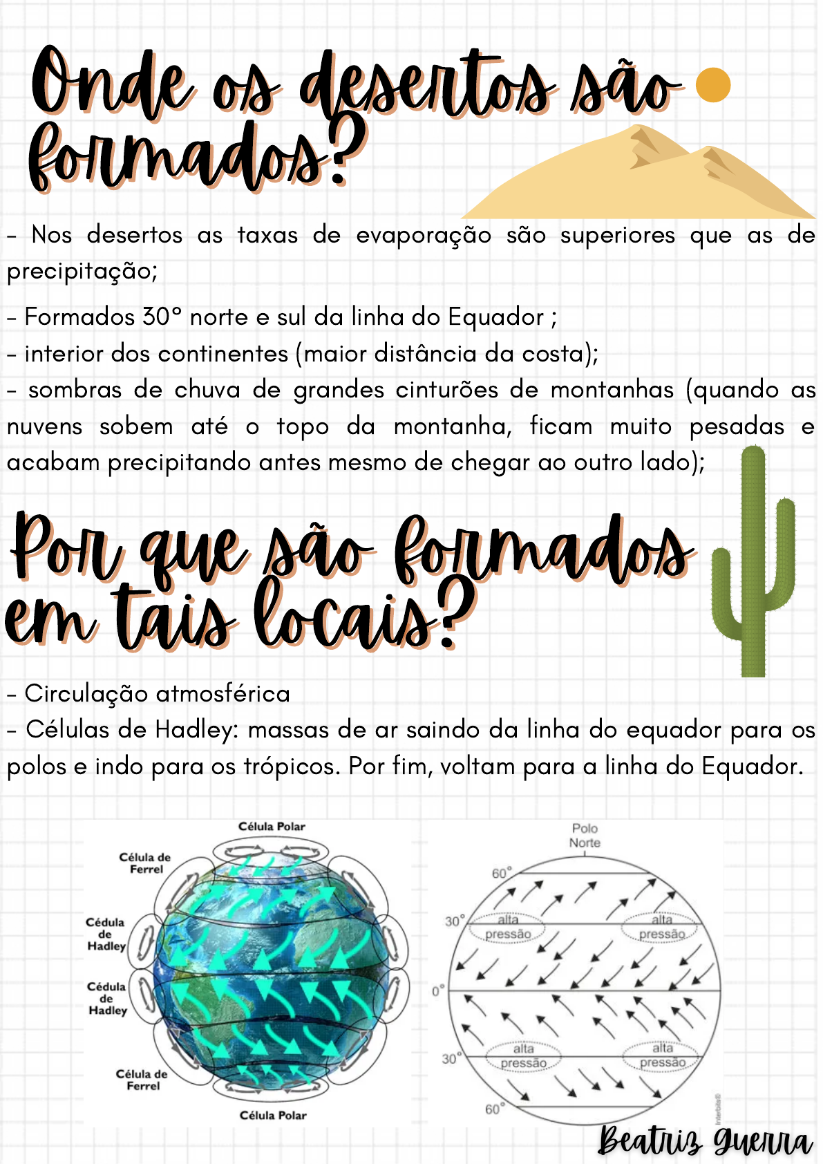 - Circulação atmosférica - Células de Hadley: massas de ar saindo da linha do equador para os polos e indo para os trópicos. Por fim, voltam para a linha do Equador. Por que são formadosPor que são formados em tais locais?em tais locais? Onde os desertos sãoOnde os desertos são formados?formados? - Nos desertos as taxas de evaporação são superiores que as de precipitação; - Formados 30° norte e sul da linha do Equador ; - interior dos continentes (maior distância da costa); - sombras de chuva de grandes cinturões de montanhas (quando as nuvens sobem até o topo da montanha, ficam muito pesadas e acabam precipitando antes mesmo de chegar ao outro lado);