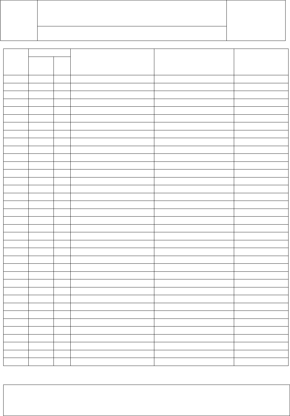 Nome do estabelecimento Nome do registro: REGISTRO DE AFERIÇÃO DO CLORO RESIDUAL LIVRE (CRL) E pH DO RESERVATÓRIO DE ÁGUA Logo do estabelecimento Responsável: DATA RESULTADO Não conformidade(s) observada(s) ação corretiva ASSINATURA CLORO mg/L pH PREENCHIMENTO DESTA PLANILHA: Está planilha deverá ser preenchida diariamente, os intervalos são os seguintes: Cloro residual livre de 0,2 a 2,0 mg/L e faixa de pH 6,0 a 9,5. A responsabilidade do acompanhamento é do proprietário ou gerente geral.