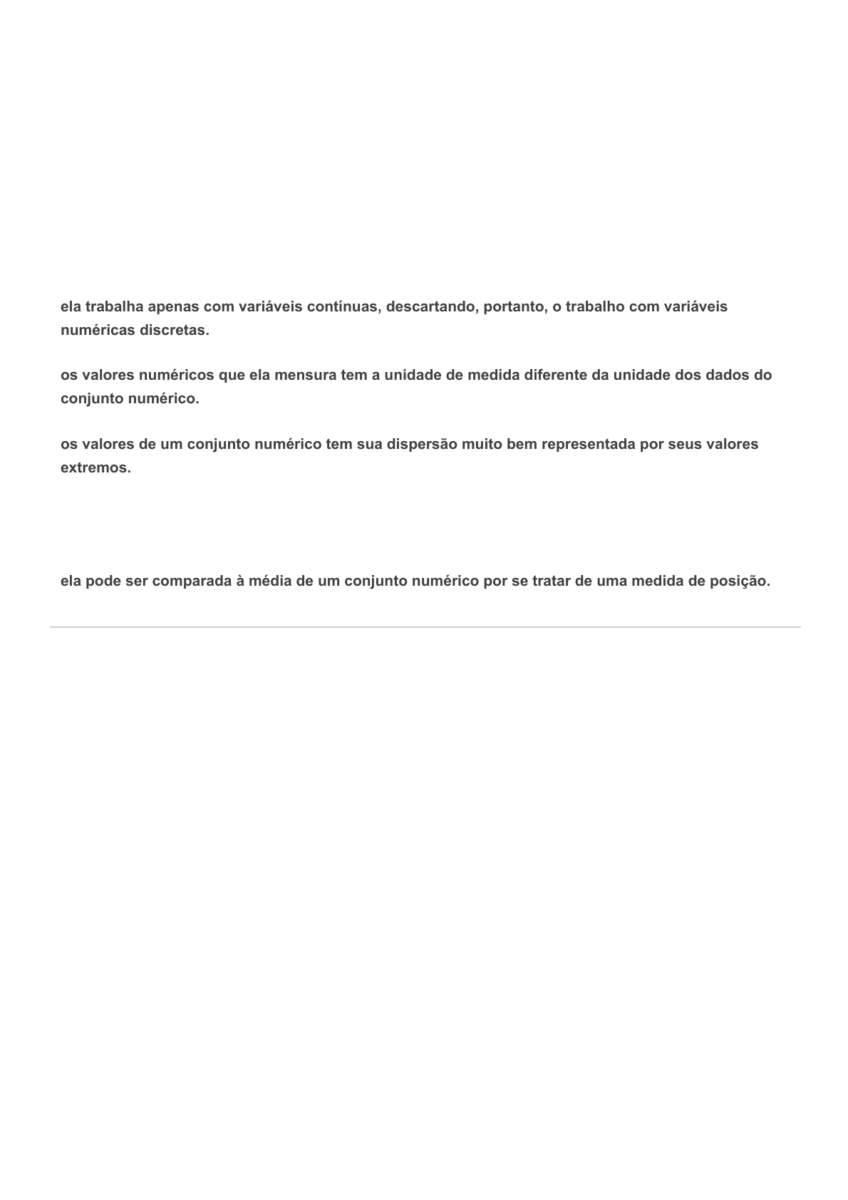 30/09/2021 21:48 Comentários https://sereduc.blackboard.com/ultra/courses/_69754_1/outline/assessment/_4213795_1/overview/attempt/_14594594_1/review/inline-feedback?… 1/8 Ocultar opções de resposta Pergunta 1 -- /1 A amplitude mensura a dispersão dos dados de uma maneira simples e rápida de calcular. Porém, ela possui algumas limitações que acabam tornando essa medida de dispersão muito imprecisa em muitos casos. Por conta disso, ela não é muito utilizada como parâmetro comparativo. Considerando essas informações e o conteúdo estudado sobre amplitude total, pode-se dizer que o principal motivo da amplitude ser imprecisa em muitos casos é porque: ela trabalha apenas com variáveis contínuas, descartando, portanto, o trabalho com variáveis numéricas discretas. os valores numéricos que ela mensura tem a unidade de medida diferente da unidade dos dados do conjunto numérico. os valores de um conjunto numérico tem sua dispersão muito bem representada por seus valores extremos. Resposta correta a amplitude total é calculada apenas com base nos valores extremos do conjunto, desconsiderando a variação que ocorre no meio do conjunto de dados. ela pode ser comparada à média de um conjunto numérico por se tratar de uma medida de posição. Pergunta 2 -- /1 Os dados de uma coleta de dados podem ser representados de diversas maneiras. As mais simples são as representações tabulares. Mas, mesmo nessas representações, existem diferenças de complexidade de apresentação. A partir disso, analise as tabelas a seguir: Tabela 1. Altura dos indivíduos em centímetros. Tabela 2. Altura dos indivíduos em centímetros. Imag 01- Probabilidade e Estatitica - Questão 17.PNG Imag 02- Probabilidade e Estatitica - Questão 17(1).PNG 30/09/2021 21:48 Comentários https://sereduc.blackboard.com/ultra/courses/_69754_1/outline/assessment/_4213795_1/overview/attempt/_14594594_1/review/inline-feedback?… 2/8 Ocultar opções de resposta Ocultar opções de resposta Considerando essas informações e o conteúdo estudado sobre tabelas, pode-se dizer que as duas representações tabulares se diferem porque: existem valores diferentes em ambas as tabelas, o que implica em um conjunto de dados diferentes. a amostragem que ocorreu na primeira tabela se diferencia da amostragem que ocorreu na segunda tabela. a segunda tabela possui mais elementos do que a primeira tabela, o que modifica todo o conjunto de dados. Resposta correta a primeira traz os dados de maneira desordenada, enquanto a segunda apresenta os dados conforme uma ordenação. a coleta de dados foi efetuada segundo uma ordem diferente, priorizando diferentes indivíduos. Pergunta 3 -- /1 Alguns alunos de uma disciplina de estatística resolvem fazer um experimento com um dado de seis faces. Eles jogam repetidas vezes o objeto e anotam todos os números que são apresentados com a face do dado para cima. O resultado desse experimento é apresentado pelo conjunto numérico R a seguir: R: 1,1,1,1,1 Considerando essas informações e o conteúdo estudado acerca de medidas de posição e dispersão, afirma-se que a dispersão dos dados é nula porque: a moda dos dados é a mesma que a média. Resposta corretao desvio padrão dos dados é nulo. a mediana é a mesma que a média. a amostragem efetuada pelos alunos foi equivocada. a amplitude dos dados é um número positivo. 30/09/2021 21:48 Comentários https://sereduc.blackboard.com/ultra/courses/_69754_1/outline/assessment/_4213795_1/overview/attempt/_14594594_1/review/inline-feedback?… 3/8 Ocultar opções de resposta Pergunta 4 -- /1 Variáveis qualitativas referem-se a categorias, características e qualidade, tal como grau de escolaridade, gênero e nacionalidade. Por outro lado, as variáveis quantitativas referem-se a variáveis que podem ser mensuradas por meio de números, tal como a altura e massa de um indivíduo, o número de filhos que ele possui e seu respectivo salário. As variáveis quantitativas podem ser divididas entre variáveis contínuas e variáveis discretas. Considerando essas informações e os estudos sobre variáveis contínuas e discretas, analise as afirmativas a seguir e assinale V para a(s) verdadeira(s) e F para a(s) falsa(s). I. ( ) As variáveis contínuas estão associadas a valores reais (conjunto numérico), em contextos que números decimais são válidos. II. ( ) O número de parentes de um indivíduo é uma variável contínua. III. ( ) A variável marca de tênis é uma variável discreta. IV. ( ) As variáveis discretas estão associadas a valores pertencentes ao conjunto dos números inteiros. Agora, assinale a alternativa que apresenta a sequência correta: Resposta corretaV, F, F, V. F, V, F, V. V, V, F, F. F, F, V, F. V, F, V, V. Pergunta 5 -- /1 As medidas de posição e dispersão são úteis para a descrição da centralidade e variabilidade de um determinado conjunto de dados. Elas são definidas conceitualmente e algebricamente. A expressão a seguir, por exemplo, representa algebricamente uma dessas medidas, considerando um conjunto de dados A: 30/09/2021 21:48 Comentários https://sereduc.blackboard.com/ultra/courses/_69754_1/outline/assessment/_4213795_1/overview/attempt/_14594594_1/review/inline-feedback?… 4/8 Ocultar opções de resposta Ocultar opções de resposta Considerando essas informações e o conteúdo estudado sobre medidas de dispersão e posição, pode-se dizer que essa medida representa a concentração dos dados porque: Imag - Probabilidade e Estatitica - Questão 18.PNG o somatório presente nessa expressão indica que a medida considera todos os dados internos do conjunto numérico. Resposta correta trata-se da média, medida que leva em conta os valores de todo o conjunto de dados. trata-se da mediana, medida que mensura a concentração dos dados levando em conta o número de elementos n. essa representação mensura a concentração dos dados com base na soma de todos os valores extremos do conjunto