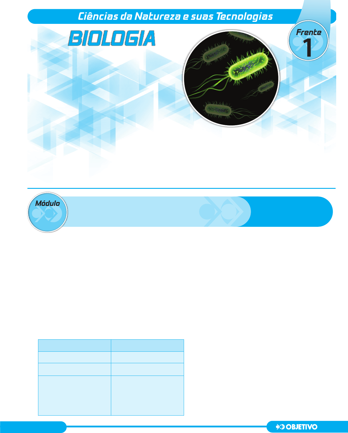 1BIOLOGIA Atualmente, as sequências de bases nitrogenadas dos ácidos nucleicos podem fornecer dados muito importantes, nas relações evolutivas (parentescos) entre os seres vivos. Assim, a análise das sequências do RNA ribossômico permitiu dividir o mundo vivo em três grandes grupos conhecidos por domínios, a saber: Bacteria, Archaea e Eukarya. Essa classificação foi proposta por Carl Woese em seu trabalho realizado em 1977. O domínio Bacteria é constituído pelas chamadas “bactérias verdadeiras”, formando os seres pro cariontes, nos quais observam-se as células primitivas chamadas procarióticas ou procariotas. Archaea é um domínio de bactérias, também procariontes e com uma capacidade de viver em ambientes inóspitos com grandes salinidades, altas temperaturas, ácidos e outros. O domínio Eukarya inclui todos os demais seres vivos, isto é, protistas (protoctistas), fungos, vegetais e animais. São chamados eucariontes e possuem as células eucarióticas ou eucariotas. Esses três domínios são divididos em grupos menores, os Reinos, conforme o quadro a seguir. Alguns autores reúnem eubactéria e arqueobactéria em um único reino denominado Monera. A classificação em 5 Reinos foi proposta por WHITAKKER em 1969. O esquema a seguir representa uma possível origem evolutiva dos seres vivos a partir de um ancestral comum. Domínio Reino Bacteria Eubacteria Archaea Archaeabacteria Eukarya Protoctista (Protista) Fungi Plantae (Vegetalia) Animalia 1 Palavras-chave:Os seres vivos e os tipos de células • Procariota • Eucariota Estruturas e funções celulares Módulos 1 – Os seres vivos e os tipos de células 2 – Evolução da célula eucariota vegetal 3 – Célula vegetal – parede celular, plastos e vacúolos 4 – Os tecidos vegetais – meristemas 5 – Os tecidos adultos vegetais 6 e 7 – A folha: órgão de fotossíntese – I e II 8 e 9 – A química da fotossíntese – I e II 10 – Fotossíntese e a quimiossíntese em bactérias 11 – A influência da temperatura e dióxido de carbono 12 – A influência da luz na fotossíntese 13 – A respiração aeróbia – I 14 – A respiração aeróbia – II 15 – A respiração anaeróbia 16 – Osmose na célula vegetal C1_2A_TEO-EXER_VERMELHO_Biologia_Clayton_2021 17/11/2020 13:10 Página 1 2 BIOLOGIA A célula procariótica de bactéria heterotrófica As bactérias heterótrofas são aquelas incapazes de pro duzirem seu próprio alimento, vivendo às expensas de matéria orgânica pré-fabricada. Quando se nutrem de ma téria orgânica morta, são conhecidas por decomposi to ras ou sapróvoras e, se utilizam matéria viva, são parasitas. A célula é minúscula, medindo entre 0,5 µm e 5 µm, e extremamente simples, uma vez que apresentam a parede celular que envolve e protege a membrana plasmática e o citosol (citoplasma). Este possui apenas um tipo de organoide, o ribossomo, no qual ocorre a síntese de proteínas. Apresenta um único cromossomo constituído por uma molécula de DNA unida pelas extremi dades (DNA circular), ocupando a região da célula conhe cida por nucleoide. A célula bacteriana não possui núcleo verdadeiro, uma vez que não apresenta a membrana que envolve o material genético (envoltório nuclear ou carioteca). Fig. 2 – Estrutura de uma célula procariota típica. A célula procariótica de bactéria autótrofa (cianobactéria) As cianobactérias são produtoras de seu próprio alimento por meio do fenômeno da fotossíntese, se gun do a equação: Vivem na água-doce, no mar e em ambientes terres tres úmidos. São importantes na ecologia porque par ticipam dos ciclos do carbono e do nitrogênio (fixadoras do N2 na atmosfera). Suas células apresentam: parede celular, membrana plasmática, citosol com ribossomos e nucleoide. Dentro do citosol, encontram-se membranas empilhadas, for man do os tilacoides. Estes contêm vários tipos de pig men tos, tais como: clorofila A, ficocianina (pigmento azul) e ficoeritrina (pigmento vermelho), além dos carote noides (amarelos e alaranjados). As cianobactérias do passado deram origem aos clo ro plastos das células eucarióticas (vegetais e algas). Luz 6H2O + 6CO2 ⎯⎯⎯→ C6H12O6 + 6O2 Fig. 1 – Origem evolutiva dos seres vivos C1_2A_TEO-EXER_VERMELHO_Biologia_Clayton_2021 17/11/2020 13:10 Página 2 3BIOLOGIA Fig. 3 – Estrutura da célula procariota de cianobactéria. Analise as características dos três domínios na tabela a seguir: Saiba mais a respeitos das arqueobactérias O termo arqueobactéria origina-se do grego, signifi cando “antigo”, “velho” ou “arcaico”. Elas têm capaci dade de viver em ambientes extremos e são divididas em: halófilas extremas, suportando grandes salini da des, como no Mar Morto, no Great Salt Lake e nas Salinas; termófilas extremas, vivendo em temperaturas superiores a 100°C; e metanogênicas, sobrevivendo em ambientes anaeróbios, como pântanos, e no intes tino dos ruminantes (gado bovino), gerando o gás me tano. Algumas crescem em ambientes ácidos. Atualmente são encontradas em ambientes menos hostis, no solo, nos oceanos e como os principais compo - nentes do picoplâncton (organismos do plâncton com dimensões menores que 1 µm). Diferem das bactérias normais, especialmente pela natureza química da parede celular. Enquanto as bactérias do domínio Bactéria apresentam peptídoglicano na parede celular, as Arqueas não apresentem esse composto. Observação: Os vírus não estão incluídos na classificação porque são acelulares, isto é, desprovidos de células. Característica Bacteria Archaea Eukarya Tamanho celular 0,1-5 µm 0,1-5 µm 10-100 µm Célula Procariótica Procariótica Eucariótica Envoltório nuclear (carioteca) Ausente Ausente Presente DNA Circular Circular Linear Organoides citoplasmáticos Apenas ribossomos Apenas ribossomos Ribossomos e todos os outros tipos Clorofila Presente (alguns grupos) Ausente Presente em vegetais e algas C1_2
