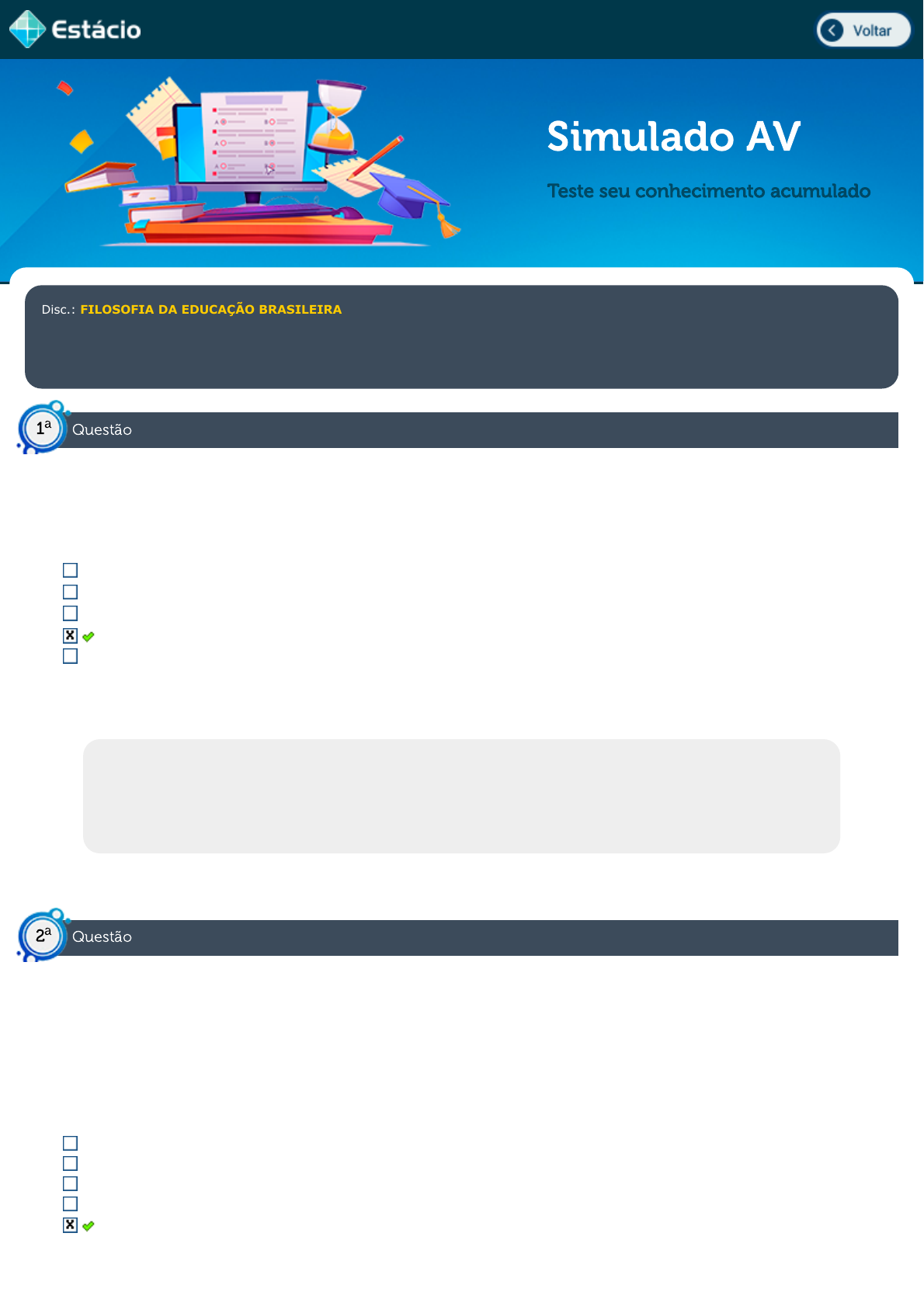 Simulado AV Teste seu conhecimento acumulado Disc.: FILOSOFIA DA EDUCAÇÃO BRASILEIRA Aluno(a): MARCELO CLEYTON DE CARVALHO 202108199036 Acertos: 10,0 de 10,0 09/09/2021 Acerto: 1,0 / 1,0 Trata-se de um conhecimento fragmentário, difuso, assistemático. As características desse tipo de saber compreendem a não-sistematicidade, razão pela qual ele não é produzido com base em procedimentos metodológicos, feitos para conduzir a relação sujeito-objeto. O que resulta dessa relação com o mundo é um saber que muitos chamam saber empírico ou vulgar. O trecho acima descreve que tipo de conhecimento? Conhecimento mítico Conhecimento filosófico conhecimento científico senso comum conhecimento artístico Respondido em 09/09/2021 20:04:02 Explicação: O senso comum é um um conhecimento fragmentário, difuso, assistemático. As características desse tipo de saber compreendem a não-sistematicidade, razão pela qual ele não é produzido com base em procedimentos metodológicos, feitos para conduzir a relação sujeito-objeto. O que resulta dessa relação com o mundo é um saber que muitos chamam saber empírico ou vulgar. Acerto: 1,0 / 1,0 Sobre pluralidade cultural e etnocentrismo pode-se dizer que: 1. etnocentrismo indica a aceitação de culturas de massa e pluralidade cultural se refere a aceitação dos mais diversos tipos de cultura. 2. são formas de conceber e se relacionar com o produto das transformações criativas produzidas pelo homem. 3. o etnocentrismo gera preconceito e intolerância quanto aos aspectos culturais. 4. a não aceitação das diferenças culturais não está mais presente na história atual. Apenas a opção 2 está correta Apenas a opção 1 está correta Apenas a opção 4 está correta Todas as opções estão corretas Apenas a opção 3 está correta Respondido em 18/09/2021 19:35:23 Questão1 a Questão2 a https://simulado.estacio.br/alunos/inicio.asp javascript:voltar(); Gabarito Comentado Acerto: 1,0 / 1,0 Por se tratar de uma reflexão sobre a educação, a tarefa da Filosofia da Educação tem natureza tríplice: reflexão antropológica, epistemológica e axiológica. Nesse sentido a (as) proposição (ões) que NÃO pertence (m) especificamente ao âmbito da Filosofia da Educação. Assinale a alternativa correta: I Investiga a concepção de ser humano, ou seja, a partir do que o ser humano é, reflete sobre aquilo que se pensa que ele deva ser. II Estuda o conhecimento científico do ponto de vista crítico, isto é, do valor de suas hipóteses, do seu método, das conclusões alcançadas. III Estuda e descobre, por meio de experimentos, regularidades nos fenômenos naturais observados, estabelecendo leis gerais e teorias. IV Reflete sobre a natureza e as características do valor, fazendo o levantamento do valor que os homens atribuem às coisas. Somente a I e IV não pertencem Somente a II não pertence Somente a I não pertence Somente a IV não pertence Somente a III não pertence Respondido em 19/09/2021 19:38:04 Acerto: 1,0 / 1,0 "De acordo com o marxismo, os dois níveis de realidades existentes, que decorrem da relação do homem com a natureza e com os demais seres humanas se explicam através dos conceitos de infra-estrutura econômica e superstrutura econômica" (Aula 4). Escolha a alternativa CORRETA. QUESTÃO: Em relação à Infra-estrutura podemos dizer que é: A base jurídico-política A estrutura dos meios de comunicação A base econômica a base educacional A estrutura religiosa Respondido em 19/09/2021 19:36:57 Gabarito Comentado Acerto: 1,0 / 1,0 A Educação e a Sociedade andam sempre em constante compasso. O professor de Filosofia tem de estar atento a esta realidade. A sociedade vem mudando nos últimos anos e desejando outro tipo de pessoa, tanto no nível de relações com o conhecimento quanto no de relações afetivas, éticas e político-sociais. Neste contexto, a Filosofia: pode ajudar nesse sentido, pois atua no aprimoramento do pensar e oferece oportunidades de aprender a aprender. se torna incapaz de responder às inquietações da sociedade, por trabalhar com utilidades imediatas. não encontra espaço no currículo escolar, por ser um conhecimento dispensável no atual projeto pedagógico. é completamente dispensável, já que a sociedade contemporânea prioriza o conhecimento tecnicista. não dialoga com as necessidades exigidas do pensar, comunicar-se, agir e sentir. Respondido em 09/09/2021 20:13:51 Acerto: 1,0 / 1,0 Questão3 a Questão4 a Questão5 a Questão6 a Os processos revolucionários burgueses nos séculos XVII, XVIII e XIX tiveram participação efetiva dos trabalhadores (servos, vassalos e camponeses) nos frontes de guerra, principalmente na Revolução Francesa que tinha como lema: liberdade, igualdade e fraternidade. Embora os ideais burgueses criticassem severamente os privilégios do clero e da nobreza e pregavam que os benefícios da sociedade capitalista deveriam ser estender a todos, eles acabaram restringindo tais privilégios somente à burguesia capitalista. Diante de tal fato, o proletariado começa a se organizar e a reivindicar seus direitos. A partir dessa afirmação é CORRETO afirmar que é neste contexto (fragmento acima) que vai nascer na Europa do século XVIII e XIX o pensamento do: 4. Nazismo 3. Iluminismo 5. Existencialismo 2. Positivismo 1. Socialismo Utópico Respondido em 19/09/2021 19:39:36 Gabarito Comentado Acerto: 1,0 / 1,0 Para Antônio Joaquim Severino (2000, p. 269-270), falar em Filosofia da Educação implica em reconhecê-la como ¿exercício de um pensar sistemático sobre a educação, ou seja, de um pensar a educação, procurando entendê-la na sua integralidade fenomenal¿. A partir desta citação, como podemos definir o papel da FILOSOFIA na FORMAÇÃO DOCENTE? Possibilitar ao educador uma interpretação crítica da realidade, no momento em que apresenta as questões da realidade suscetíveis de interrogação e investigação permanente. Utiliz